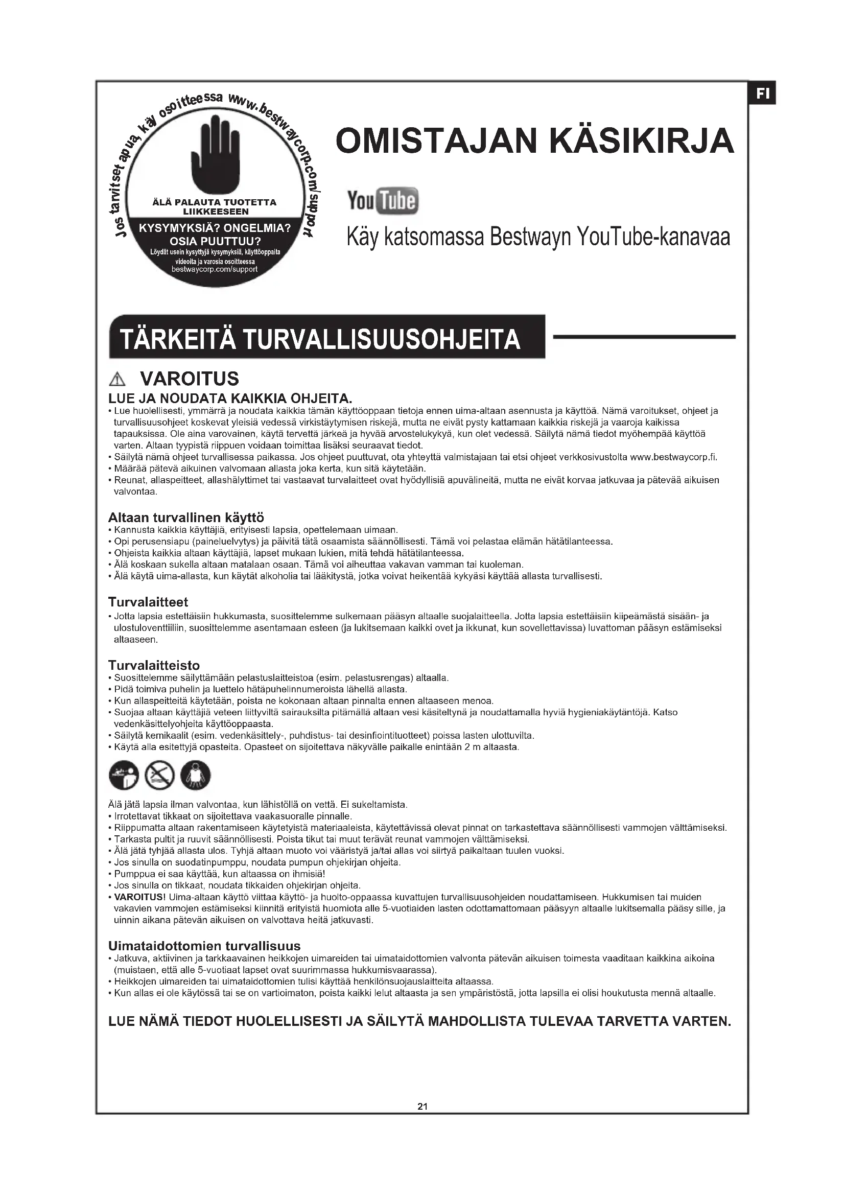 - Säilytä nämä ohjeet turvallisessa paikassa. Jos ohjeet puuttuvat, ota yhteyttä valmistajaan tai etsi ohjeet verkkosivustolta www.bestwaycorp.fi.