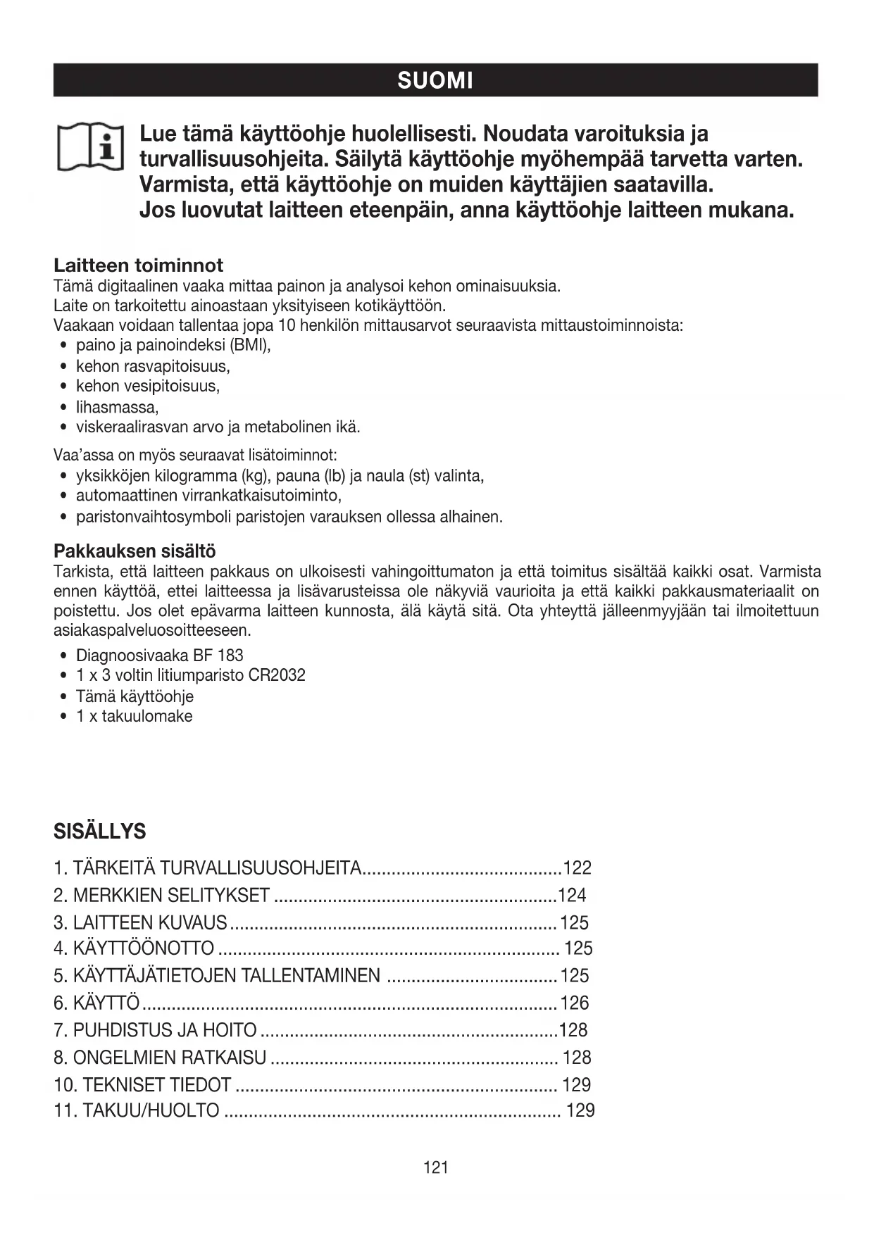Du finner detaljert informasjon om garantien og garantivilkårene i det medfølgende garantiarket. Med forbehold om feil og endringer121 Lue tämä käyttöohje huolellisesti. Noudata varoituksia ja turvallisuusohjeita. Säilytä käyttöohje myöhempää tarvetta varten. Varmista, että käyttöohje on muiden käyttäjien saatavilla. Josluovutat laitteen eteenpäin, anna käyttöohje laitteen mukana. Laitteen toiminnot Tämä digitaalinen vaaka mittaa painon ja analysoi kehon ominaisuuksia. Laite on tarkoitettu ainoastaan yksityiseen kotikäyttöön. Vaakaan voidaan tallentaa jopa 10 henkilön mittausarvot seuraavista mittaustoiminnoista: