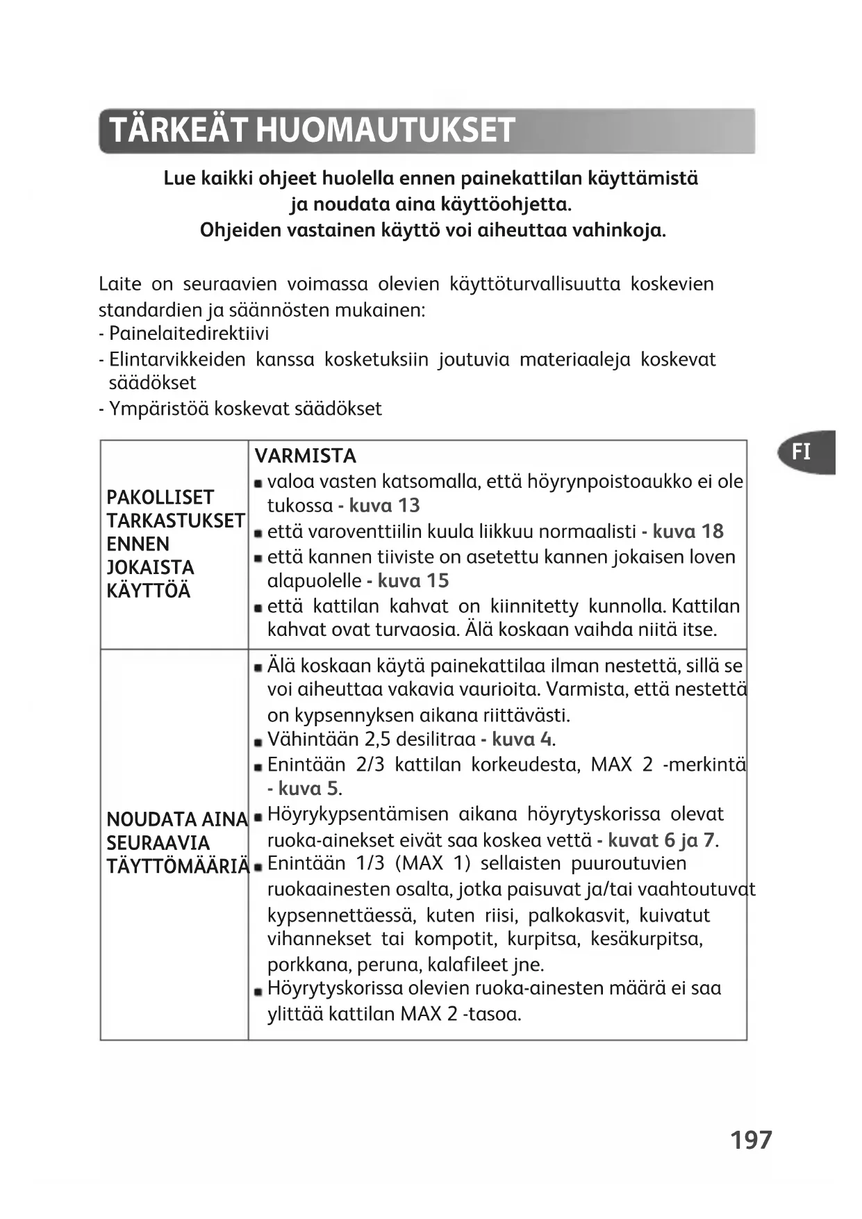 Älä päästä lapsia painekattilan lähelle, kun se on käytössä. Painekattilassa on kypsennyksen aikana korkea paine. Virheellisestä käytöstä voi seurata palovammoja. Varmista ennen käyttöä, että painekattilan kansi on hyvin suljettu. (Katso kappale ”Sulkeminen”). Varmista kypsennyksen aikana, että venttiili suhisee koko ajan. Jos höyryä ei poistu riittävästi, poista tuotteesta paine ja varmista, että nestettä on riittävästi ja että höyrynpoistoaukko ei ole tukossa. Jos höyry ei edelleenkään poistu näiden tarkistusten jälkeen, lisää lämmönlähteen tehoa hieman. Älä kypsennä ruoka-aineksia, jotka voivat tukkia turvalaitteiden aukot: - Puolukat - Ohrasuurimot - Kaurahiutaleet - Hernerouhe - Nuudelit, makaronit, spagetit - Raparperi - Herukat Älä koskaan valmista painekattilassa eläinmaitopohjaisia ruokia. Älä käytä karkeaa suolaa, jos painekattila on valmistettu ruostumattomasta teräksestä. Lisää hieno suola kypsennyksen lopuksi. Näin vältät sellaisten syöpymäkohtien ilmestymisen, jotka voivat pilata painekattilan pohjan. Älä käytä painekattilaa paineistettuun öljyssä paistamiseen. Älä käytä painekattilaa mihinkään muuhun kuin sen alkuperäiseen käyttötarkoitukseen. Älä laita painekattilaa kuumaan uuniin. Älä koskaan laita vuoan päällä olevaa kiinnittämätöntä alumiinifoliota painekattilaan. Älä koskaan laita muovikelmua painekattilaan Alkoholihöyry on helposti syttyvää. Kiehauta alkoholia noin 2 minuuttia ennen kannen sulkemista. Valvo painekattilaa, jos valmistettava ruoka sisältää alkoholia. Käytä käyttöohjeiden mukaisia yhteensopivia lämmönlähteitä.199