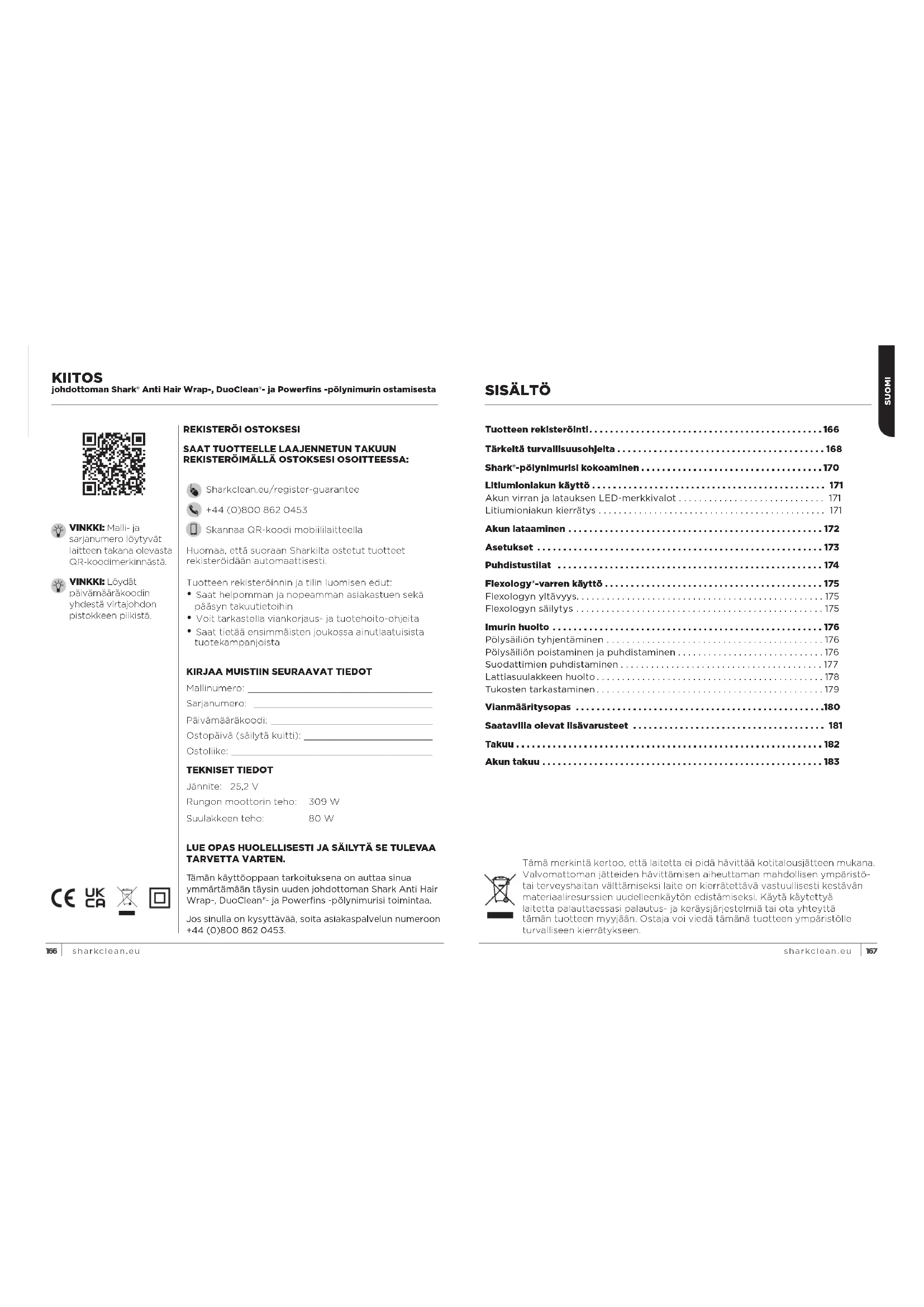 REKISTERÖIMÄLLÄ OSTOKSESI OSOITTEESSA: Sharkclean.eu/register-guarantee +44 (0)800 862 0453 Skannaa QR-koodi mobiililaitteella KIITOS johdottoman Shark® Anti Hair Wrap-, DuoClean®- ja Powerfins -pölynimurin ostamisesta LUE OPAS HUOLELLISESTI JA SÄILYTÄ SE TULEVAA TARVETTA VARTEN Tämän käyttöoppaan tarkoituksena on auttaa sinua ymmärtämään täysin uuden johdottoman Shark Anti Hair Wrap-, DuoClean®- ja Powerfins -pölynimurisi toimintaa Jos sinulla on kysyttävää, soita asiakaspalvelun numeroon +44 (0)800 862 0453 Tuotteen rekisteröinnin ja tilin luomisen edut: