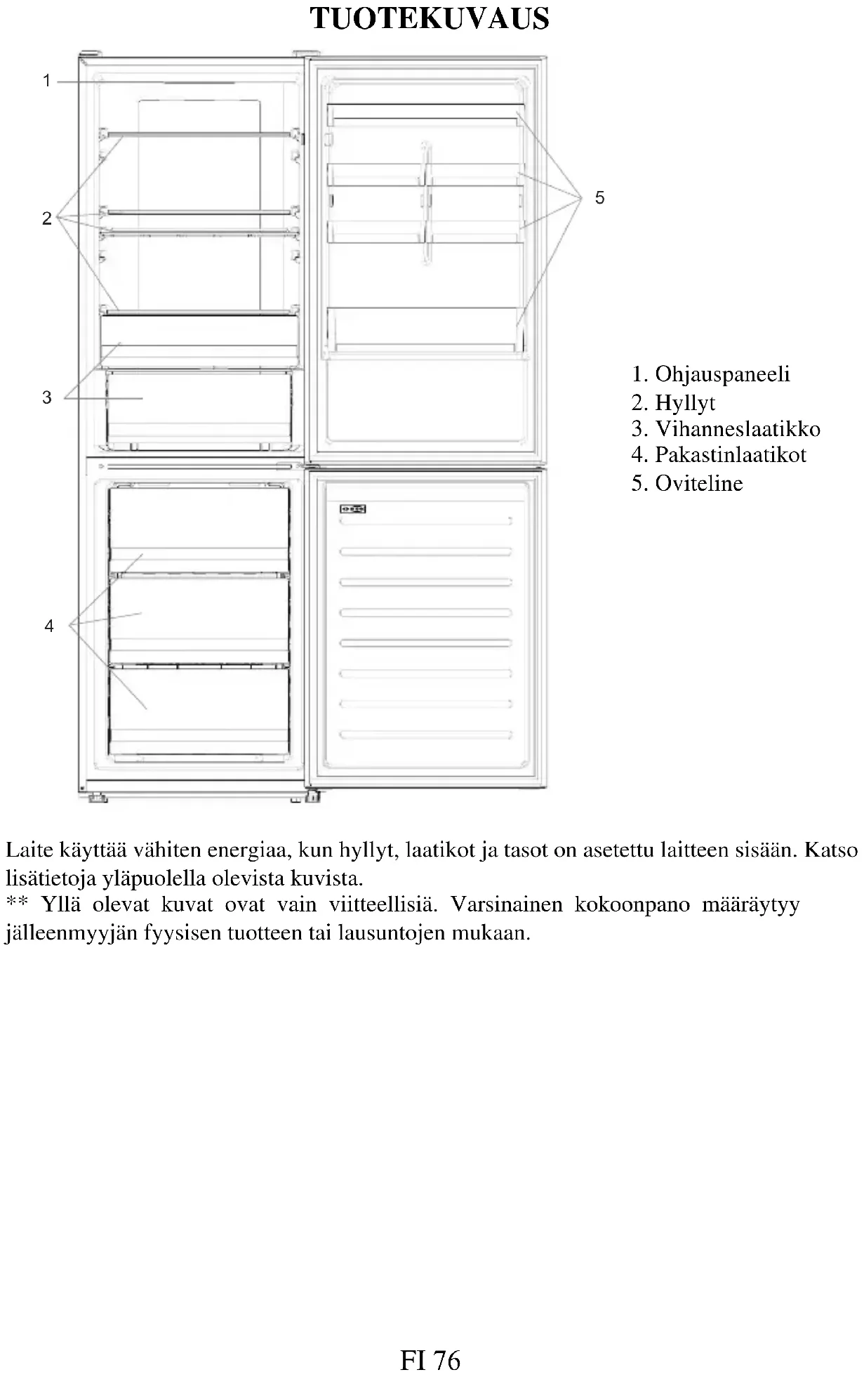 Laite käyttää vähiten energiaa, kun hyllyt, laatikot ja tasot on asetettu laitteen sisään. Katso lisätietoja yläpuolella olevista kuvista. ** Yllä olevat kuvat ovat vain viitteellisiä. Varsinainen kokoonpano määräytyy jälleenmyyjän fyysisen tuotteen tai lausuntojen mukaan.