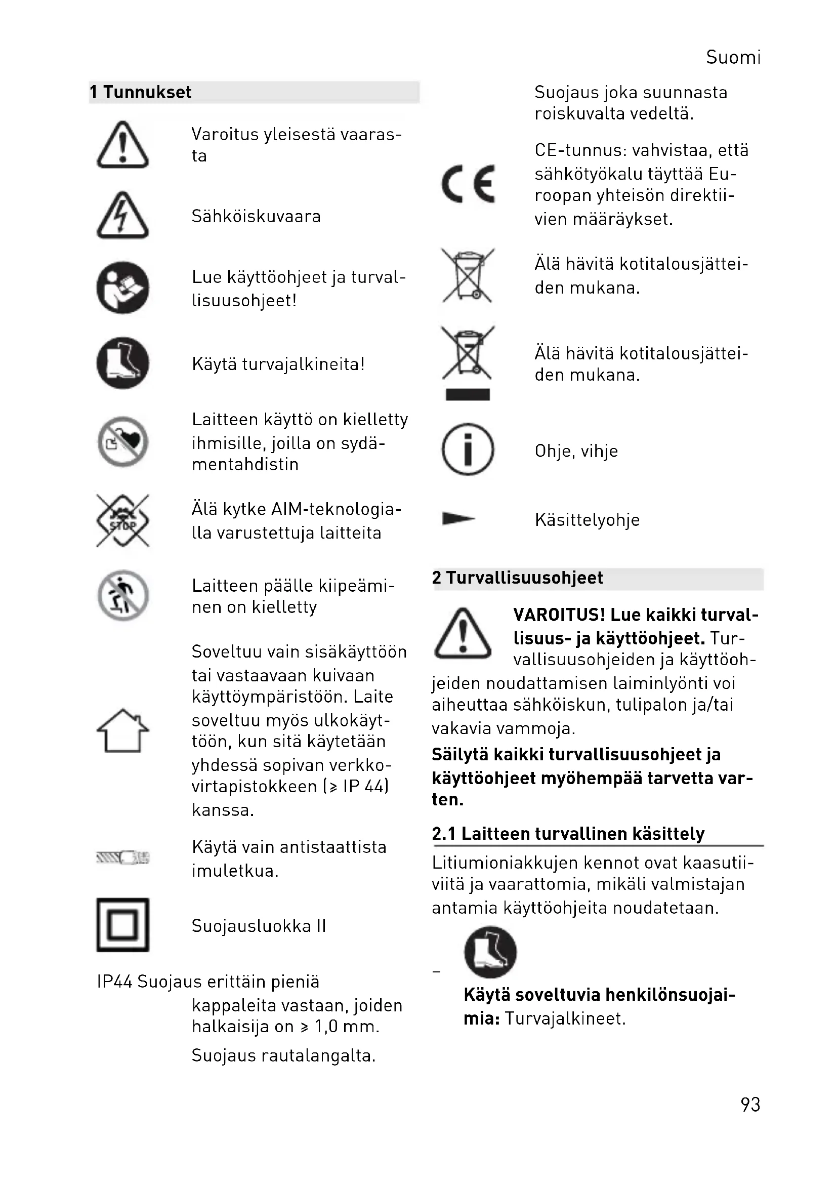 Sähköiskuvaara Lue käyttöohjeet ja turval lisuusohjeet! Käytä turvajalkineita! Laitteen käyttö on kielletty ihmisille, joilla on sydä mentahdistin Älä kytke AIM‑teknologia lla varustettuja laitteita Laitteen päälle kiipeämi nen on kielletty Soveltuu vain sisäkäyttöön tai vastaavaan kuivaan käyttöympäristöön. Laite soveltuu myös ulkokäyt töön, kun sitä käytetään yhdessä sopivan verkko virtapistokkeen ( ≥ IP 44) kanssa. Käytä vain antistaattista imuletkua. Suojausluokka II IP44 Suojaus erittäin pieniä kappaleita vastaan, joiden halkaisija on ≥ 1,0 mm. Suojaus rautalangalta. Suojaus joka suunnasta roiskuvalta vedeltä. CE-tunnus: vahvistaa, että sähkötyökalu täyttää Eu roopan yhteisön direktii vien määräykset. Älä hävitä kotitalousjättei den mukana. Älä hävitä kotitalousjättei den mukana. Ohje, vihje Käsittelyohje 2 Turvallisuusohjeet VAROITUS! Lue kaikki turval lisuus- ja käyttöohjeet. Tur vallisuusohjeiden ja käyttöoh jeiden noudattamisen laiminlyönti voi aiheuttaa sähköiskun, tulipalon ja/tai vakavia vammoja. Säilytä kaikki turvallisuusohjeet ja käyttöohjeet myöhempää tarvetta var ten.