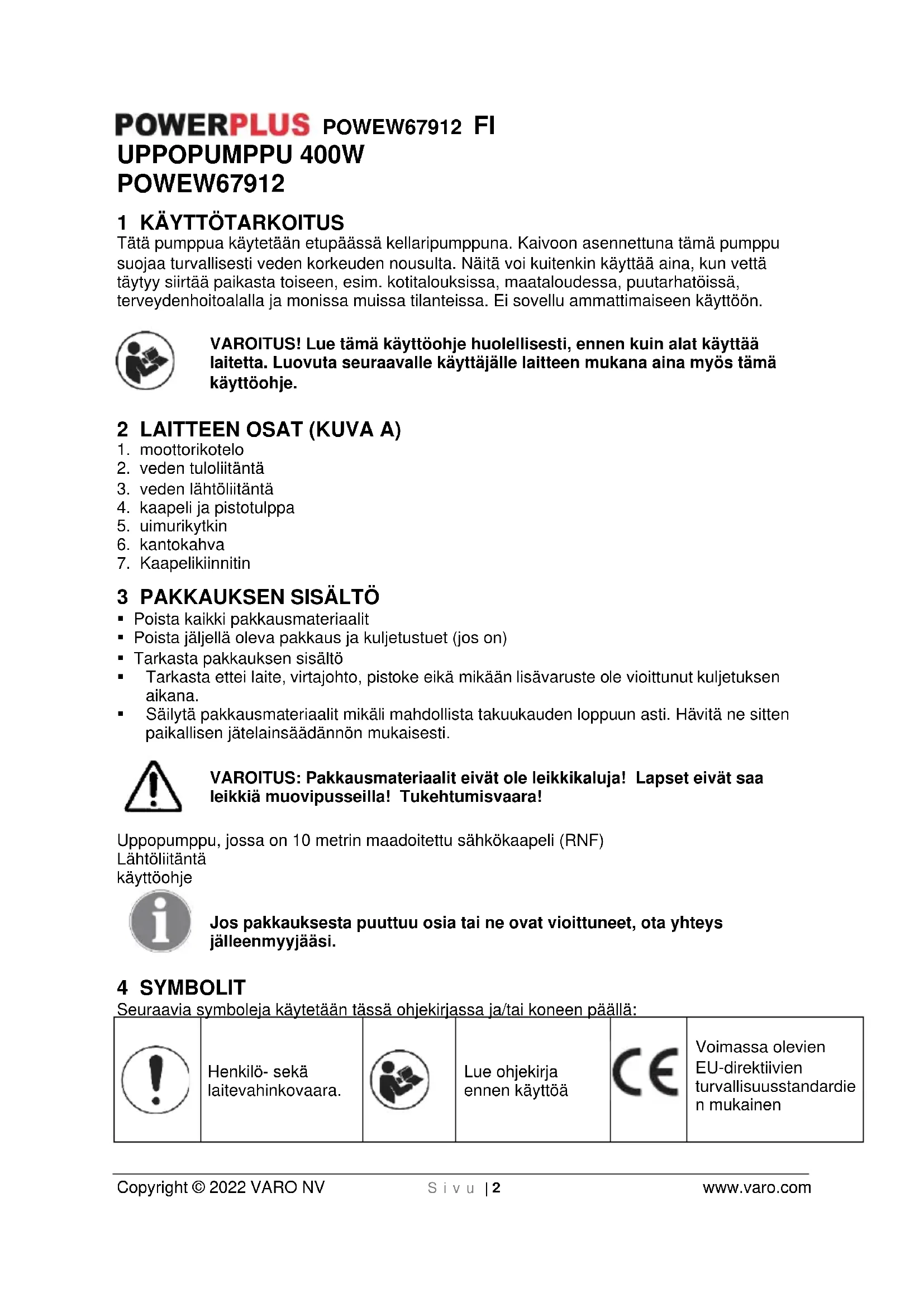 Jos joudut poistamaan laitteen käytöstä pitkäaikaisen käytön jälkeen, älä hävitä sitä tavallisen kotitalousjätteen mukana, vaan huolehdi sen hävittämisestä ympäristöä suojaavalla tavalla. Sähkölaitteiden tuottamia jätteitä ei saa käsitellä tavallisten kotitalousjätteiden tapaan. Vie ne kierrätettäväksi asianmukaiseen paikkaan. Kysy neuvoa kierrätyksestä paikallisilta viranomaisilta tai jälleenmyyjältä.POWEW67912 FI Copyright © 2022 VARO NV S i v u | 8 www.varo.com 16 YHDENMUKAISUUSILMOITUS VARO – Vic. Van Rompuy N.V. - Joseph Van Instraat 9 - BE2500 Lier - BELGIA ilmoittaa, että Tuote: Syvämoottoripumppu Tavaramerkki: POWERplus Malli: POWEW67912 vastaa asianmukaisten Euroopan direktiivien vaatimuksia ja muita voimassa olevia määräyksiä, jotka perustuvat yhdenmukaistettujen eurooppalaisten standardien soveltamiseen. Jokainen koneeseen tehty luvaton muutos mitätöi tämän ilmoituksen. Euroopan yhteisön direktiivit (sekä niiden mahdolliset muutokset allekirjoituspäivään saakka); 2011/65/EU 2014/35/EU 2014/30/EU Eurooppalaiset yhdenmukaistetut standardit (sekä niiden mahdolliset muutokset allekirjoituspäivään saakka); EN60335-1 : 2012 EN60335-2-41: 2003 EN55014-1 : 2017 EN55014-2 : 2015