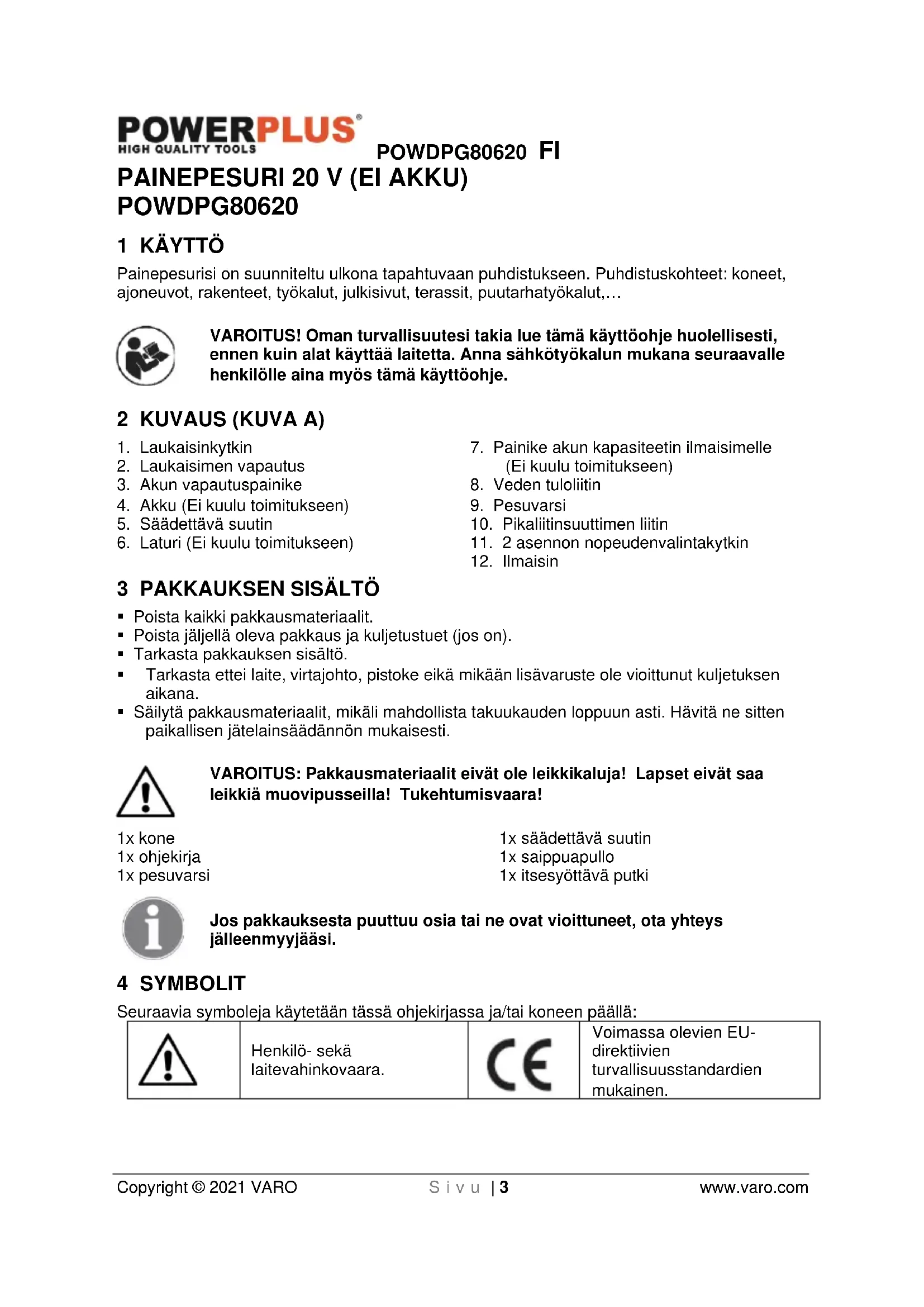 Voimassa olevien EU- direktiivien turvallisuusstandardien mukainen.POWDPG80620 FI Copyright © 2021 VARO S i v u | 4 www.varo.com