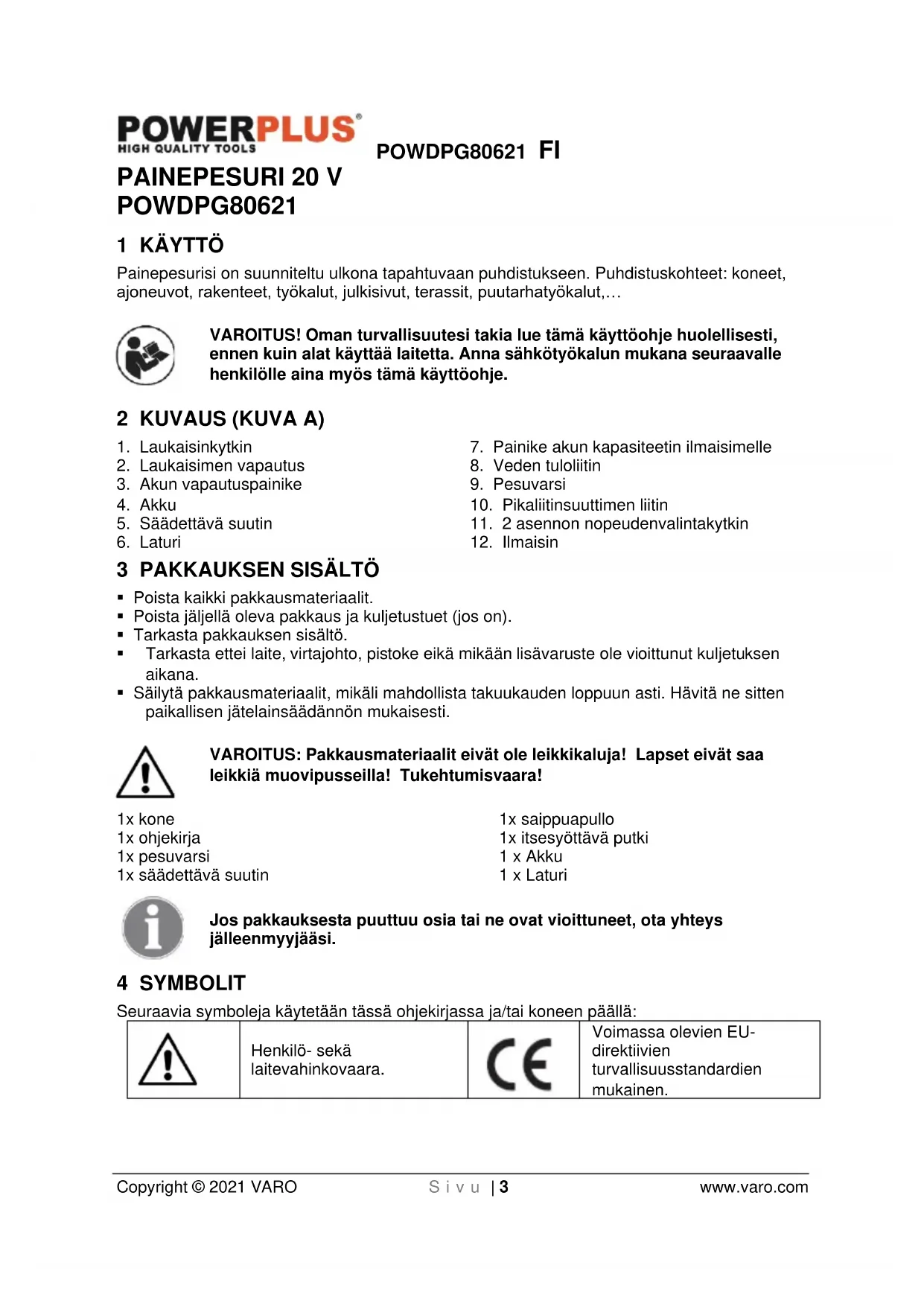 Voimassa olevien EU- direktiivien turvallisuusstandardien mukainen.POWDPG80621 FI Copyright © 2021 VARO S i v u | 4 www.varo.com