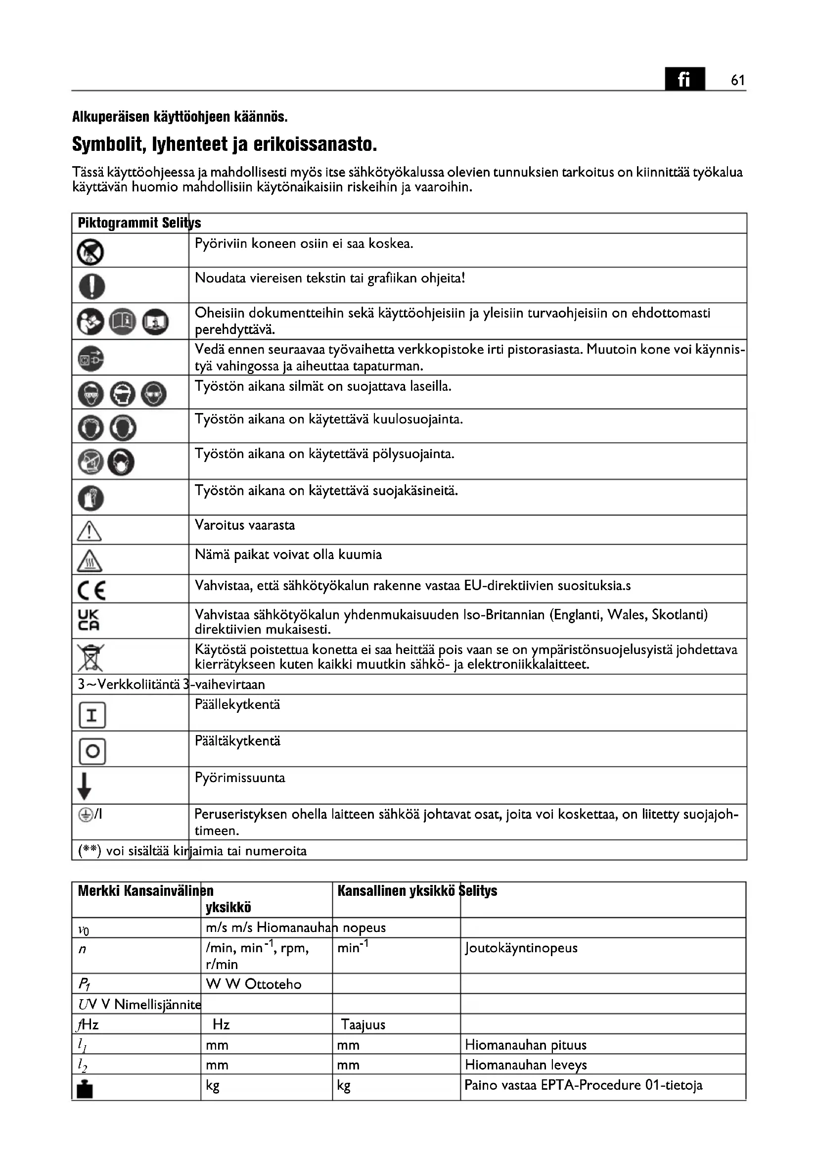 Alkuperäisen käyttöohjeen käännös. Symbolit, lyhenteet ja erikoissanasto. Tässä käyttöohjeessa ja mahdollisesti myös itse sähkötyökalussa olevien tunnuksien tarkoitus on kiinnittää työkalua käyttävän huomio mahdollisiin käytönaikaisiin riskeihin ja vaaroihin. Piktogrammit Selitys Pyöriviin koneen osiin ei saa koskea. Noudata viereisen tekstin tai grafiikan ohjeita! Oheisiin dokumentteihin sekä käyttöohjeisiin ja yleisiin turvaohjeisiin on ehdottomasti perehdyttävä. Vedä ennen seuraavaa työvaihetta verkkopistoke irti pistorasiasta. Muutoin kone voi käynnis- tyä vahingossa ja aiheuttaa tapaturman. Työstön aikana silmät on suojattava laseilla. Työstön aikana on käytettävä kuulosuojainta. Työstön aikana on käytettävä pölysuojainta. Työstön aikana on käytettävä suojakäsineitä. Varoitus vaarasta Nämä paikat voivat olla kuumia Vahvistaa, että sähkötyökalun rakenne vastaa EU-direktiivien suosituksia.s Vahvistaa sähkötyökalun yhdenmukaisuuden Iso-Britannian (Englanti, Wales, Skotlanti) direktiivien mukaisesti. Käytöstä poistettua konetta ei saa heittää pois vaan se on ympäristönsuojelusyistä johdettava kierrätykseen kuten kaikki muutkin sähkö- ja elektroniikkalaitteet. 3 ~ Verkkoliitäntä 3-vaihevirtaan Päällekytkentä Päältäkytkentä Pyörimissuunta /I Peruseristyksen ohella laitteen sähköä johtavat osat, joita voi koskettaa, on liitetty suojajoh- timeen. (**) voi sisältää kirjaimia tai numeroita Merkki Kansainvälinen yksikkö Kansallinen yksikkö Selitys