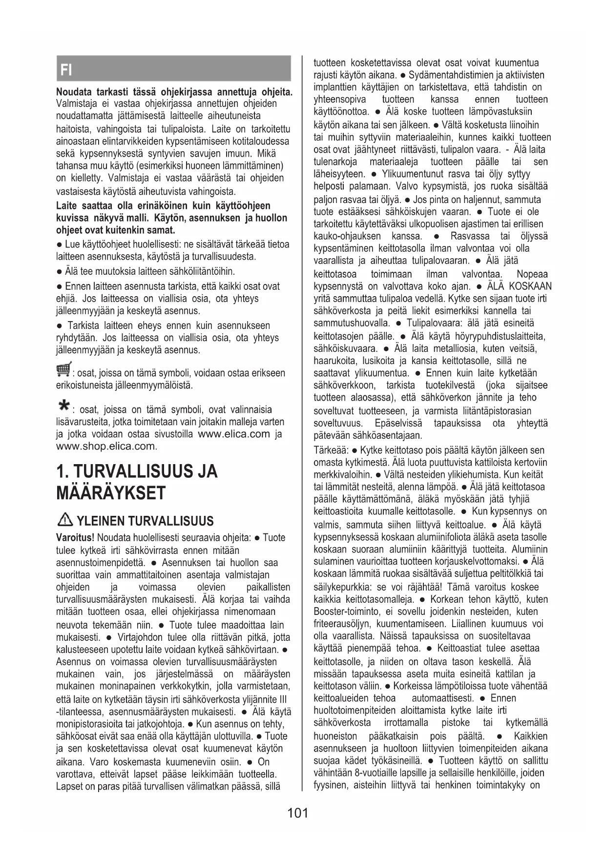 FELSÖKNINGSTABELL Informationskod Beskrivning Möjliga orsaker Lösning Kontrollpanelen stängs av på grund av för hög temperatur De elektroniska komponenternas invändiga temperatur är för hög Vänta tills spishällen svalnat innan den används igen Icke lämpligt kokkärl Magnetinduktionen fungerar inte Ta av kokkärlet Kommunikationsproblem mellan användargränssnitt och induktionsmodul Elektrisk ström når inte modulen; matningskabeln har inte anslutits korrekt eller är defekt Dra ur kontakten till spishällen och kontrollera anslutningen För alla andra felsignaler Kontakta det tekniska servicekontoret och ange felkoden SERVICEKONTOR Innan ni kontaktar servicekontoret 1.Kontrollera att problemet inte går att lösa med hjälp av indikationerna i “Felsökning”. 2.Stäng av och slå på apparaten för att kontrollera om problemet kvarstår. Kontakta närmaste Servicekontor om dessa kontroller inte leder till att felet åtgärdas. 100FI Noudata tarkasti tässä ohjekirjassa annettuja ohjeita. Valmistaja ei vastaa ohjekirjassa annettujen ohjeiden noudattamatta jättämisestä laitteelle aiheutuneista haitoista, vahingoista tai tulipaloista. Laite on tarkoitettu ainoastaan elintarvikkeiden kypsentämiseen kotitaloudessa sekä kypsennyksestä syntyvien savujen imuun. Mikä tahansa muu käyttö (esimerkiksi huoneen lämmittäminen) on kielletty. Valmistaja ei vastaa väärästä tai ohjeiden vastaisesta käytöstä aiheutuvista vahingoista. Laite saattaa olla erinäköinen kuin käyttöohjeen kuvissa näkyvä malli. Käytön, asennuksen ja huollon ohjeet ovat kuitenkin samat. ● Lue käyttöohjeet huolellisesti: ne sisältävät tärkeää tietoa laitteen asennuksesta, käytöstä ja turvallisuudesta. ● Älä tee muutoksia laitteen sähköliitäntöihin. ● Ennen laitteen asennusta tarkista, että kaikki osat ovat ehjiä. Jos laitteessa on viallisia osia, ota yhteys jälleenmyyjään ja keskeytä asennus. ● Tarkista laitteen eheys ennen kuin asennukseen ryhdytään. Jos laitteessa on viallisia osia, ota yhteys jälleenmyyjään ja keskeytä asennus. : osat, joissa on tämä symboli, voidaan ostaa erikseen erikoistuneista jälleenmyymälöistä. : osat, joissa on tämä symboli, ovat valinnaisia lisävarusteita, jotka toimitetaan vain joitakin malleja varten ja jotka voidaan ostaa sivustoilla www.elica.com ja www.shop.elica.com.