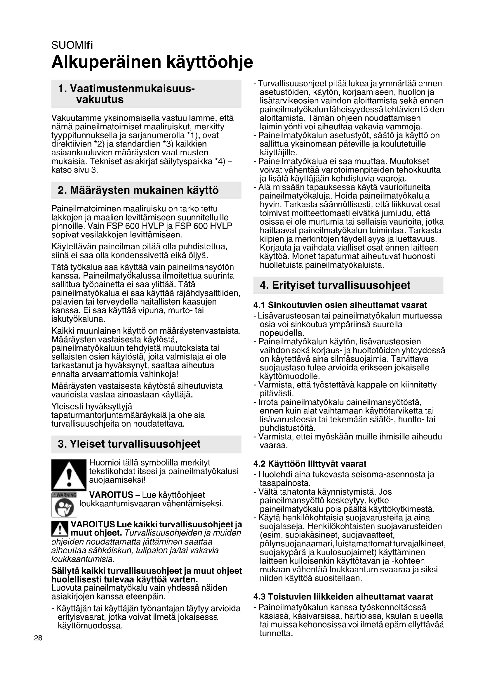 Alkuperäinen käyttöohje Vakuutamme yksinomaisella vastuullamme, että nämä paineilmatoimiset maaliruiskut, merkitty tyyppitunnuksella ja sarjanumerolla *1), ovat direktiivien *2) ja standardien *3) kaikkien asiaankuuluvien määräysten vaatimusten mukaisia. Tekniset asiakirjat säilytyspaikka *4) – katso sivu 3. Paineilmatoiminen maaliruisku on tarkoitettu lakkojen ja maalien levittämiseen suunnitelluille pinnoille. Vain FSP 600 HVLP ja FSP 600 HVLP sopivat vesilakkojen levittämiseen. Käytettävän paineilman pitää olla puhdistettua, siinä ei saa olla kondenssivettä eikä öljyä. Tätä työkalua saa käyttää vain paineilmansyötön kanssa. Paineilmatyökalussa ilmoitettua suurinta sallittua työpainetta ei saa ylittää. Tätä paineilmatyökalua ei saa käyttää räjähdysalttiiden, palavien tai terveydelle haitallisten kaasujen kanssa. Ei saa käyttää vipuna, murto- tai iskutyökaluna. Kaikki muunlainen käyttö on määräystenvastaista. Määräysten vastaisesta käytöstä, paineilmatyökaluun tehdyistä muutoksista tai sellaisten osien käytöstä, joita valmistaja ei ole tarkastanut ja hyväksynyt, saattaa aiheutua ennalta arvaamattomia vahinkoja! Määräysten vastaisesta käytöstä aiheutuvista vaurioista vastaa ainoastaan käyttäjä. Yleisesti hyväksyttyjä tapaturmantorjuntamääräyksiä ja oheisia turvallisuusohjeita on noudatettava. Huomioi tällä symbolilla merkityt tekstikohdat itsesi ja paineilmatyökalusi suojaamiseksi! VAROITUS – Lue käyttöohjeet loukkaantumisvaaran vähentämiseksi. VAROITUS Lue kaikki turvallisuusohjeet ja muut ohjeet. Turvallisuusohjeiden ja muiden ohjeiden noudattamatta jättäminen saattaa aiheuttaa sähköiskun, tulipalon ja/tai vakavia loukkaantumisia. Säilytä kaikki turvallisuusohjeet ja muut ohjeet huolellisesti tulevaa käyttöä varten. Luovuta paineilmatyökalu vain yhdessä näiden asiakirjojen kanssa eteenpäin. - Käyttäjän tai käyttäjän työnantajan täytyy arvioida erityisvaarat, jotka voivat ilmetä jokaisessa käyttömuodossa. - Turvallisuusohjeet pitää lukea ja ymmärtää ennen asetustöiden, käytön, korjaamiseen, huollon ja lisätarvikeosien vaihdon aloittamista sekä ennen paineilmatyökalun läheisyydessä tehtävien töiden aloittamista. Tämän ohjeen noudattamisen laiminlyönti voi aiheuttaa vakavia vammoja. - Paineilmatyökalun asetustyöt, säätö ja käyttö on sallittua yksinomaan päteville ja koulutetuille käyttäjille. - Paineilmatyökalua ei saa muuttaa. Muutokset voivat vähentää varotoimenpiteiden tehokkuutta ja lisätä käyttäjään kohdistuvia vaaroja. - Älä missään tapauksessa käytä vaurioituneita paineilmatyökaluja. Hoida paineilmatyökaluja hyvin. Tarkasta säännöllisesti, että liikkuvat osat toimivat moitteettomasti eivätkä jumiudu, että osissa ei ole murtumia tai sellaisia vaurioita, jotka haittaavat paineilmatyökalun toimintaa. Tarkasta kilpien ja merkintöjen täydellisyys ja luettavuus. Korjauta ja vaihdata vialliset osat ennen laitteen käyttöä. Monet tapaturmat aiheutuvat huonosti huolletuista paineilmatyökaluista.