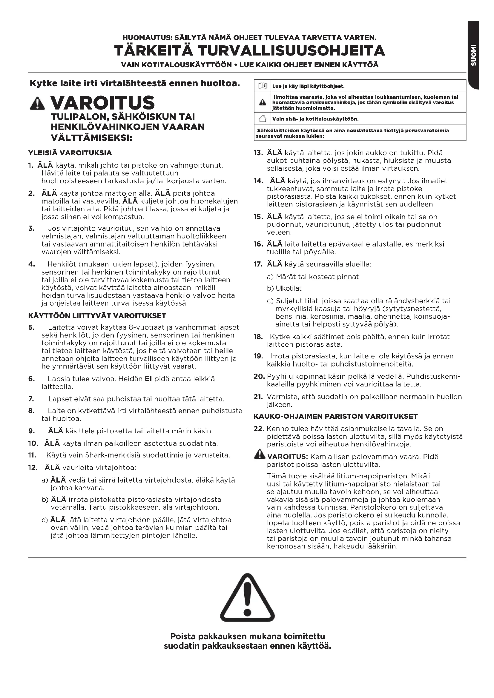 VÄLTTÄMISEKSI: Poista pakkauksen mukana toimitettu suodatin pakkauksestaan ennen käyttöä. Lue ja käy läpi käyttöohjeet. Ilmoittaa vaarasta, joka voi aiheuttaa loukkaantumisen, kuoleman tai huomattavia omaisuusvahinkoja, jos tähän symboliin sisältyvä varoitus jätetään huomioimatta.Vain sisä- ja kotitalouskäyttöön. Sähkölaitteiden käytössä on aina noudatettava tiettyjä perusvarotoimia seuraavat mukaan lukien:SUOMI LAITTEEN KOKOAMINEN Osat: