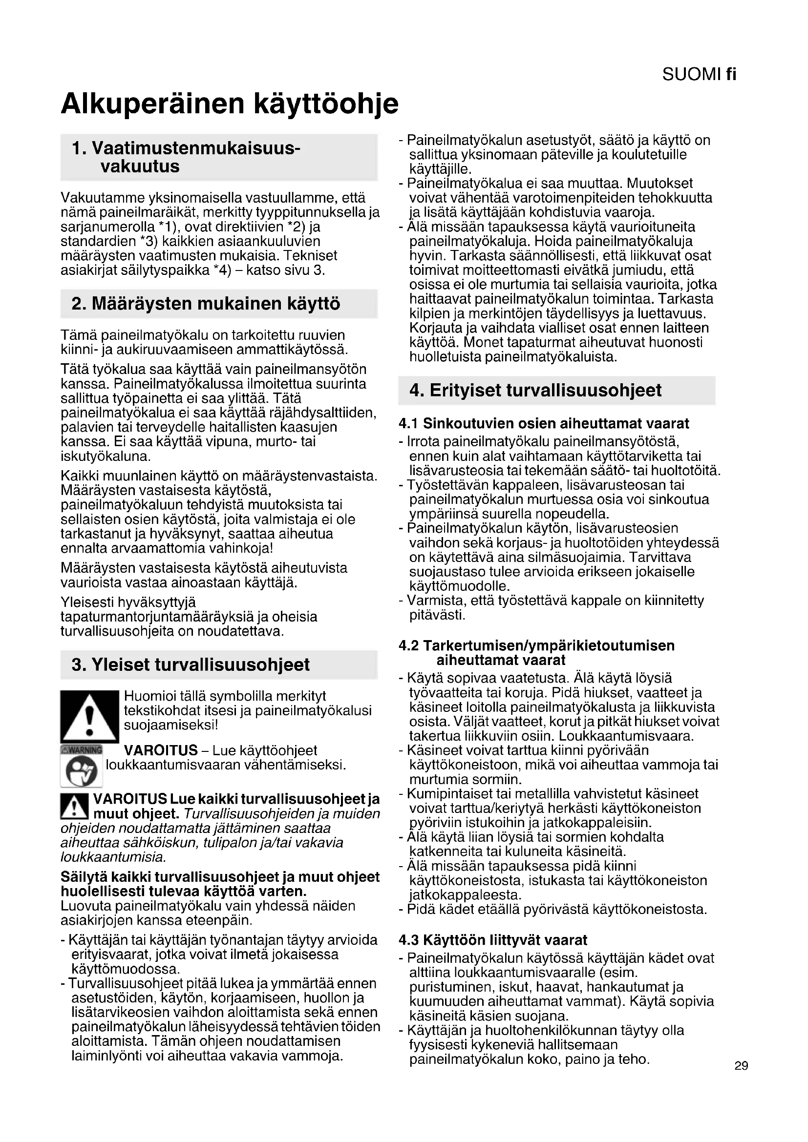 Alkuperäinen käyttöohje Vakuutamme yksinomaisella vastuullamme, että nämä paineilmaräikät, merkitty tyyppitunnuksella ja sarjanumerolla *1), ovat direktiivien *2) ja standardien *3) kaikkien asiaankuuluvien määräysten vaatimusten mukaisia. Tekniset asiakirjat säilytyspaikka *4) – katso sivu 3. Tämä paineilmatyökalu on tarkoitettu ruuvien kiinni- ja aukiruuvaamiseen ammattikäytössä. Tätä työkalua saa käyttää vain paineilmansyötön kanssa. Paineilmatyökalussa ilmoitettua suurinta sallittua työpainetta ei saa ylittää. Tätä paineilmatyökalua ei saa käyttää räjähdysalttiiden, palavien tai terveydelle haitallisten kaasujen kanssa. Ei saa käyttää vipuna, murto- tai iskutyökaluna. Kaikki muunlainen käyttö on määräystenvastaista. Määräysten vastaisesta käytöstä, paineilmatyökaluun tehdyistä muutoksista tai sellaisten osien käytöstä, joita valmistaja ei ole tarkastanut ja hyväksynyt, saattaa aiheutua ennalta arvaamattomia vahinkoja! Määräysten vastaisesta käytöstä aiheutuvista vaurioista vastaa ainoastaan käyttäjä. Yleisesti hyväksyttyjä tapaturmantorjuntamääräyksiä ja oheisia turvallisuusohjeita on noudatettava. Huomioi tällä symbolilla merkityt tekstikohdat itsesi ja paineilmatyökalusi suojaamiseksi! VAROITUS – Lue käyttöohjeet loukkaantumisvaaran vähentämiseksi. VAROITUS Lue kaikki turvallisuusohjeet ja muut ohjeet. Turvallisuusohjeiden ja muiden ohjeiden noudattamatta jättäminen saattaa aiheuttaa sähköiskun, tulipalon ja/tai vakavia loukkaantumisia. Säilytä kaikki turvallisuusohjeet ja muut ohjeet huolellisesti tulevaa käyttöä varten. Luovuta paineilmatyökalu vain yhdessä näiden asiakirjojen kanssa eteenpäin. - Käyttäjän tai käyttäjän työnantajan täytyy arvioida erityisvaarat, jotka voivat ilmetä jokaisessa käyttömuodossa. - Turvallisuusohjeet pitää lukea ja ymmärtää ennen asetustöiden, käytön, korjaamiseen, huollon ja lisätarvikeosien vaihdon aloittamista sekä ennen paineilmatyökalun läheisyydessä tehtävien töiden aloittamista. Tämän ohjeen noudattamisen laiminlyönti voi aiheuttaa vakavia vammoja. - Paineilmatyökalun asetustyöt, säätö ja käyttö on sallittua yksinomaan päteville ja koulutetuille käyttäjille. - Paineilmatyökalua ei saa muuttaa. Muutokset voivat vähentää varotoimenpiteiden tehokkuutta ja lisätä käyttäjään kohdistuvia vaaroja. - Älä missään tapauksessa käytä vaurioituneita paineilmatyökaluja. Hoida paineilmatyökaluja hyvin. Tarkasta säännöllisesti, että liikkuvat osat toimivat moitteettomasti eivätkä jumiudu, että osissa ei ole murtumia tai sellaisia vaurioita, jotka haittaavat paineilmatyökalun toimintaa. Tarkasta kilpien ja merkintöjen täydellisyys ja luettavuus. Korjauta ja vaihdata vialliset osat ennen laitteen käyttöä. Monet tapaturmat aiheutuvat huonosti huolletuista paineilmatyökaluista.