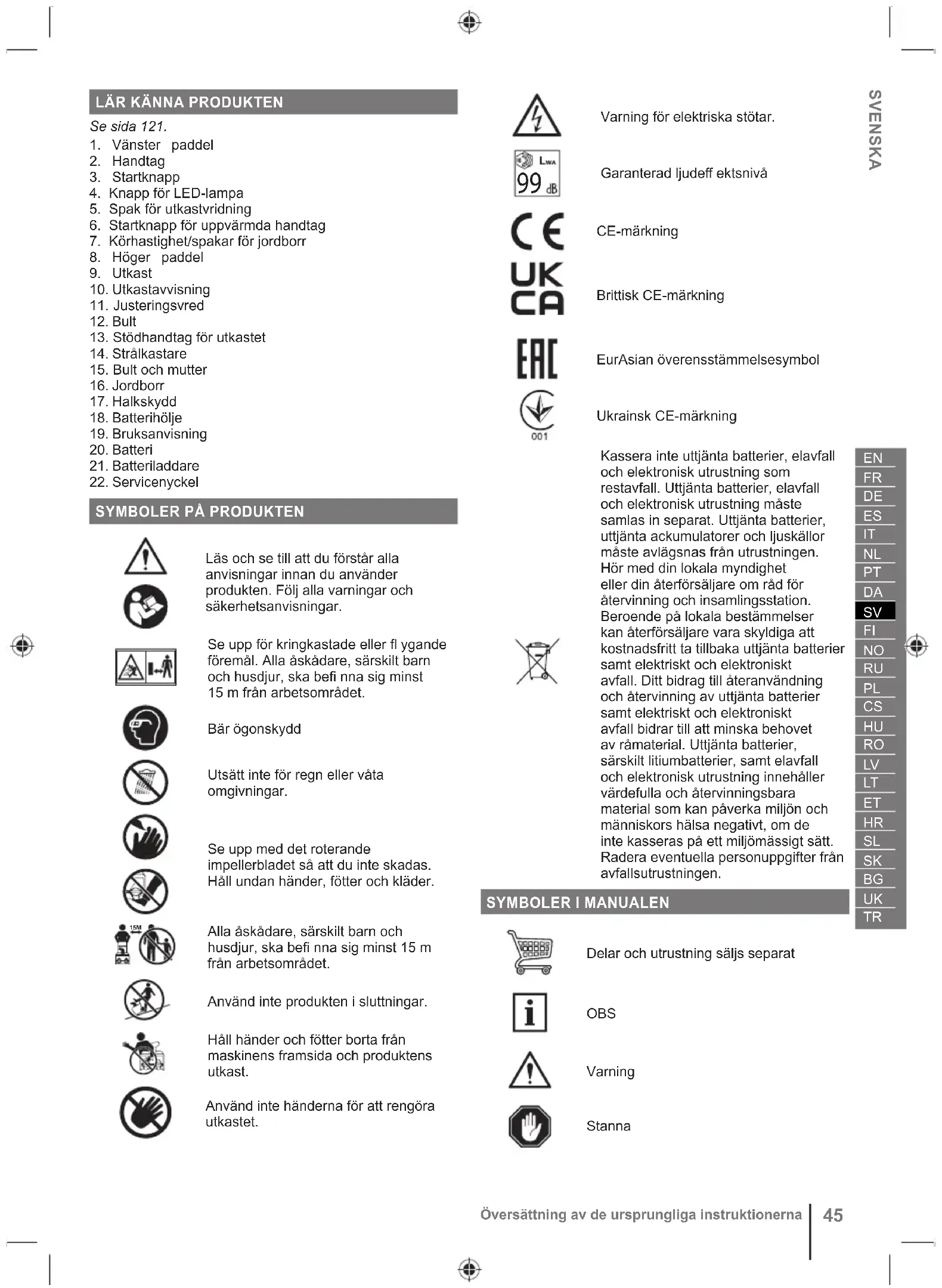 KOULUTUS ■ Kaikki laitteessa ja tässä käyttöoppaassa olevat ohjeet on luettava ja ymmärrettävä ennen laitteen käyttöä ja niitä on noudatettava. Tutustu huolellisesti ohjaimiin ja laitteen oikeanlaiseen käyttöön. Lue, kuinka kuinka laite pysäytetään ja ohjaimet sammutetaan nopeasti. ■ Älä koskaan salli lasten tai ihmisten, joiden fyysiset tai henkiset kyvyt tai aistit ovat heikentyneet, tai näitä ohjeita tuntemattomien käyttää, puhdistaa tai huoltaa tuotetta. Paikalliset säädökset saattavat asettaa rajastuksia käyttäjän iälle. Lapsia on pidettävä asianmukaisesti silmällä, jotta he eivät pääse leikkimään tuotteella. ■ Pidä sivulliset, lapset ja lemmikit 15 metrin etäisyydellä työalueesta. Sammuta laite, jos joku saapuu alueelle. ■ Erityistä huolellisuutta tulee noudattaa liukastumisen tai putoamisen välttämiseksi, varsinkin laitetta taaksepäin käytettäessä. ■ Säädä keräimen kotelon korkeus sellaiseksi, että se ei kerää pinnasta soraa tai sepeliä. ■ Älä koskaan yritä tehdä mitään säätöjä laitteen ollessa käynnissä. ■ Laite on riittävän voimakas leikkaamaan raajoihin ja sinkoamaan esineitä. Turvallisuusohjeiden laiminlyönti voi johtaa vakaviin henkilövammoihin. ■ Muista, että ruohonleikkurin käyttäjä on vastuussa vahingoista ja vaaroista, jotka hän aiheuttaa muille ihmisille ja heidän omaisuuksilleen VALMISTELUT ■ Tarkista huolella alue, jolla laitetta käytetään, ja poista kaikki ovimatot, kelkat, laudat, johdot ja muut vierasesineet. ■ Irrota kaikki kytkimet ja vaihda vapaa-asentoon ennen moottorin käynnistämistä. ■ Kun käytät konetta, käytä aina asianmukaisia talvivaatteita ja liukusuojattuja jalkineita. Älä käytä löysiä vaatteita tai vaatteita, joista riippuu nuoria tai siteitä; ne voivat tarttua liikkuviin osiin. ■ Sido pitkät hiukset hartioiden yläpuolelle, jotta ne eivät pääse tarttumaan liikuviin osiin. ■ Kun käytät, säädät tai korjaat laitetta, pidä aina suojalaseja tai silmäsuojuksia, jotka suojaavat silmiä laitteesta mahdollisesti sinkoavilta vierasesineiltä. ■ Varmista aina ennen käyttöä, että kaikki hallinta- ja turvallisuuslaitteet toimivat asianmukaisesti. Älä käytä laitetta, jos laite ei sammu POIS PÄÄLTÄ -kytkimestä (off). ■ Tarkista aina ennen käyttöä, että kotelo on ehjä ja että suojukset ja kahvat ovat paikallaan ja kunnolla kiinni. KÄYTTÖ ■ Älä käytä tuotetta paikassa, jossa on salamaniskun vaara. ■ Älä laita käsiä tai jalkoja lähelle pyöriviä osia tai niiden alle. Pidä ruohonkeruuaukko aina vapaana. Älä laita aukkoihin mitään vieraita esineitä. ■ Ole erityisen varovainen työskennellessäsi piha- tai kävelytiellä tai niitä ylittäessäsi. Noudata valppautta yhtäkkisten vaaratilanteiden varalta tai kun käytät laitetta yleisten teiden lähellä. ■ Liikkuvien osien kanssa kosketuksiin joutumiseen liittyvän tapaturmavaaran välttämiseksi laite on aina sammutettava ja akkupakkaus poistettava. Varmista, että kaikki liikkuvat osat ovat pysähtyneet täysin: ● törmättyäsi vieraskappaleeseen tarkistamaan tuote vaurioiden varalta ● ennen tukoksen poistamista. ● ennen laitteen luota poistumista ● ennen tuotteen tarkastusta, ylläpitoa ja huoltoa48 Alkuperäisten ohjeiden suomennos ● jos tuote alkaa täristä epänormaalisti (tarkista välittömästi) Tärinä on yleensä varoitus ongelmasta. ■ Käytä tuotetta rinteessä poikittain, ei ylös ja alas. Ole erityisen varovainen vaihtaessasi suuntaa rinteessä. Älä yritä poistaa lunta jyrkistä rinteistä. ■ Älä käytä tuotetta ilman asianmukaisia suojuksia, levyjä ja muita suojalaitteita. ■ Älä koskaan suuntaa heittotorvea ihmistä kohti tai suuntaan, jossa voi olla vahingoittuvia kohteita. Pidä kaikki sivulliset kaukana toiminta-alueelta –erityisesti lapset ja lemmikit. ■ Älä ylikuormita koneen kapasiteettia yrittämällä poistaa lunta liian nopeasti. ■ Laitetta ei saa käyttää suurilla nopeuksilla liukkailla pinnoilla. Kun käytät laitetta taaksepäin, katso taaksesi ja noudata varovaisuutta. ■ Kytke irti keräimen/roottorin tehonlähde, kun laitetta siirretään tai se ei ole käytössä. ■ Käytä ainoastaan alkuperäisiä valmistajan tuottamia varaosia, lisälaitteita ja lisävarusteita. ■ Käytä laitetta vain paikoissa, joissa on hyvä näkyvyys ja valoa riittävästi. Varo jalkojasi ja pidä kahvoista lujalla otteella. Kävele, älä koskaan juokse. ■ Älä koskaan jätä tuotetta millekään pinnalle, paitsi kovalle ja puhtaalle pinnalle, moottorin ollessa käynnissä. Ilmanotto voi imeä soraa, hiekkaa ja muita roskia ja singota ne käyttäjää tai sivullisia kohden, aiheuttaen mahdollisesti vakavia vammoja. ■ Älä koskaan käytä tuotetta lähellä lasirakennelmia, autoja, ikkunoita tai ovia säätämättä ensin lumen poistokulman asianmukaiseksi. ■ Jos laite putoaa, iskeytyy voimakkaasti tai alkaa täristä epänormaalisti, sammuta laite välittömästi ja tarkista se vaurioiden varalta tai selvitä tärinän syy. Valtuutetun huoltopisteen on korjattava tai vaihdettava vioittuneet osat asianmukaisesti. ■ Käytä sumutinta vain lämpötiloissa 0°C – 40°C. ■ Säilytä sumutinta paikassa, jossa ympäristön lämpötila on välillä 0°C – 40°C.