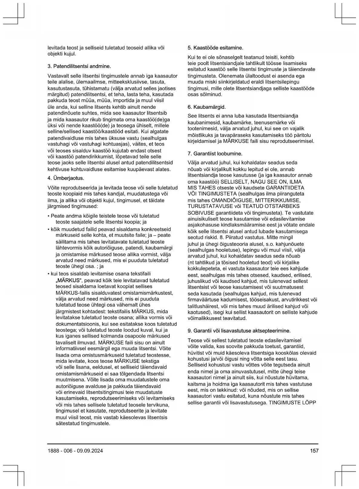 - Teose või sellest tuletatud teoste edasilevitamisel võite valida, kas soovite pakkuda toetust, garantiid, hüvitist või muid käesoleva litsentsiga kooskõlas olevaid kohustusi ja/või õigusi ning võtta selle eest tasu. Selliseid kohustusi vastu võttes võite tegutseda ainult enda nimel ja oma ainuvastutusel, mitte ühegi teise kaasautori nimel ja ainult siis, kui nõustute hüvitama, kaitsma ja hoidma iga kaasautorit mis tahes vastutuse eest, mis on tekkinud: või nõuded, mis on sellise kaasautori vastu esitatud, kuna nõustute mis tahes sellise garantii või lisavastutusega. TINGIMUSTE LÕPP 1888 - 006 - 09.09.2024 157Sisällys Johdanto p. 158
