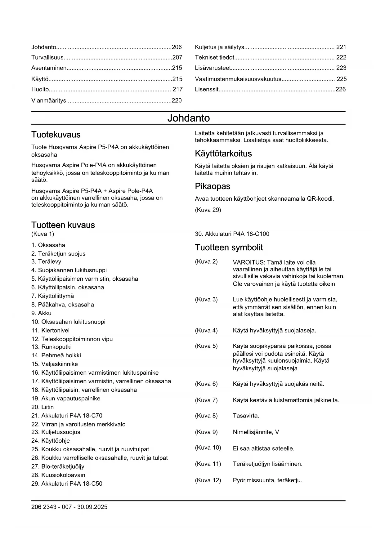 Tuotteen symbolit (Kuva 2) VAROITUS: Tämä laite voi olla vaarallinen ja aiheuttaa käyttäjälle tai sivullisille vakavia vahinkoja tai kuoleman. Ole varovainen ja käytä tuotetta oikein. (Kuva 3) Lue käyttöohje huolellisesti ja varmista, että ymmärrät sen sisällön, ennen kuin alat käyttää laitetta. (Kuva 4) Käytä hyväksyttyjä suojalaseja. (Kuva 5) Käytä suojakypärää paikoissa, joissa päällesi voi pudota esineitä. Käytä hyväksyttyjä kuulonsuojaimia. Käytä hyväksyttyjä suojalaseja. (Kuva 6) Käytä hyväksyttyjä suojakäsineitä. (Kuva 7) Käytä kestäviä luistamattomia jalkineita. (Kuva 8) Tasavirta. (Kuva 9) Nimellisjännite, V (Kuva 10) Ei saa altistaa sateelle. (Kuva 11) Teräketjuöljyn lisääminen. (Kuva 12) Pyörimissuunta, teräketju. 206 2343 - 007 - 30.09.2025(Kuva 13) Tapaturmavaara. Pidä kädet poissa teräketjun ulottuvilta. (Kuva 14) Löysää nuppia kääntämällä vasemmalle, kiristä nuppia kääntämällä oikealle. (Kuva 15) Laite täyttää voimassa olevien EU- direktiivien vaatimukset. (Kuva 16) Melupäästöt ympäristöön -tarra EU:n direktiivien ja säädösten mukaisesti sekä Uuden Etelä-Walesin ”Protection of the Environment Operations (Noise Control) Regulation 2017” -asetuksen mukaisesti. Tuotteen taattu äänitehotaso on määritetty teknisisissä tiedoissa sivulla Tekniset tiedot sivulla 222 ja kilvessä. (Kuva 17) Laitetta tai sen pakkausta ei saa hävittää kotitalousjätteen mukana. Vie se asianmukaiseen sähkö- ja elektroniikkalaitteiden keräyspisteeseen. (Kuva 18) VAARA – Varmista riittävä etäisyys sähkölinjoihin. (Kuva 19) Pidä sivulliset ja eläimet turvallisen välimatkan päässä työalueesta ja tuotteesta. (Kuva 20) VAROITUS – Irrota akku ennen huoltotoimenpiteitä. (Kuva 24) Tyyppikilvessä näkyy sarjanumero, jossa yyyy on valmistusvuosi, ww on valmistus- viikko ja xxxxx on sarjanumero. Huomautus: Muita laitteen tunnuksia/tarroja tarvitaan tietyillä markkina-alueilla ilmaisemaan erityisiä sertifiointivaatimuksia. Akun ja/tai akkulaturin symbolit (Kuva 21) Vikaturvallinen muuntaja. (Kuva 22) Käytä ja säilytä akkulaturia ainoastaan sisätiloissa. (Kuva 23) Kaksoiseristys. (Kuva 25) Vie tämä tuote asianmukaiseen sähkö- ja elektroniikkalaitteiden keräyspisteeseen. (Vain Eurooppa) (Kuva 26) Käytä akkua vain POWER FOR ALL-järjes- telmäkumppanien tuotteissa. (Kuva 27) Suojaa akku tulelta, lialta, vedeltä, kosteu- delta ja kuumuudelta, kuten jatkuvalta voi- makkaalta auringonvalolta. Akku voi räjäh- tää tai voi aiheutua oikosulku. (Kuva 28) Tuotteen vaurioituminen Emme ole vastuussa tuotteen vaurioitumisesta, jos