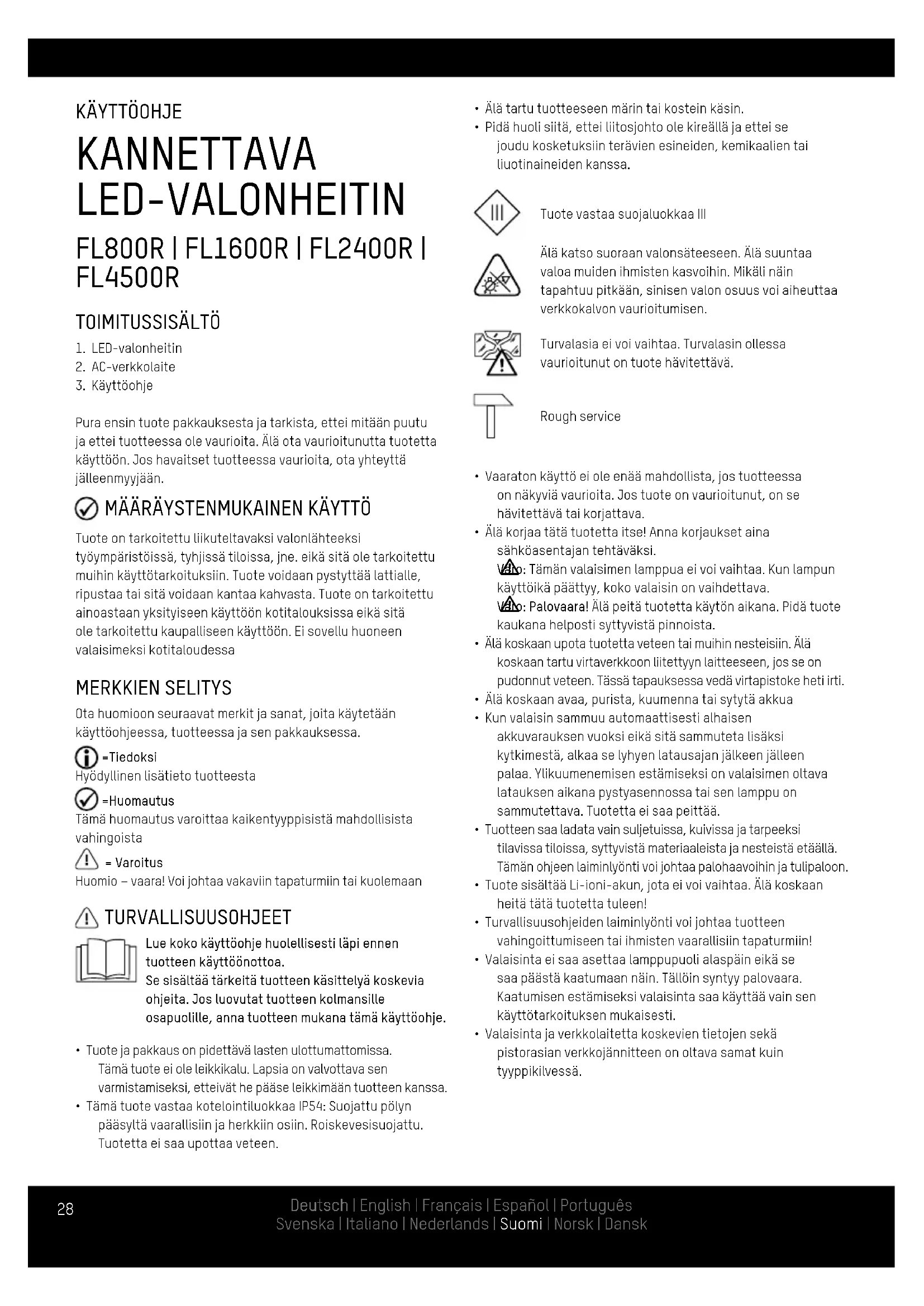 Tuote on tarkoitettu liikuteltavaksi valonlähteeksi työympäristöissä, tyhjissä tiloissa, jne. eikä sitä ole tarkoitettu muihin käyttötarkoituksiin. Tuote voidaan pystyttää lattialle, ripustaa tai sitä voidaan kantaa kahvasta. Tuote on tarkoitettu ainoastaan yksityiseen käyttöön kotitalouksissa eikä sitä ole tarkoitettu kaupalliseen käyttöön. Ei sovellu huoneen valaisimeksi kotitaloudessa MERKKIEN SELITYS Ota huomioon seuraavat merkit ja sanat, joita käytetään käyttöohjeessa, tuotteessa ja sen pakkauksessa. =Tiedoksi Hyödyllinen lisätieto tuotteesta =Huomautus Tämä huomautus varoittaa kaikentyyppisistä mahdollisista vahingoista = Varoitus Huomio – vaara! Voi johtaa vakaviin tapaturmiin tai kuolemaan TURVALLISUUSOHJEET Lue koko käyttöohje huolellisesti läpi ennen tuotteen käyttöönottoa. Se sisältää tärkeitä tuotteen käsittelyä koskevia ohjeita. Jos luovutat tuotteen kolmansille osapuolille, anna tuotteen mukana tämä käyttöohje.