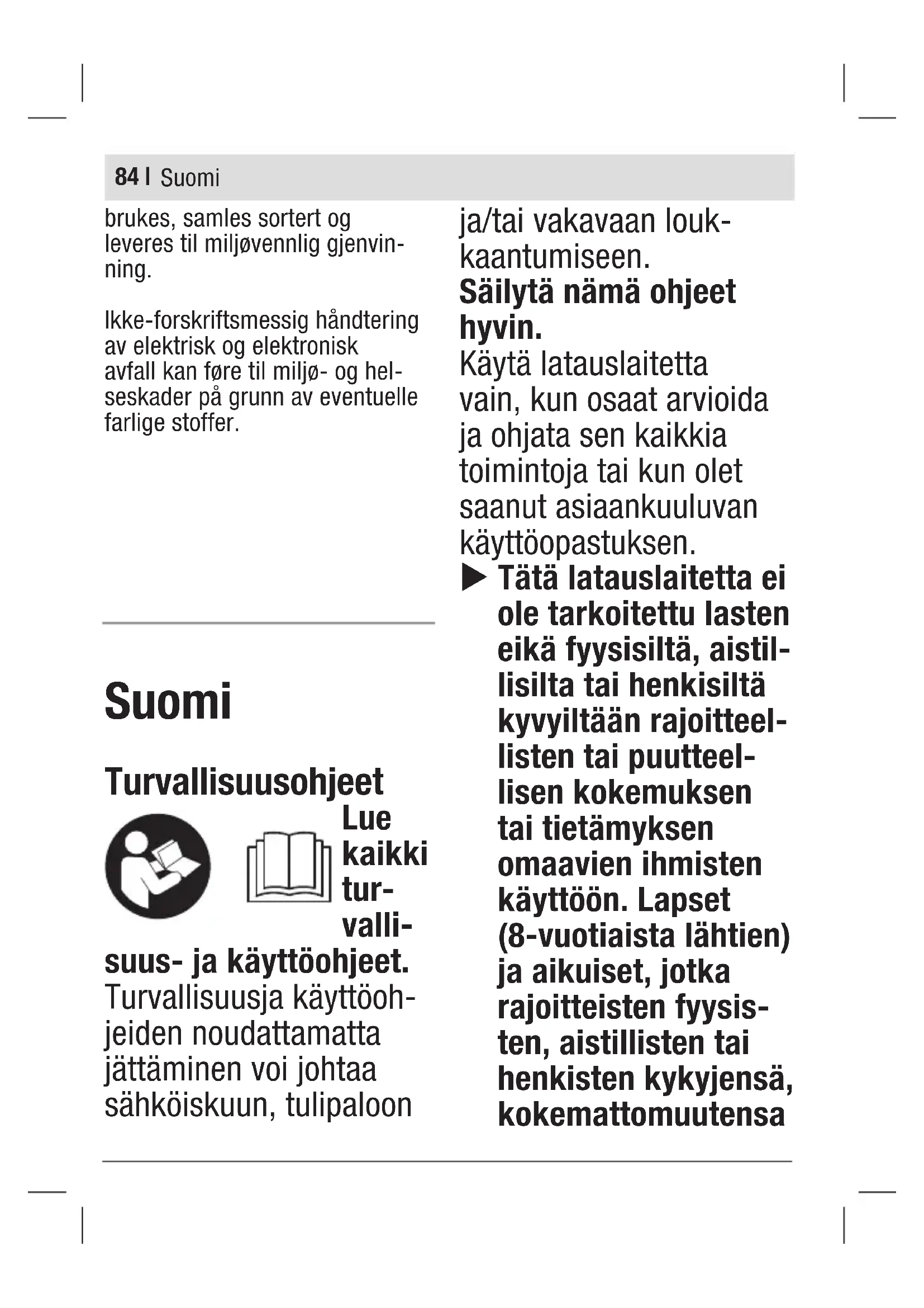 riippuu lämpötilasta ja akkutyypistä Lataus u Huomioi verkkojännite! Vir- talähteen jännitteen tulee vastata laitteen tyyppikilvessä olevia tietoja. Varmista, ettei latausau- kossa (3) ja akun koskettimissa ole karkeaa likaa. Varmista, että akku on kunnolla paikallaan. Lataus alkaa heti kun kytket latauslaitteen pistotulpan pistora- siaan ja työnnät akun latausauk- koon (3). Suomi88 | Lataus on mahdollista vain kun akun lämpöti- la on sallitulla lataus- lämpötila-alueella (0–45 °C). Älykäs lataustoiminto tunnistaa automaattisesti akun lataustilan ja lataa optimaalisella latausvir- ralla akun lämpötilan ja jännitteen mukaan. Tämä suojaa akkua ja akku pysyy aina täyteen ladattuna, kun sitä säilytetään latauslaitteessa. Huomattavasti lyhentynyt käyn- tiaika latauksen jälkeen osoittaa, että akku on elinikänsä lopussa ja täytyy vaihtaa uuteen. Latauslaite saattaa lämmetä, kun sitä käytetään jatkuvasti tai toistuvasti ilman taukoja. Tämä on kuitenkin vaaratonta ja se ei merkitse latauslaitteen teknistä vikaa. Latausajat Alla oleva taulukko näyttää likimääräisen ajan minuutteina, joka tarvitaan akun lataamiseen haluttuun lataustasoon kunkin akkutyypin mukaan. Latausaika riippuu akun tyypistä ja lämpöti- lasta. P4A 18-C70 Ladattavat 18 V:n POWER FOR ALL -järjestelmän akut 1,5 Ah ≈24 ≈33 2,0 Ah ≈32 ≈45 2,5 Ah ≈40 ≈60 3,0 Ah ≈48 ≈72 4,0 Ah ≈64 ≈95 4,0 Ah Power Plus ≈69 ≈88 5,0 Ah ≈80 ≈105 6,0 Ah ≈96 ≈130 Vastaa noin 80 %:n lataustasoa Vastaa täyteen ladattua tilaa Suomi| 89 Merkkivalojen mer- kitys Lataustilan vihreän merk- kivalon nopea vilkunta Pikalataamisesta ilmoitetaan vihreänä vilkkuvalla latausti- lan merkkivalolla (2). Akun voi ottaa koska tahansa pois latauslaitteesta käyttöä varten. Heti kun akun kapasiteetti on noin 80 % tasolla, akun latausti- lan vihreän merkkivalon vilkunta hidastuu. Tällöin pikalataus on saatu päätökseen. Jos akku jätetään latauslaitteeseen, akku ladataan täyteen hitaammalla nopeudella. Lataustilan vihreän merk- kivalon hidas vilkunta Kun akun latausta- son on noin 80 %, lataustilan vihreä merkkivalo (2) vilkkuu hitaasti. Akun voi ottaa heti käyttöön. Akun lataustilan merkkiva- lon jatkuva palaminen Kun akun lataustilan vihreä merkkivalo (2) palaa jatkuvasti, akku on ladattu täyteen. Tällöin akun voi ottaa käyttöön. Kun akku ei ole latauslaitteessa ja akun lataustilan erkkivalo (2) palaa jatkuvasti, tämä on ilmoitus siitä, että pistotulppa on kytketty pistorasiaan ja latauslaite on käyttövalmis. Lämpötilavalvonnan jat- kuvasti palava punainen merkkivalo Jatkuvasti palava punainen merkkiva- lo (1) ilmoittaa siitä, ettei akun lämpötila ole sallitulla latauslämpötila- alueella (0–45 °C). Lataus alkaa heti kun lämpötila on sallitulla alueella. Suomi90 | Virheilmoituksen vilkkuva punainen merkkivalo Vilkkuva punainen merkkivalo (1) ilmoittaa muusta lataushäiriöstä (katso „Akkua ei ladata“, Sivu 90). Virheiden korjaa- minen Akkua ei ladata Akku ei lataudu, punainen merkkivalo (1) vilkkuu ja lataustilan vihreä merkkivalo (2)palaa jatkuvasti. Syy: latauslaite on havainnut sisäisen virheen Korjausohje: varmista, että akut on kytketty kunnolla paikoilleen. Irrota pistoke ja aseta se takaisin paikalleen. Jos virhe toistuu, tarkistuta laturi valtuutetussa Husqvarna-tuotteiden huoltoliik- keessä. Syy: akku ei ole kunnolla paikal- laan Korjausohje: työnnä akku kun- nolla paikalleen latauslaitteeseen. Syy: akku ja sen latauskosketti- met ovat likaisia Korjausohje: puhdista akku ja latauskoskettimet; esimerkiksi kytkemällä ja irrottamalla akku useita kertoja. Syy: akku on viallinen Korjausohje: vaihda akku. Akku ei lataudu ja lataustilan merkkivalo (1) palaa jatkuvasti. Syy: akun lämpötila sallitun lat- auslämpötila-alueen ulkopuolella Korjaustoimenpide: odota, kun- nes akun lämpötila on jälleen sallitun latauslämpötila-alueen (0–45 °C) sisällä. Suomi| 91 Merkkivalot eivät syty Mikään merkkivalo ei pala, akkua ei ladata. Syy: pistorasia, verkkojohto tai latauslaite on viallinen Korjausohje: tarkista verkko- jännite. Tarkistuta latauslaite tarvittaessa valtuutetussa huolto- pisteessä. Syy: latauslaitteen pistotulppaa ei ole kytketty (kunnolla) pistora- siaan Korjausohje: kytke pistotulppa (kunnolla) pistorasiaan. Hoito ja huolto Hävitys Latauslaitteet, lisätarvikkeet ja pakkaukset tulee toimittaa ympä- ristöystävälliseen uusiokäyttöön. Älä heitä lataus- laitteita talousjät- teisiin! Koskee vain EU-maita: Eurooppalaisen käytöstä poistet- tuja sähkö- ja elektroniikkalaittei- ta koskevan direktiivin 2012/19/ EU ja sitä vastaavan kansallisen lainsäädännön mukaan käyttökel- vottomat latauslaitteet tulee kerä- tä erikseen ja toimittaa ympäris- töystävälliseen uusiokäyttöön. Jos käytöstä poistetut sähkö- ja elektroniikkalaitteet hävitetään epäasianmukaisesti, niiden mah- dollisesti sisältämät vaaralliset aineet voivat aiheuttaa haittaa ympäristölle ja ihmisten tervey- delle. Suomi92 |