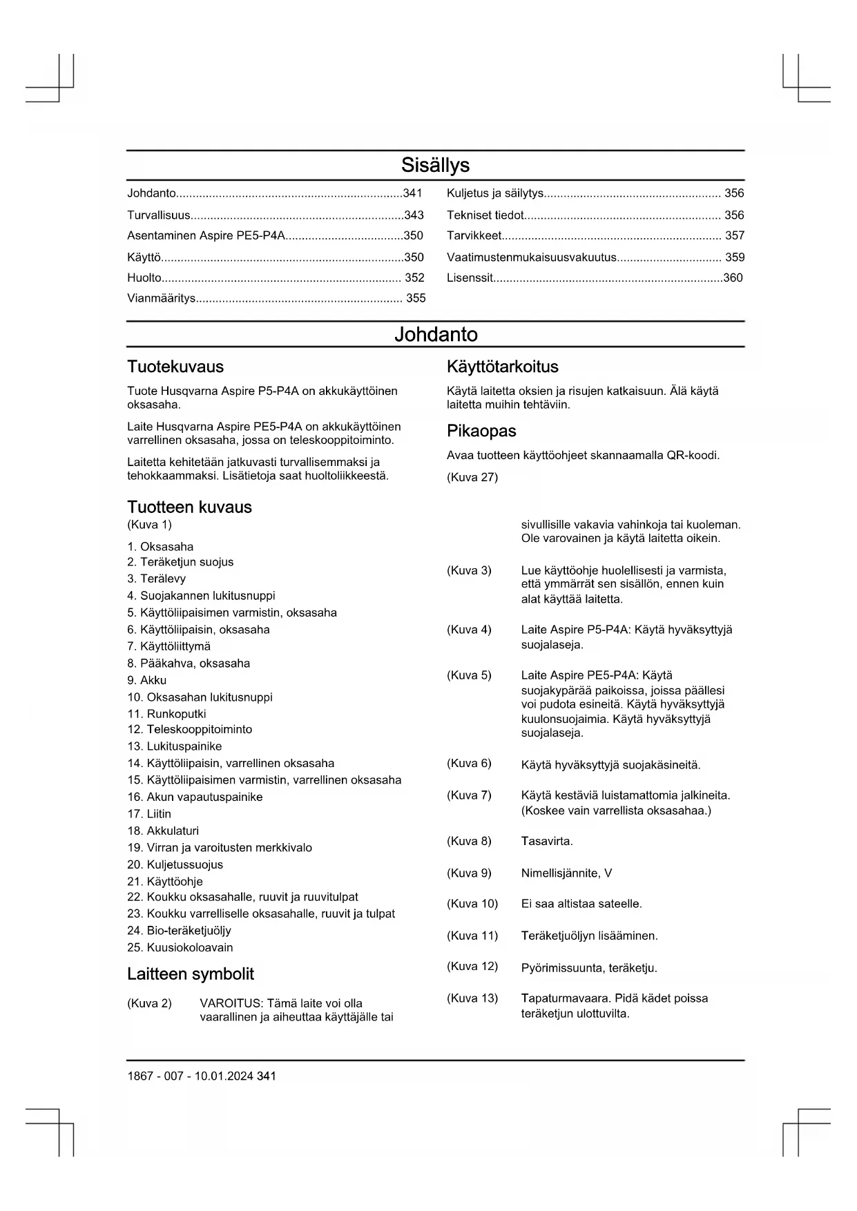 Laitteen symbolit (Kuva 2) VAROITUS: Tämä laite voi olla vaarallinen ja aiheuttaa käyttäjälle tai sivullisille vakavia vahinkoja tai kuoleman. Ole varovainen ja käytä laitetta oikein. (Kuva 3) Lue käyttöohje huolellisesti ja varmista, että ymmärrät sen sisällön, ennen kuin alat käyttää laitetta. (Kuva 4) Laite Aspire P5-P4A: Käytä hyväksyttyjä suojalaseja. (Kuva 5) Laite Aspire PE5-P4A: Käytä suojakypärää paikoissa, joissa päällesi voi pudota esineitä. Käytä hyväksyttyjä kuulonsuojaimia. Käytä hyväksyttyjä suojalaseja. (Kuva 6) Käytä hyväksyttyjä suojakäsineitä. (Kuva 7) Käytä kestäviä luistamattomia jalkineita. (Koskee vain varrellista oksasahaa.) (Kuva 8) Tasavirta. (Kuva 9) Nimellisjännite, V (Kuva 10) Ei saa altistaa sateelle. (Kuva 11) Teräketjuöljyn lisääminen. (Kuva 12) Pyörimissuunta, teräketju. (Kuva 13) Tapaturmavaara. Pidä kädet poissa teräketjun ulottuvilta. 1867 - 007 - 10.01.2024 341(Kuva 14) Löysää nuppia kääntämällä vasemmalle, kiristä nuppia kääntämällä oikealle. (Kuva 15) Laite täyttää voimassa olevien EU- direktiivien vaatimukset. (Kuva 16) Tämä tuote täyttää sovellettavissa olevien UK-säädösten vaatimukset. (Kuva 17) Melupäästöt ympäristöön -tarra EU:n ja Yhdistyneen kuningaskunnan direktiivien ja säädösten mukaisesti sekä Uuden Etelä-Walesin "Protection of the Environment Operations (Noise Control) Regulation 2017" -asetuksen mukaisesti. Koneen taattu äänitehotaso on määritelty käyttöohjeen kohdassa ”Tekniset tiedot”, sivulla Tekniset tiedot sivulla 356
