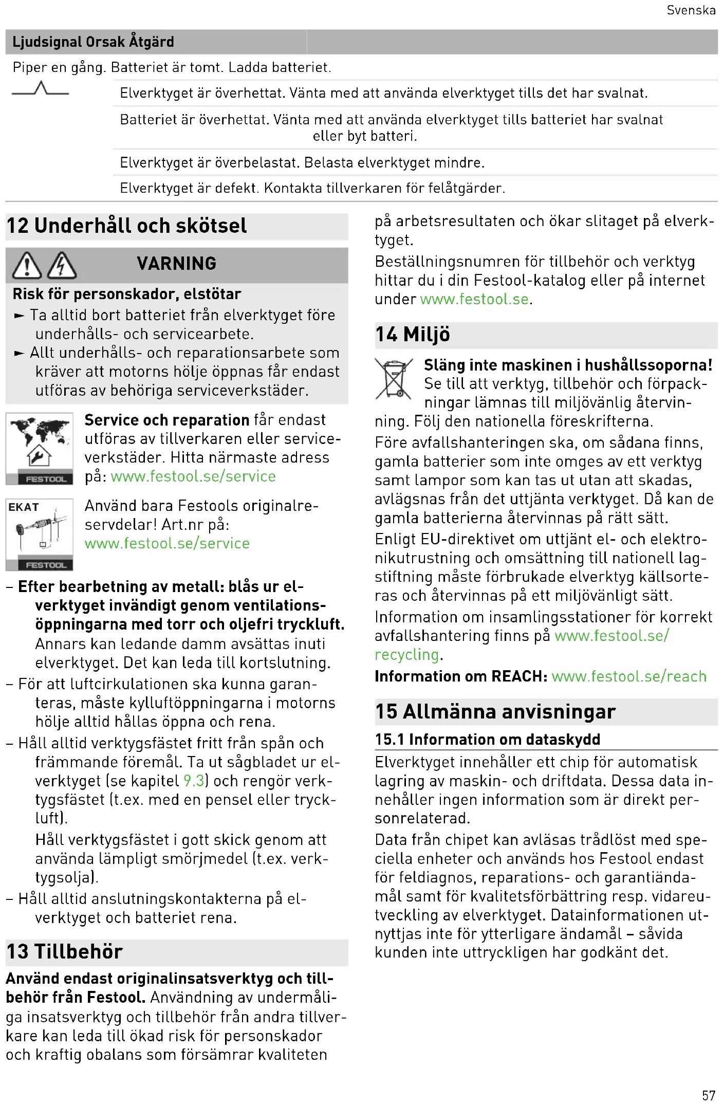 14 Ympäristö Älä heitä käytöstä poistettua konetta ta lousjätteiden joukkoon! Toimita käytös tä poistetut laitteet, tarvikkeet ja pak kaukset ympäristöystävälliseen kierrätykseen. Noudata voimassaolevia kansallisia määräyk siä. Ennen hävittämistä laitteesta tulee poistaa mahdolliset tyhjät paristot ja akut, joita ei ole asennettu kiinteästi laitteen sisään, sekä lam put, jotka voi irrottaa laitteesta niitä rikkomatta. Tällä tavalla vanhat paristot ja akut voidaan kierrättää asianmukaisesti. Käytöstä poistettuja sähkö- ja elektroniikkalait teita koskevan eurooppalaisen direktiivin ja sitä vastaavan kansallisen lainsäädännön mukaan loppuun käytetyt sähkötyökalut täytyy kerätä erikseen talteen ja toimittaa ympäristöä säästä vään kierrätykseen. Kohdassa www.festool.fi/recycling on tietoja asianmukaisen hävittämisen takaavista keräys pisteistä. Teave REACH kohta: www.festool.fi/reach Suomi 6315 Yleisiä ohjeita