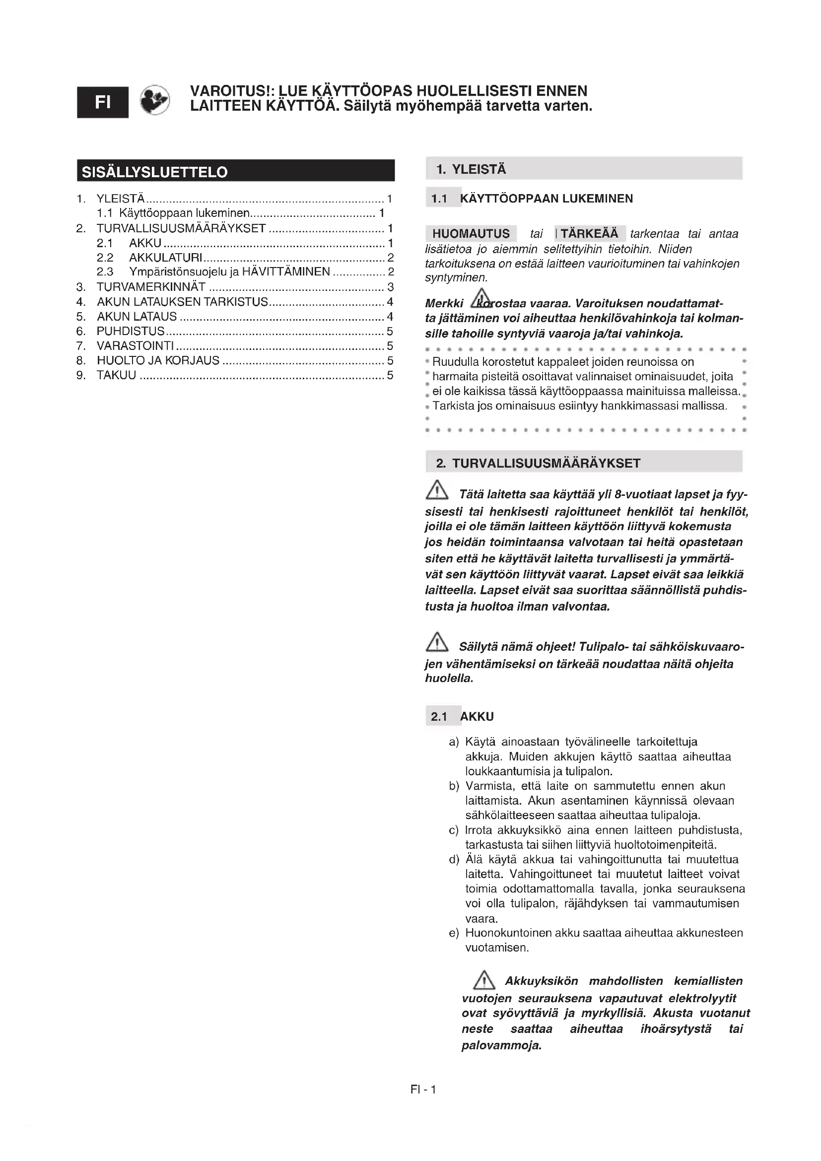 a) Käytä ainoastaan työvälineelle tarkoitettuja akkuja. Muiden akkujen käyttö saattaa aiheuttaa loukkaantumisia ja tulipalon. b) Varmista, että laite on sammutettu ennen akun laittamista. Akun asentaminen käynnissä olevaan sähkölaitteeseen saattaa aiheuttaa tulipaloja. c) Irrota akkuyksikkö aina ennen laitteen puhdistusta, tarkastusta tai siihen liittyviä huoltotoimenpiteitä. d) Älä käytä akkua tai vahingoittunutta tai muutettua laitetta. Vahingoittuneet tai muutetut laitteet voivat toimia odottamattomalla tavalla, jonka seurauksena voi olla tulipalon, räjähdyksen tai vammautumisen vaara. e) Huonokuntoinen akku saattaa aiheuttaa akkunesteen vuotamisen. Akkuyksikön mahdollisten kemiallisten vuotojen seurauksena vapautuvat elektrolyytit ovat syövyttäviä ja myrkyllisiä. Akusta vuotanut neste saattaa aiheuttaa ihoärsytystä tai palovammoja. VAROITUS!: LUE KÄYTTÖOPAS HUOLELLISESTI ENNEN LAITTEEN KÄYTTÖÄ. Säilytä myöhempää tarvetta varten.