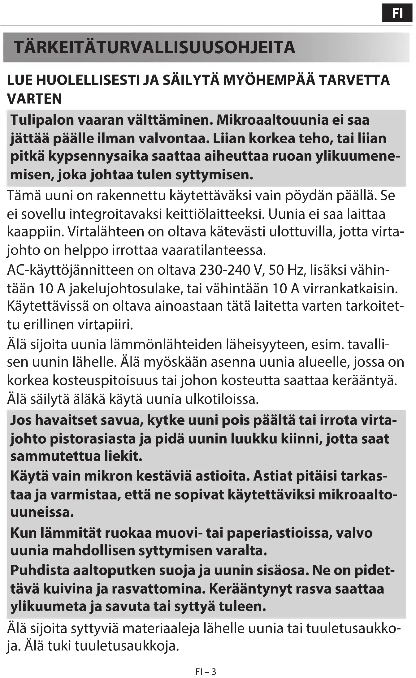 LUE HUOLELLISESTI JA SÄILYTÄ MYÖHEMPÄÄ TARVETTA VARTEN Tulipalon vaaran välttäminen. Mikroaaltouunia ei saa jättää päälle ilman valvontaa. Liian korkea teho, tai liian pitkä kypsennysaika saattaa aiheuttaa ruoan ylikuumene- misen, joka johtaa tulen syttymisen. Tämä uuni on rakennettu käytettäväksi vain pöydän päällä. Se ei sovellu integroitavaksi keittiölaitteeksi. Uunia ei saa laittaa kaappiin. Virtalähteen on oltava kätevästi ulottuvilla, jotta virta- johto on helppo irrottaa vaaratilanteessa. AC-käyttöjännitteen on oltava 230-240 V, 50 Hz, lisäksi vähin- tään 10 A jakelujohtosulake, tai vähintään 10 A virrankatkaisin. Käytettävissä on oltava ainoastaan tätä laitetta varten tarkoitet- tu erillinen virtapiiri. Älä sijoita uunia lämmönlähteiden läheisyyteen, esim. tavalli- sen uunin lähelle. Älä myöskään asenna uunia alueelle, jossa on korkea kosteuspitoisuus tai johon kosteutta saattaa kerääntyä. Älä säilytä äläkä käytä uunia ulkotiloissa. Jos havaitset savua, kytke uuni pois päältä tai irrota virta- johto pistorasiasta ja pidä uunin luukku kiinni, jotta saat sammutettua liekit. Käytä vain mikron kestäviä astioita. Astiat pitäisi tarkas- taa ja varmistaa, että ne sopivat käytettäviksi mikroaalto- uuneissa. Kun lämmität ruokaa muovi- tai paperiastioissa, valvo uunia mahdollisen syttymisen varalta. Puhdista aaltoputken suoja ja uunin sisäosa. Ne on pidet- tävä kuivina ja rasvattomina. Kerääntynyt rasva saattaa ylikuumeta ja savuta tai syttyä tuleen. Älä sijoita syttyviä materiaaleja lähelle uunia tai tuuletusaukko- ja. Älä tuki tuuletusaukkoja. FI – 2FI – 2