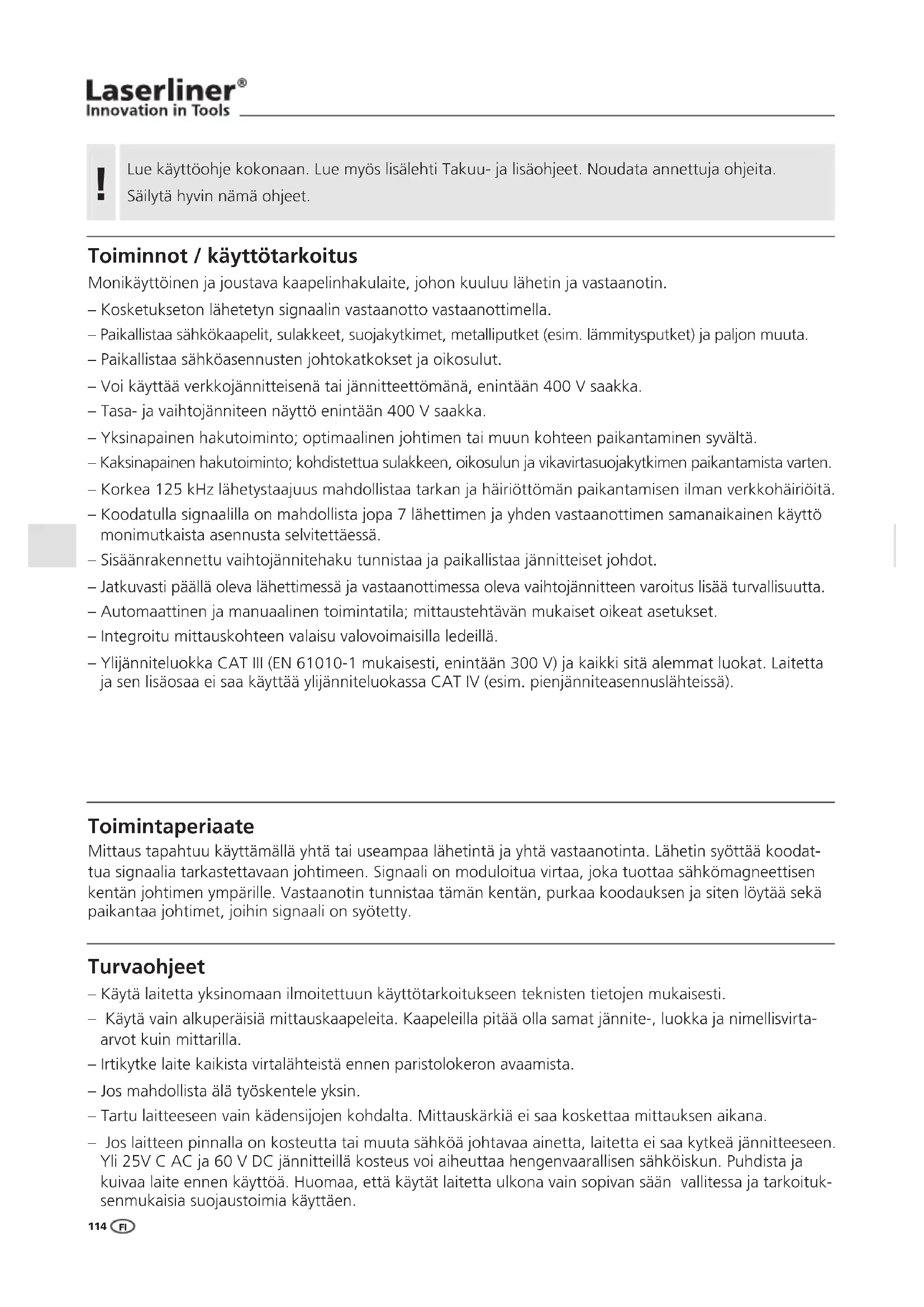Manual_CableTracer-Pro_Rev.0710_PL.indd 113 02.09.2010 11:20:25 UhrLue käyttöohje kokonaan. Lue myös lisälehti Takuu- ja lisäohjeet. Noudata annettuja ohjeita. Säilytä hyvin nämä ohjeet.