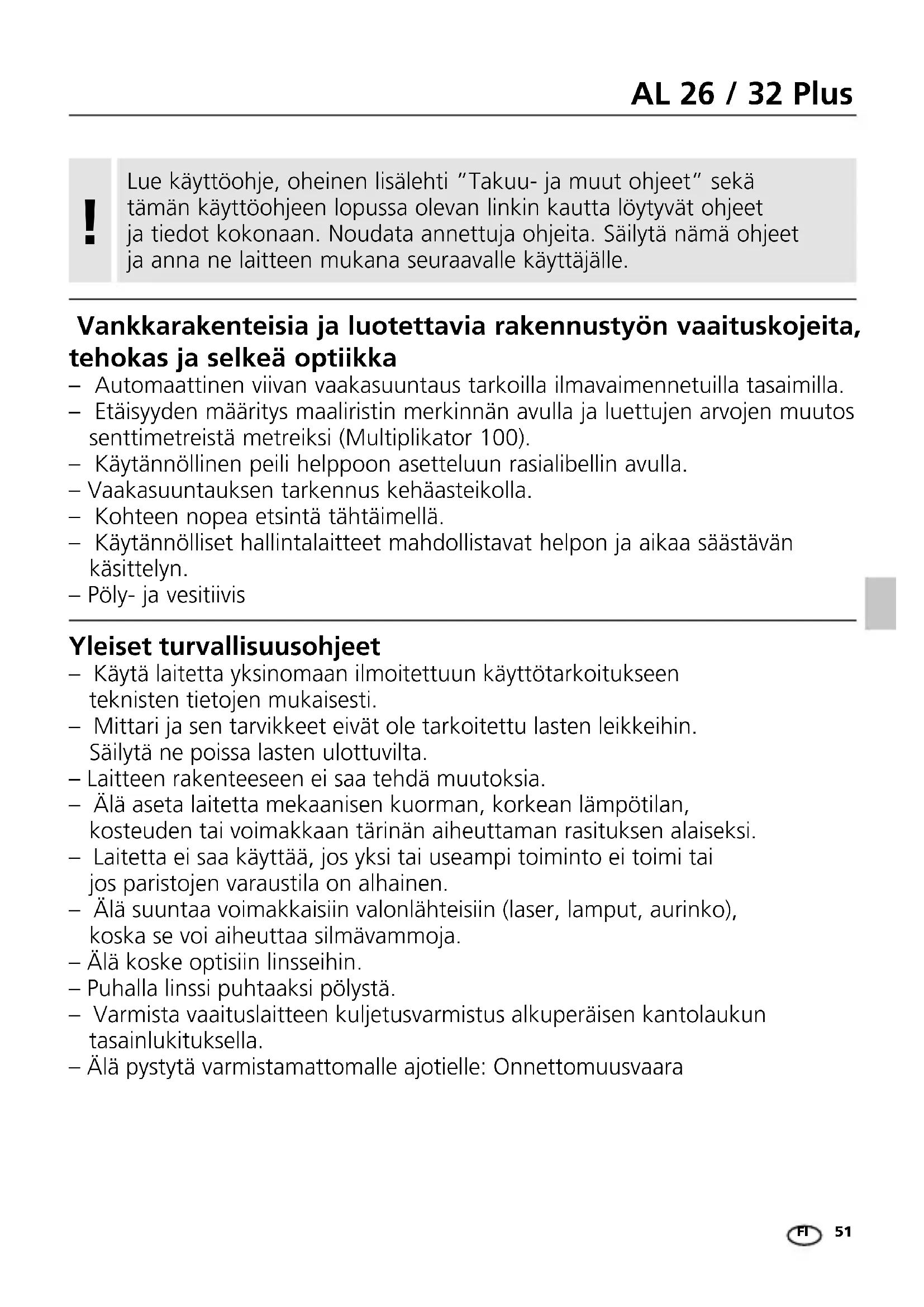 Vankkarakenteisia ja luotettavia rakennustyön vaaituskojeita, tehokas ja selkeä optiikka – Automaattinen viivan vaakasuuntaus tarkoilla ilmavaimennetuilla tasaimilla. – Etäisyyden määritys maaliristin merkinnän avulla ja luettujen arvojen muutos senttimetreistä metreiksi (Multiplikator 100). – Käytännöllinen peili helppoon asetteluun rasialibellin avulla. – Vaakasuuntauksen tarkennus kehäasteikolla. – Kohteen nopea etsintä tähtäimellä. – Käytännölliset hallintalaitteet mahdollistavat helpon ja aikaa säästävän käsittelyn. – Pöly- ja vesitiivis Yleiset turvallisuusohjeet – Käytä laitetta yksinomaan ilmoitettuun käyttötarkoitukseen teknisten tietojen mukaisesti. – Mittari ja sen tarvikkeet eivät ole tarkoitettu lasten leikkeihin. Säilytä ne poissa lasten ulottuvilta. – Laitteen rakenteeseen ei saa tehdä muutoksia. – Älä aseta laitetta mekaanisen kuorman, korkean lämpötilan, kosteuden tai voimakkaan tärinän aiheuttaman rasituksen alaiseksi. – Laitetta ei saa käyttää, jos yksi tai useampi toiminto ei toimi tai jos paristojen varaustila on alhainen. – Älä suuntaa voimakkaisiin valonlähteisiin (laser, lamput, aurinko), koska se voi aiheuttaa silmävammoja. – Älä koske optisiin linsseihin. – Puhalla linssi puhtaaksi pölystä. – Varmista vaaituslaitteen kuljetusvarmistus alkuperäisen kantolaukun tasainlukituksella. – Älä pystytä varmistamattomalle ajotielle: Onnettomuusvaara Lue käyttöohje, oheinen lisälehti ”Takuu- ja muut ohjeet” sekä tämän käyttöohjeen lopussa olevan linkin kautta löytyvät ohjeet ja tiedot kokonaan. Noudata annettuja ohjeita. Säilytä nämä ohjeet ja anna ne laitteen mukana seuraavalle käyttäjälle.