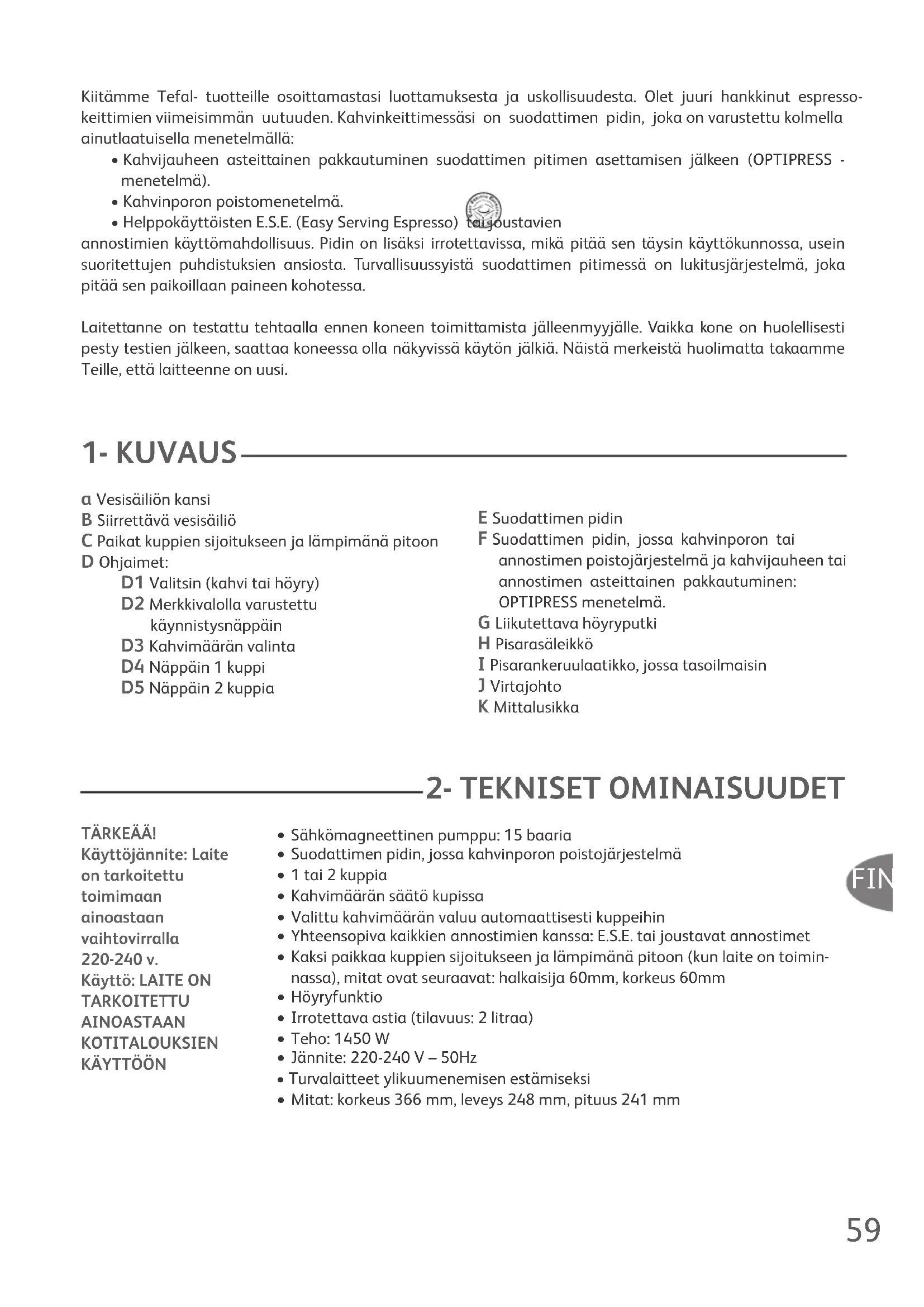 a Vesisäiliön kansi B Siirrettävä vesisäiliö C Paikat kuppien sijoitukseen ja lämpimänä pitoon D Ohjaimet: D1 Valitsin (kahvi tai höyry) D2 Merkkivalolla varustettu käynnistysnäppäin D3 Kahvimäärän valinta D4 Näppäin 1 kuppi D5 Näppäin 2 kuppia E Suodattimen pidin F Suodattimen pidin, jossa kahvinporon tai annostimen poistojärjestelmä ja kahvijauheen tai annostimen asteittainen pakkautuminen: OPTIPRESS menetelmä. G Liikutettava höyryputki H Pisarasäleikkö I Pisarankeruulaatikko, jossa tasoilmaisin J Virtajohto K Mittalusikka Kiitämme Tefal- tuotteille osoittamastasi luottamuksesta ja uskollisuudesta. Olet juuri hankkinut espresso- keittimien viimeisimmän uutuuden. Kahvinkeittimessäsi on suodattimen pidin, joka on varustettu kolmella ainutlaatuisella menetelmällä: