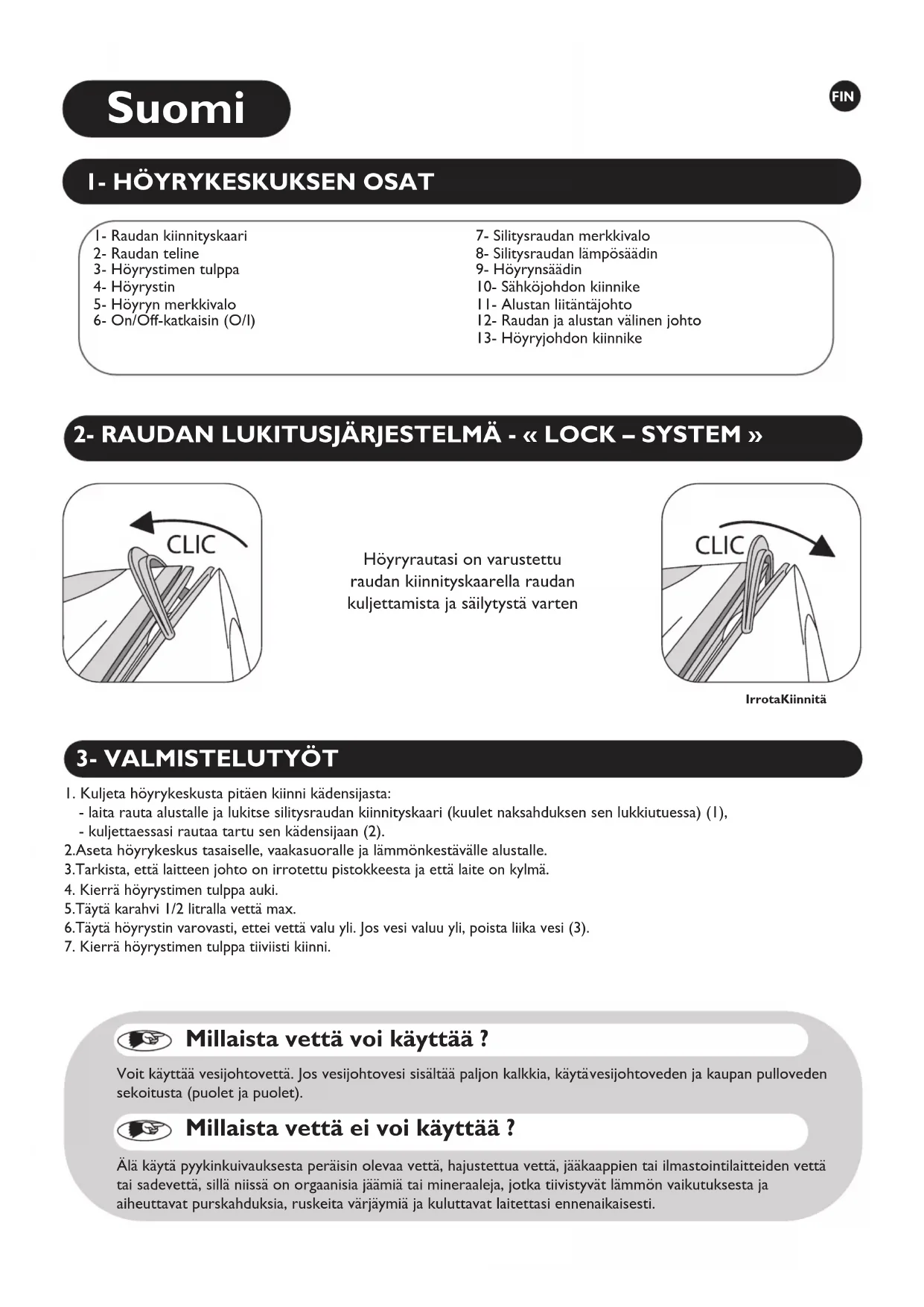 - Siinä on kaksi turvallisuusjärjestelmää : - Venttiili, joka estää liikapaineen ja päästää ylimääräisen höyryn ulos laitteen ollessa epäkunnossa. - Lämpösulake, joka estää ylikuumenemisen.