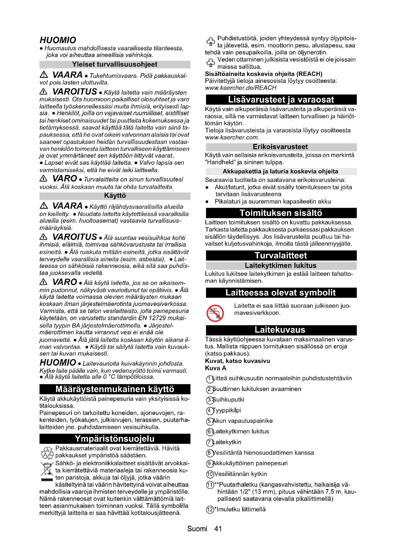 - EU-vaatimustenmukaisuusvakuutus Chairman of the Board of Management Director Regulatory Affairs & Certification H. Jenner S. ReiserSuomi 41 HUOMIO ● Huomautus mahdollisesta vaarallisesta tilanteesta, joka voi aiheuttaa aineellisia vahinkoja. Yleiset turvallisuusohjeet VAARA ● Tukehtumisvaara. Pidä pakkauskal- vot pois lasten ulottuvilta. 몇 VAROITUS ● Käytä laitetta vain määräysten mukaisesti. Ota huomioon paikalliset olosuhteet ja varo laitteella työskennellessäsi muita ihmisiä, erityisesti lap- sia. ● Henkilöt, joilla on vajavaiset ruumiilliset, aistilliset tai henkiset ominaisuudet tai puutteita kokemuksessa ja tietämyksessä, saavat käyttää tätä laitetta vain siinä ta- pauksessa, että he ovat oikein valvonnan alaisia tai ovat saaneet opastuksen heidän turvallisuudestaan vastaa- van henkilön toimesta laitteen turvalliseen käyttämiseen ja ovat ymmärtäneet sen käyttöön liittyvät vaarat. ● Lapset eivät sas käyttää laitetta. ● Valvo lapsia sen varmistamiseksi, että he eivät leiki laitteella. 몇 VARO ● Turvalaitteita on sinun turvallisuutesi vuoksi. Älä koskaan muuta tai ohita turvalaitteita. Käyttö VAARA ● Käyttö räjähdysvaarallisilla alueilla on kielletty. ● Noudata laitetta käytettäessä vaarallisilla alueilla (esim. huoltoasemat) vastaavia turvallisuus- määräyksiä. 몇 VAROITUS ● Älä suuntaa vesisuihkua kohti ihmisiä, eläimiä, toimivaa sähkövarustusta tai irrallisia esineitä. ● Älä ruiskuta mitään esineitä, jotka sisältävät terveydelle vaarallisia aineita (esim. asbestia). ● Lait- teessa on sähköisiä rakenneosia, eikä sitä saa puhdis- taa juoksevalla vedellä. 몇 VARO ● Älä käytä laitetta, jos se on aikaisem- min pudonnut, näkyvästi vaurioitunut tai epätiivis. ● Älä käytä laitetta voimassa olevien määräysten mukaan koskaan ilman järjestelmäerotinta juomavesiverkossa. Varmista, että se talon vesilaitteisto, jolla painepesuria käytetään, on varustettu standardin EN 12729 mukai- sella tyypin BA järjestelmäerottimella. ● Järjestel- mäerottimen kautta virrannut vesi ei enää ole juomavettä. ● Älä jätä laitetta koskaan käytön aikana il- man valvontaa. ● Käytä tai säilytä laitetta vain kuvauk- sen tai kuvan mukaisesti. HUOMIO ● Laitevaurioita kuivakäynnin johdosta. Kytke laite päälle vain, kun vedensyöttö toimii varmasti. ● Älä käytä laitetta alle 0 °C lämpötiloissa. Määräystenmukainen käyttö Käytä akkukäyttöistä painepesuria vain yksityisissä ko- titalouksissa. Painepesuri on tarkoitettu koneiden, ajoneuvojen, ra- kenteiden, työkalujen, julkisivujen, terassien, puutarha- laitteiden jne. puhdistamiseen vesisuihkulla. Ympäristönsuojelu Pakkausmateriaalit ovat kierrätettäviä. Hävitä pakkaukset ympäristöä säästäen. Sähkö- ja elektroniikkalaitteet sisältävät arvokkai- ta kierrätettäviä materiaaleja tai rakenneosia ku- ten paristoja, akkuja tai öljyjä, jotka väärin käsiteltyinä tai väärin hävitettyinä voivat aiheuttaa mahdollisia vaaroja ihmisten terveydelle ja ympäristölle. Nämä rakenneosat ovat kuitenkin välttämättömiä lait- teen asianmukaisen toiminnan vuoksi. Tällä symbolilla merkittyjä laitteita ei saa hävittää kotitalousjätteenä. Puhdistustöitä, joiden yhteydessä syntyy öljypitois- ta jätevettä, esim. moottorin pesu, alustapesu, saa tehdä vain pesupaikoilla, joilla on öljynerotin. Veden ottaminen julkisista vesistöistä ei ole joissain maissa sallittua. Sisältöaineita koskevia ohjeita (REACH) Päivitettyjä tietoja ainesosista löytyy osoitteesta: www.kaercher.de/REACH Lisävarusteet ja varaosat Käytä vain alkuperäisiä lisävarusteita ja alkuperäisiä va- raosia, sillä ne varmistavat laitteen turvallisen ja häiriöt- tömän käytön. Tietoja lisävarusteista ja varaosista löytyy osoitteesta www.kaercher.com. Erikoisvarusteet Käytä vain sellaisia erikoisvarusteita, joissa on merkintä ”Handheld” ja sininen tulppa. Akkupakettia ja laturia koskevia ohjeita Seuraavia tuotteita on saatavana erikoisvarusteina: ● Akut/laturit, jotka eivät sisälly toimitukseen tai joita tarvitaan lisävarusteena ● Pikalaturi ja suuremman kapasiteetin akku Toimituksen sisältö Laitteen toimituksen sisältö on kuvattu pakkauksessa. Tarkasta laitetta pakkauksesta purkaessasi pakkauksen sisällön täydellisyys. Jos lisävarusteita puuttuu tai ha- vaitset kuljetusvahinkoja, ilmoita tästä jälleenmyyjälle. Turvalaitteet Laitekytkimen lukitus Lukitus lukitsee laitekytkimen ja estää laitteen tahatto- man käynnistämisen. Laitteessa olevat symbolit Laitekuvaus Tässä käyttöohjeessa kuvataan maksimaalinen varus- tus. Mallista riippuen toimituksen sisällössä on eroja (katso pakkaus). Kuvat, katso kuvasivu Kuva A 1 Litteä suihkusuutin normaaleihin puhdistustehtäviin 2 Suuttimen lukituksen avaaminen 3 Suihkuputki 4 Tyyppikilpi 5 Akun vapautuspainike 6 Laitekytkimen lukitus 7 Laitekytkin 8 Vesiliitäntä hienosuodattimen kanssa 9 Akkukäyttöinen painepesuri 10 Vesiliitännän kytkin 11 **Puutarhaletku (kangasvahvistettu, halkaisija vä- hintään 1/2" (13 mm), pituus vähintään 7,5 m, kau- pallisesti saatavana olevalla pikaliittimellä) 12 *Imuletku liittimellä Laitetta ei saa liittää suoraan julkiseen juo- mavesiverkkoon.42 Suomi 13 *Battery Power 18/25 -akku 14 *Battery Power 18 V -vakiolaturi 15 *Taittosäiliö p. 43