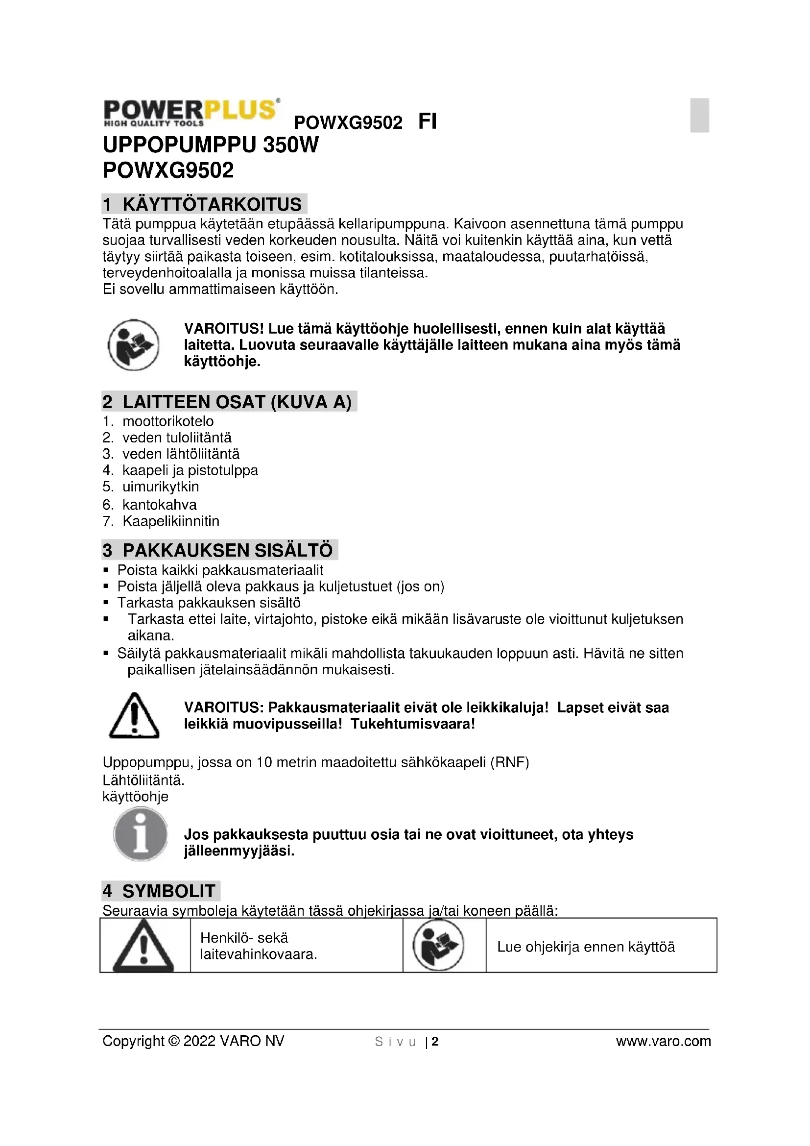Jos joudut poistamaan laitteen käytöstä pitkäaikaisen käytön jälkeen, älä hävitä sitä tavallisen kotitalousjätteen mukana, vaan huolehdi sen hävittämisestä ympäristöä suojaavalla tavalla. Sähkölaitteiden tuottamia jätteitä ei saa käsitellä tavallisten kotitalousjätteiden tapaan. Vie ne kierrätettäväksi asianmukaiseen paikkaan. Kysy neuvoa kierrätyksestä paikallisilta viranomaisilta tai jälleenmyyjältä.POWXG9502 FI Copyright © 2022 VARO NV S i v u | 8 www.varo.com 16 YHDENMUKAISUUSILMOITUS VARO N.V. - Vic. Van Rompuy N.V. Joseph Van Instraat 9 - BE2500 Lier - BELGIA ilmoittaa, että Tuote: UPPOpumppu 350W Tavaramerkki: POWERplus Malli: POWXG9502 on yhdenmukaistettuihin eurooppalaisiin standardien soveltamiseen perustuvien sovellettavien eurooppalaisten direktiivien olennaisten vaatimusten ja muiden asiaankuuluvien säännösten mukainen. Laitteen luvaton muokkaaminen johtaa tämän vakuutuksen mitätöitymiseen. Euroopan yhteisön direktiivit (sekä niiden mahdolliset muutokset allekirjoituspäivään saakka): 2011/65/EU 2014/35/EU 2014/30/EU Eurooppalaiset yhdenmukaistetut standardit (sekä niiden mahdolliset muutokset allekirjoituspäivään saakka): EN60335-1 : 2012 EN60335-2-41: 2003