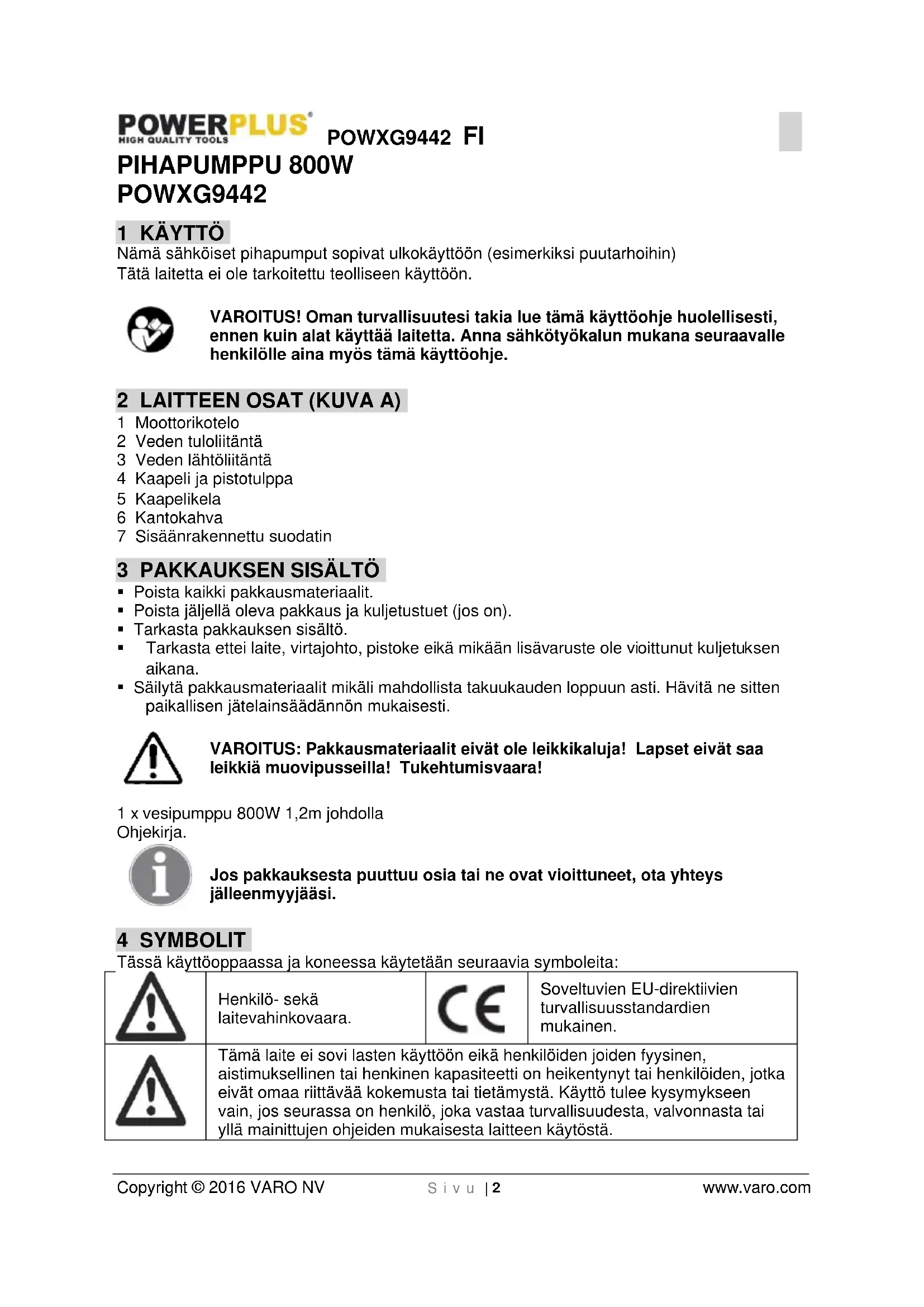 - Jos joudut poistamaan laitteen käytöstä pitkäaikaisen käytön jälkeen, älä hävitä sitä tavallisen kotitalousjätteen mukana, vaan huolehdi sen hävittämisestä ympäristöä suojaavalla tavalla. Sähkölaitteiden tuottamia jätteitä ei saa käsitellä tavallisten kotitalousjätteiden tapaan. Vie ne kierrätettäväksi asianmukaiseen paikkaan. Kysy neuvoa kierrätyksestä paikallisilta viranomaisilta tai jälleenmyyjältä.POWXG9442 FI Copyright © 2016 VARO NV S i v u | 8 www.varo.com 14 YHDENMUKAISUUSILMOITUS VARO N.V. - Joseph Van Instraat 9 - BE2500 Lier - BELGIA ilmoittaa, että Tuote: Pihapumppu Tavaramerkki: POWERplus Malli: POWXG9442 on yhdenmukaistettuihin eurooppalaisiin standardien soveltamiseen perustuvien sovellettavien eurooppalaisten direktiivien olennaisten vaatimusten ja muiden asiaankuuluvien säännösten mukainen. Laitteen luvaton muokkaaminen johtaa tämän vakuutuksen mitätöitymiseen. Euroopan yhteisön direktiivit (sekä niiden mahdolliset muutokset allekirjoituspäivään saakka); 2011/65/EU 2006/95/EY 2004/108/EY 2000/14/EC Annex V LwA 81dB(A) / 84dB(A) Eurooppalaiset yhdenmukaistetut standardit (sekä niiden mahdolliset muutokset allekirjoituspäivään saakka); EN60335-1 : 2012 EN60335-2-41 : 2003 EN55014-1 : 2006 EN55014-2 : 1997 EN61000-3-2 : 2006 EN61000-3-3 : 2013 Teknisten asiakirjojen haltija: Philippe Vankerkhove, VARO – Vic Van Rompuy N.V. Allekirjoittanut toimii yrityksen toimitusjohtajan puolesta, Hugo Cuypers Sääntelyasiat – vaatimuksenmukaisuudesta vastaava johtaja 26/06/2015POWXG9442 EL Copyright © 2016 VARO NV Σ ε λ ί δ α | 1 www.varo.com 1 ΕΦΑΡΜΟΓΗ p. 2