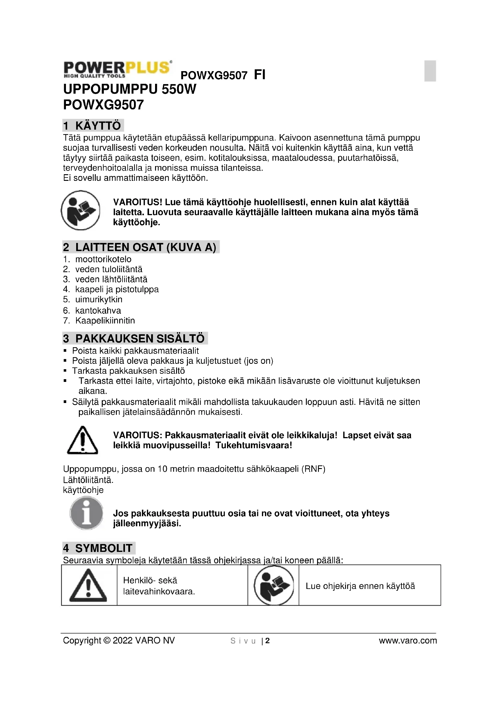 Copyright © 2022 VARO NV S i v u | 2 www.varo.com UPPOPUMPPU 550W POWXG9507 1 KÄYTTÖ Tätä pumppua käytetään etupäässä kellaripumppuna. Kaivoon asennettuna tämä pumppu suojaa turvallisesti veden korkeuden nousulta. Näitä voi kuitenkin käyttää aina, kun vettä täytyy siirtää paikasta toiseen, esim. kotitalouksissa, maataloudessa, puutarhatöissä, terveydenhoitoalalla ja monissa muissa tilanteissa. Ei sovellu ammattimaiseen käyttöön. VAROITUS! Lue tämä käyttöohje huolellisesti, ennen kuin alat käyttää laitetta. Luovuta seuraavalle käyttäjälle laitteen mukana aina myös tämä käyttöohje. 2 LAITTEEN OSAT (KUVA A)