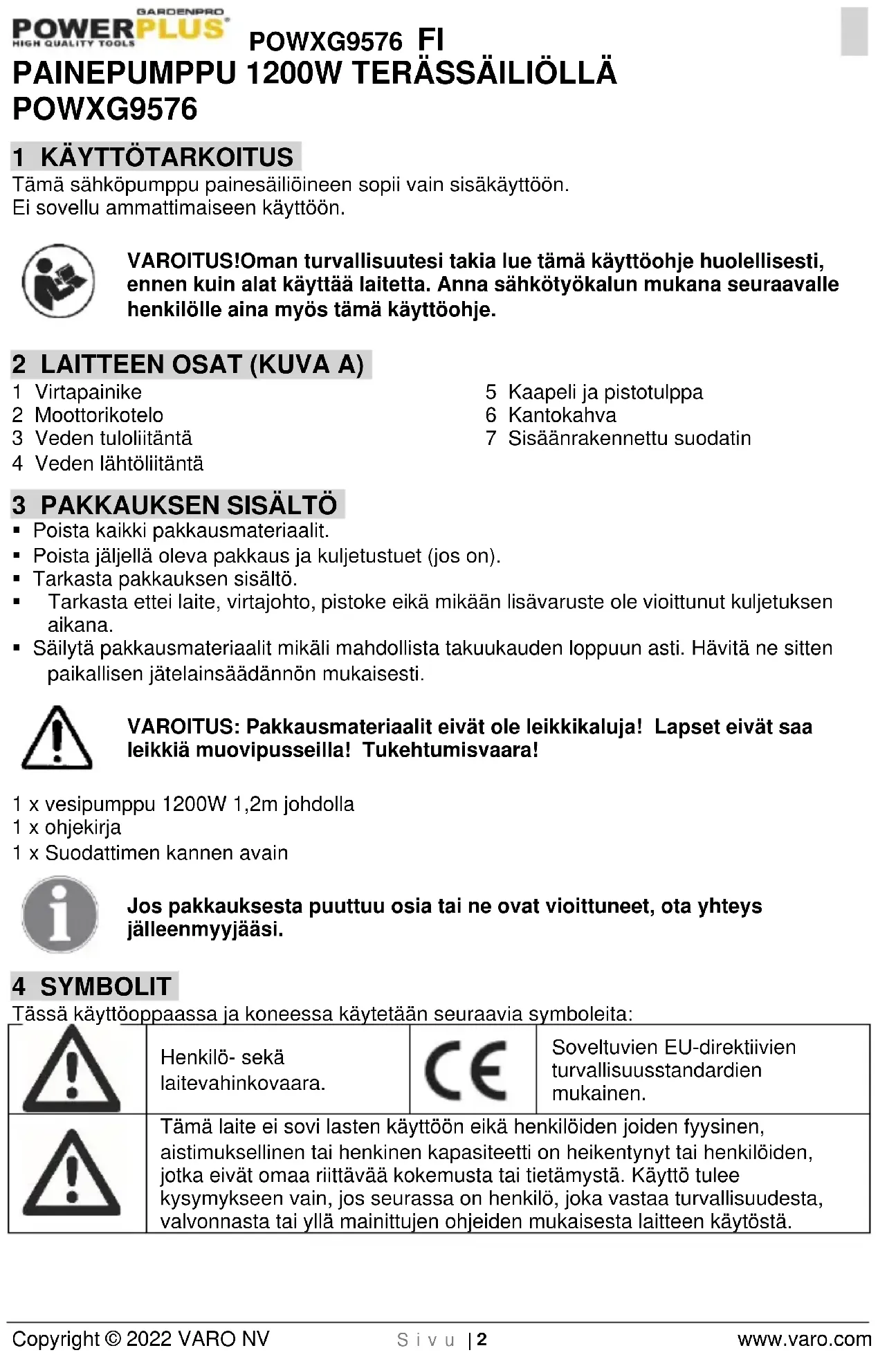 Jos joudut poistamaan laitteen käytöstä pitkäaikaisen käytön jälkeen, älä hävitä sitä tavallisen kotitalousjätteen mukana, vaan huolehdi sen hävittämisestä ympäristöä suojaavalla tavalla. Sähkölaitteiden tuottamia jätteitä ei saa käsitellä tavallisten kotitalousjätteiden tapaan. Vie ne kierrätettäväksi asianmukaiseen paikkaan. Kysy neuvoa kierrätyksestä paikallisilta viranomaisilta tai jälleenmyyjältä. 14 YHDENMUKAISUUSILMOITUS VARO N.V. - Vic. Van Rompuy N.V. Joseph Van Instraat 9 - BE2500 Lier - BELGIA ilmoittaa, että Tuote: PAINEPUMPPU 1200W TERÄSSÄILIÖLLÄ Tavaramerkki: POWERplus Malli: POWXG9576 on yhdenmukaistettuihin eurooppalaisiin standardien soveltamiseen perustuvien sovellettavien eurooppalaisten direktiivien olennaisten vaatimusten ja muiden asiaankuuluvien säännösten mukainen. Laitteen luvaton muokkaaminen johtaa tämän vakuutuksen mitätöitymiseen. Euroopan yhteisön direktiivit (sekä niiden mahdolliset muutokset allekirjoituspäivään saakka): 2011/65/EU 2014/35/EU 2014/30/EU 2014/68/EU 2000/14/EC Annex V LwA Measured 82dB(A) Guaranteed 84dB(A) Eurooppalaiset yhdenmukaistetut standardit (sekä niiden mahdolliset muutokset allekirjoituspäivään saakka): EN60335-1 : 2012 EN60335-2-41 : 2003