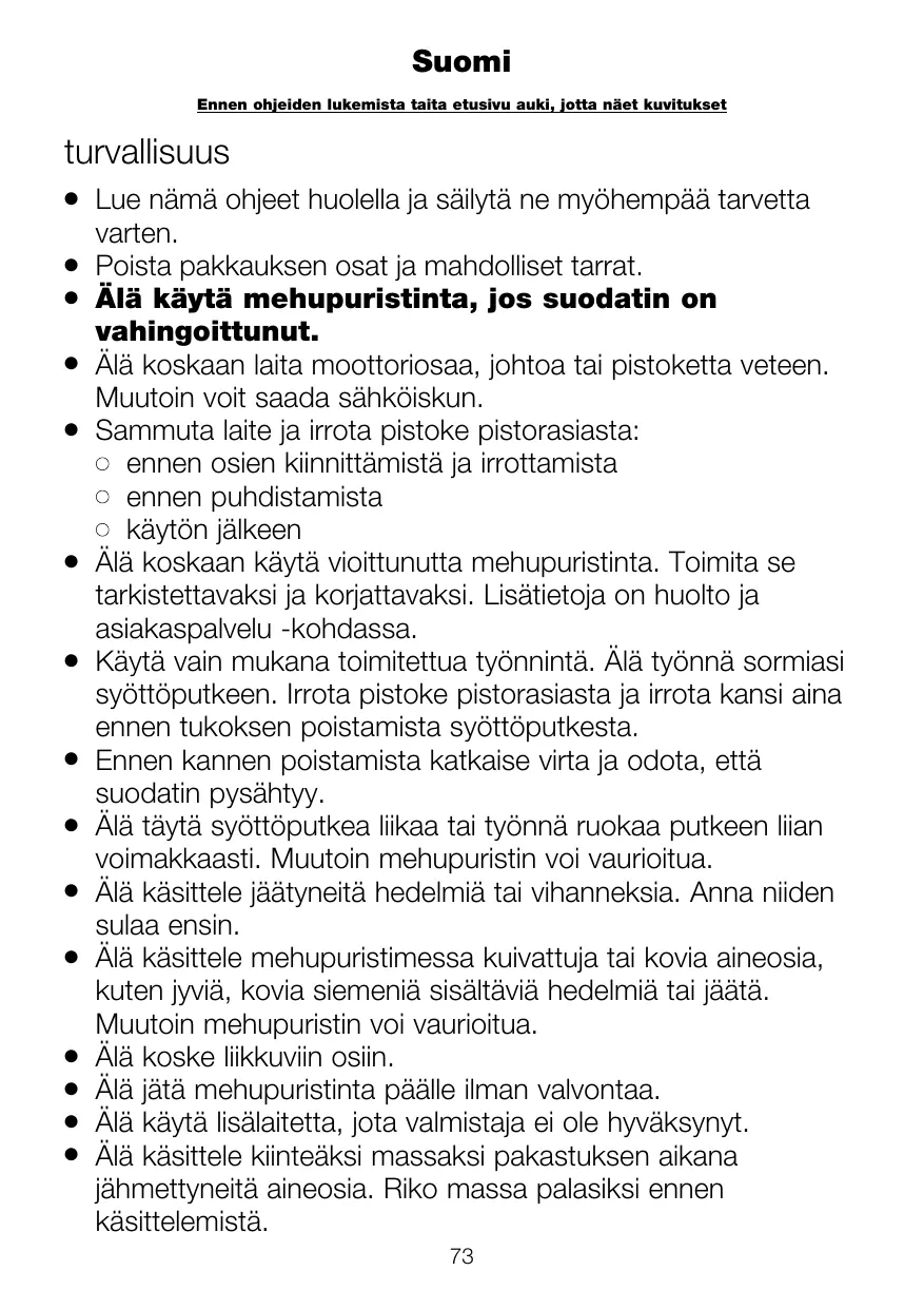 Lue nämä ohjeet huolella ja säilytä ne myöhempää tarvetta varten. Poista pakkauksen osat ja mahdolliset tarrat. Älä käytä mehupuristinta, jos suodatin on vahingoittunut. Älä koskaan laita moottoriosaa, johtoa tai pistoketta veteen. Muutoin voit saada sähköiskun. Sammuta laite ja irrota pistoke pistorasiasta: ennen osien kiinnittämistä ja irrottamista ennen puhdistamista käytön jälkeen Älä koskaan käytä vioittunutta mehupuristinta. Toimita se tarkistettavaksi ja korjattavaksi. Lisätietoja on huolto ja asiakaspalvelu -kohdassa. Käytä vain mukana toimitettua työnnintä. Älä työnnä sormiasi syöttöputkeen. Irrota pistoke pistorasiasta ja irrota kansi aina ennen tukoksen poistamista syöttöputkesta. Ennen kannen poistamista katkaise virta ja odota, että suodatin pysähtyy. Älä täytä syöttöputkea liikaa tai työnnä ruokaa putkeen liian voimakkaasti. Muutoin mehupuristin voi vaurioitua. Älä käsittele jäätyneitä hedelmiä tai vihanneksia. Anna niiden sulaa ensin. Älä käsittele mehupuristimessa kuivattuja tai kovia aineosia, kuten jyviä, kovia siemeniä sisältäviä hedelmiä tai jäätä. Muutoin mehupuristin voi vaurioitua. Älä koske liikkuviin osiin. Älä jätä mehupuristinta päälle ilman valvontaa. Älä käytä lisälaitetta, jota valmistaja ei ole hyväksynyt. Älä käsittele kiinteäksi massaksi pakastuksen aikana jähmettyneitä aineosia. Riko massa palasiksi ennen käsittelemistä. 73