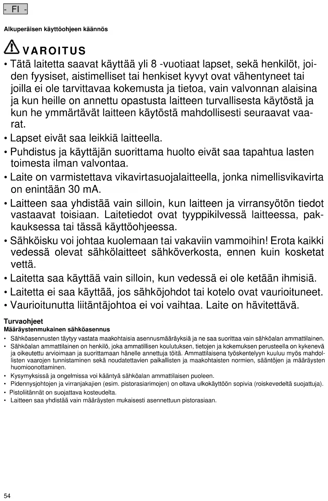 - Laite on varmistettava vikavirtasuojalaitteella, jonka nimellisvikavirta on enintään 30 mA.