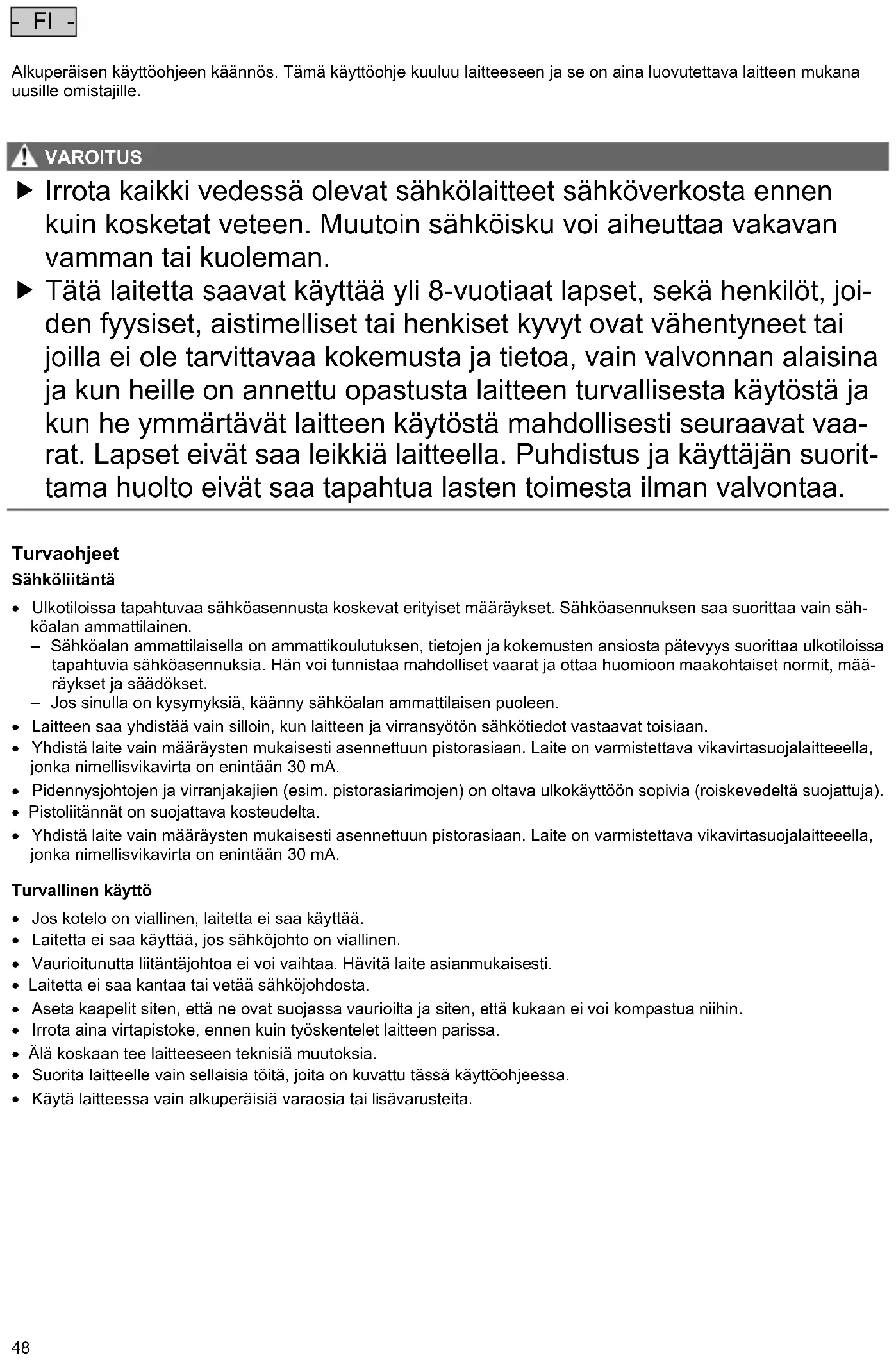 VAROITUS VAROITUS Irrota kaikki vedessä olevat sähkölaitteet sähköverkosta ennen kuin kosketat veteen. Muutoin sähköisku voi aiheuttaa vakavan vamman tai kuoleman. Tätä laitetta saavat käyttää yli 8-vuotiaat lapset, sekä henkilöt, joi- den fyysiset, aistimelliset tai henkiset kyvyt ovat vähentyneet tai joilla ei ole tarvittavaa kokemusta ja tietoa, vain valvonnan alaisina ja kun heille on annettu opastusta laitteen turvallisesta käytöstä ja kun he ymmärtävät laitteen käytöstä mahdollisesti seuraavat vaa- rat. Lapset eivät saa leikkiä laitteella. Puhdistus ja käyttäjän suorit- tama huolto eivät saa tapahtua lasten toimesta ilman valvontaa.