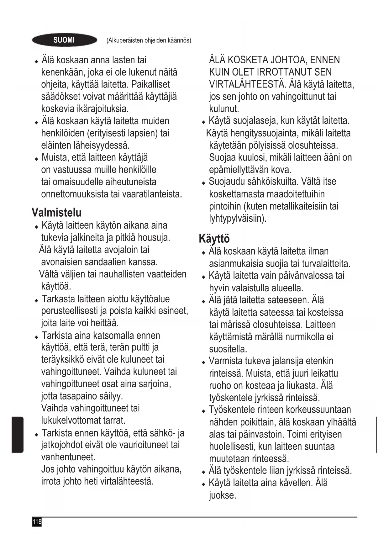 VIRTALÄHTEESTÄ. Älä käytä laitetta, jos sen johto on vahingoittunut tai kulunut. u Käytä suojalaseja, kun käytät laitetta. Käytä hengityssuojainta, mikäli laitetta käytetään pölyisissä olosuhteissa. Suojaa kuulosi, mikäli laitteen ääni on epämiellyttävän kova. u Suojaudu sähköiskuilta. Vältä itse koskettamasta maadoitettuihin pintoihin (kuten metallikaiteisiin tai lyhtypylväisiin). Käyttö u Älä koskaan käytä laitetta ilman asianmukaisia suojia tai turvalaitteita. u Käytä laitetta vain päivänvalossa tai hyvin valaistulla alueella. u Älä jätä laitetta sateeseen. Älä käytä laitetta sateessa tai kosteissa tai märissä olosuhteissa. Laitteen käyttämistä märällä nurmikolla ei suositella. u Varmista tukeva jalansija etenkin rinteissä. Muista, että juuri leikattu ruoho on kosteaa ja liukasta. Älä työskentele jyrkissä rinteissä. u Työskentele rinteen korkeussuuntaan nähden poikittain, älä koskaan ylhäältä alas tai päinvastoin. Toimi erityisen huolellisesti, kun laitteen suuntaa muutetaan rinteessä. u Älä työskentele liian jyrkissä rinteissä.u Käytä laitetta aina kävellen. Älä juokse.119 (Alkuperäisten ohjeiden käännös) SUOMI Älä vedä laitetta itseäsi kohti tai kävele takaperin laitetta käyttäessäsi. u Käynnistä laite ohjeiden mukaan. Varmista, että jalkasi ovat riittävän kaukana terästä. u Älä käynnistä laitetta, kun seisot poistoaukon edessä. u Älä kallista laitetta käynnistyksen yhteydessä, mikäli se ei ole tarpeen. Jos laitetta on kallistettava käynnistettäessä, kallista sitä mahdollisimman vähän. Nosta vain laitteen kauimpana käyttäjästä olevaa puolta. Varmista, että molemmat kätesi ovat käyttöasennossa ennen laitteen laskemista alas. u Sammuta laite ja odota, kunnes teräosan pyöriminen lakkaa, mikäli laitetta on kallistettava, kun sitä siirretään muilla alustoilla kuin ajettavalla nurmikolla. u Älä nosta tai kanna laitetta, ennen kuin terä on pysähtynyt kokonaan. u Pidä kädet ja jalat loitolla terästä. u Älä aseta käsiä tai jalkoja lähelle pyöriviä osia tai niiden alle. u Pysy loitolla laitteen poistoaukoista.u Sammuta laite, vedä pistoke irti pistorasiasta ja varmista, että laitteen liikkuvat osat ovat pysähtyneet, ennen kuin jätät laitteen ilman valvontaa, ja ennen sen osien vaihtamista, puhdistamista tai tarkistamista tai tukoksen poistamista. Kun ruohonleikkuri on osunut johonkin, tarkista laite vahinkojen varalta ja korjaa se, ennen kuin käynnistät sen ja käytät sitä uudelleen. u Jos laite tärisee epätavallisen voimakkaasti tai jos osut sillä esteeseen, sammuta laite ja vedä pistoke irti pistorasiasta. Tarkista laite vahinkojen varalta, vaihda tai korjaa vahingoittuneet osat ja kiristä mahdollisesti löystyneet osat. u Pidä verkkovirtajohto aina mahdollisimman kaukana terästä. Ota huomioon virtajohdon asento aina laitetta käytettäessä. u Moottori pyörii vielä muutaman sekunnin virran katkaisemisen jälkeen. Älä jarruta terän pysähtymisliikettä. Huolto ja varastointi u Tarkista ennen laitteen käyttöä, ettei laitteessa ole vahingoittuneita tai viallisia osia. Tarkista, että liikkuvat osat toimivat moitteettomasti eivätkä ole väärässä asennossa ja että työkalussa ei ole murtuneita tai vahingoittuneita suojia tai kytkimiä tai muita osia, jotka saattaisivat vaikuttaa haitallisesti laitteen toimintaan. Varmista, että laite toimii oikein. Laitetta ei tule käyttää, jos sen suoja tai kotelo on vaurioitunut tai poistettu. Älä käytä laitetta, jos jokin sen osa on vahingoittunut tai viallinen. Älä käytä laitetta, jota ei voida käynnistää ja pysäyttää virtakytkimestä. Korjauta tai vaihdata vaurioituneet tai vialliset osat valtuutetussa huoltoliikkeessä. u Tarkista virtajohdon kunto säännöllisesti.120 (Alkuperäisten ohjeiden käännös) SUOMI Jos virtajohto vahingoittuu, sen vaihtaminen tulee turvallisuussyistä jättää valtuutetun huoltoliikkeen tehtäväksi. Tarkista jatkojohtojen kunto säännöllisesti. Vaihda vaurioitunut sähköjohto heti. u Turvallisuussyistä tulee varmistaa, että kaikki laitteen mutterit, pultit ja ruuvit on kiristetty. u Tarkista keräyssäiliö kulumisen tai mahdollisten vaurioiden varalta ja vaihda se tarvittaessa. Älä koskaan käytä laitetta ilman keräyssäiliötä. u Varo laitetta säädettäessä, että sormesi eivät jää liikkuvien terien ja kiinteästi asennettujen osien väliin. u Muista teriä huollettaessa, että vaikka virtalähde on sammutettu, terät liikkuvat edelleen. u Kun laitetta ei käytetä, se on säilytettävä kuivassa paikassa. Pidä laite lasten ulottumattomissa. u Anna laitteen aina jäähtyä ennen varastointia. u Varmista, että laitteessa käytetään vain oikeanlaisia teriä. u Käytä ainoastaan BLACK+DECKERin suosittelemia varaosia ja lisävarusteita. Ruohonleikkurien lisäturvaohjeet u Käytä aina oikeanlaista jatkojohtoa, joka sopii tämän laitteen virransyöttöliitäntään (katso kohta Tekniset tiedot). Jatkojohdon on oltava ulkokäyttöön soveltuva ja siinä on oltava soveltuvuudesta ilmoittava merkintä. Laitteen kanssa voidaan käyttää enintään 30 m pitkää 1,5 mm2:n HO5VV-F-jatkojohtoa ilman tehon heikkenemistä. Tarkista jatkojohdon kunto ennen sen käyttämistä. Vahingoittunut tai viallinen kaapeli on vaihdettava. Jos käytät johtokelaa, kelaa johto aina kokonaan auki. u Konetta ei saa kuljettaa virran ollessa päällä. u Pidä ruohonleikkuria työntöaisasta tukevasti molemmin käsin käytön aikana. u Jos joudut käytön aikana kallistamaan ruohonleikkuria, pidä molemmat kädet koko ajan ajoasennossa. Pidä molemmat kädet ajoasennossa niin kauan, kunnes ruohonleikkuri on jälleen normaaliasennossa. u Älä käytä radiota tai kuulokkeita ruohonleikkurin käytön aikana. u Älä koskaan säädä pyörien korkeutta moottorin käydessä tai turva-avaimen ollessa paikallaan kytkentäkotelossa. u Jos ruohonl