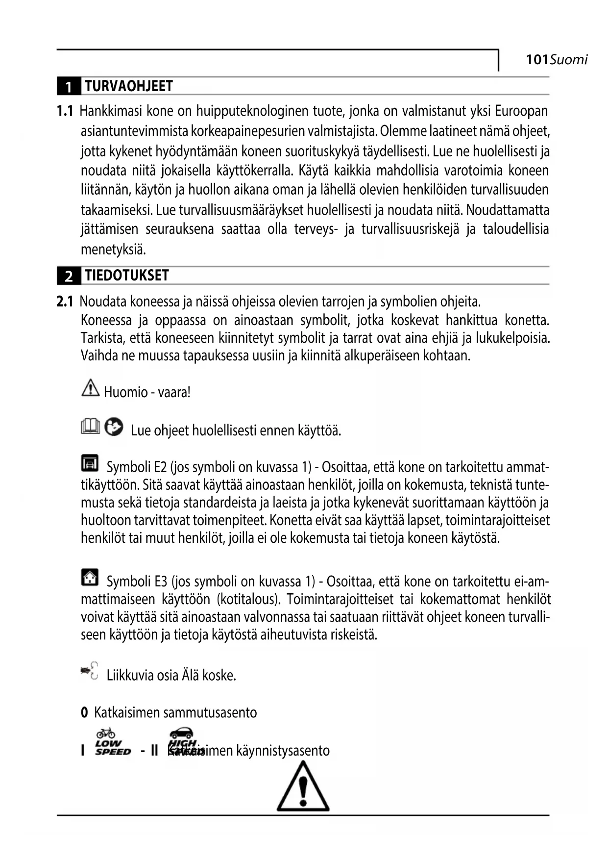 Koneessa ja oppaassa on ainoastaan symbolit, jotka koskevat hankittua konetta. Tarkista, että koneeseen kiinnitetyt symbolit ja tarrat ovat aina ehjiä ja lukukelpoisia. Vaihda ne muussa tapauksessa uusiin ja kiinnitä alkuperäiseen kohtaan. Huomio - vaara! Lue ohjeet huolellisesti ennen käyttöä. Symboli E2 (jos symboli on kuvassa 1) - Osoittaa, että kone on tarkoitettu ammat- tikäyttöön. Sitä saavat käyttää ainoastaan henkilöt, joilla on kokemusta, teknistä tunte- musta sekä tietoja standardeista ja laeista ja jotka kykenevät suorittamaan käyttöön ja huoltoon tarvittavat toimenpiteet. Konetta eivät saa käyttää lapset, toimintarajoitteiset henkilöt tai muut henkilöt, joilla ei ole kokemusta tai tietoja koneen käytöstä. Symboli E3 (jos symboli on kuvassa 1) - Osoittaa, että kone on tarkoitettu ei-am- mattimaiseen käyttöön (kotitalous). Toimintarajoitteiset tai kokemattomat henkilöt voivat käyttää sitä ainoastaan valvonnassa tai saatuaan riittävät ohjeet koneen turvalli