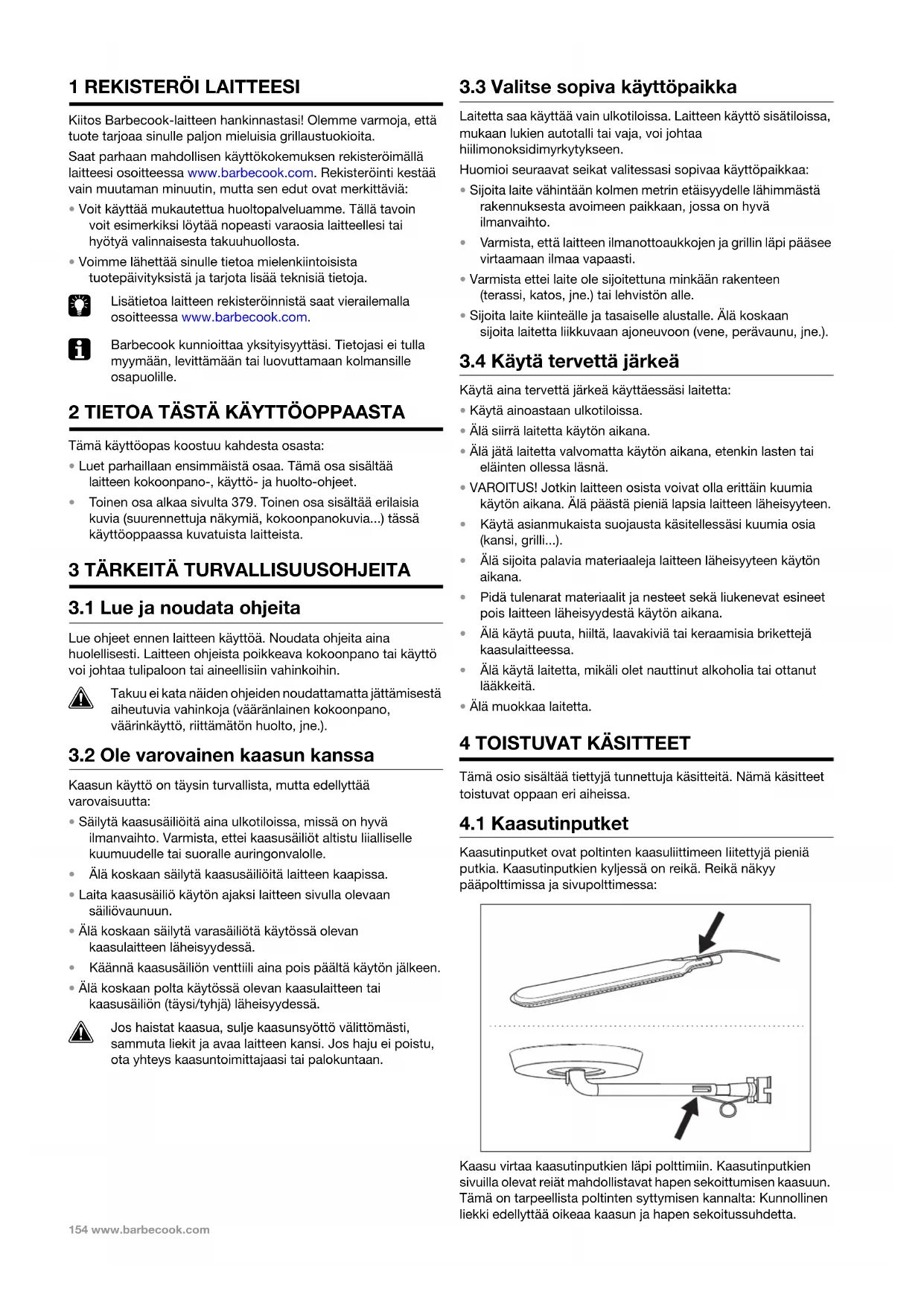 Kaasutinputket ovat poltinten kaasuliittimeen liitettyjä pieniä putkia. Kaasutinputkien kyljessä on reikä. Reikä näkyy pääpolttimissa ja sivupolttimessa: Kaasu virtaa kaasutinputkien läpi polttimiin. Kaasutinputkien sivuilla olevat reiät mahdollistavat hapen sekoittumisen kaasuun. Tämä on tarpeellista poltinten syttymisen kannalta: Kunnollinen liekki edellyttää oikeaa kaasun ja hapen sekoitussuhdetta. MAN_GAS_QUISSON_BBC_140730_A.book Page 154 Tuesday, February 2, 2016 4:55 PMwww.barbecook.com 155