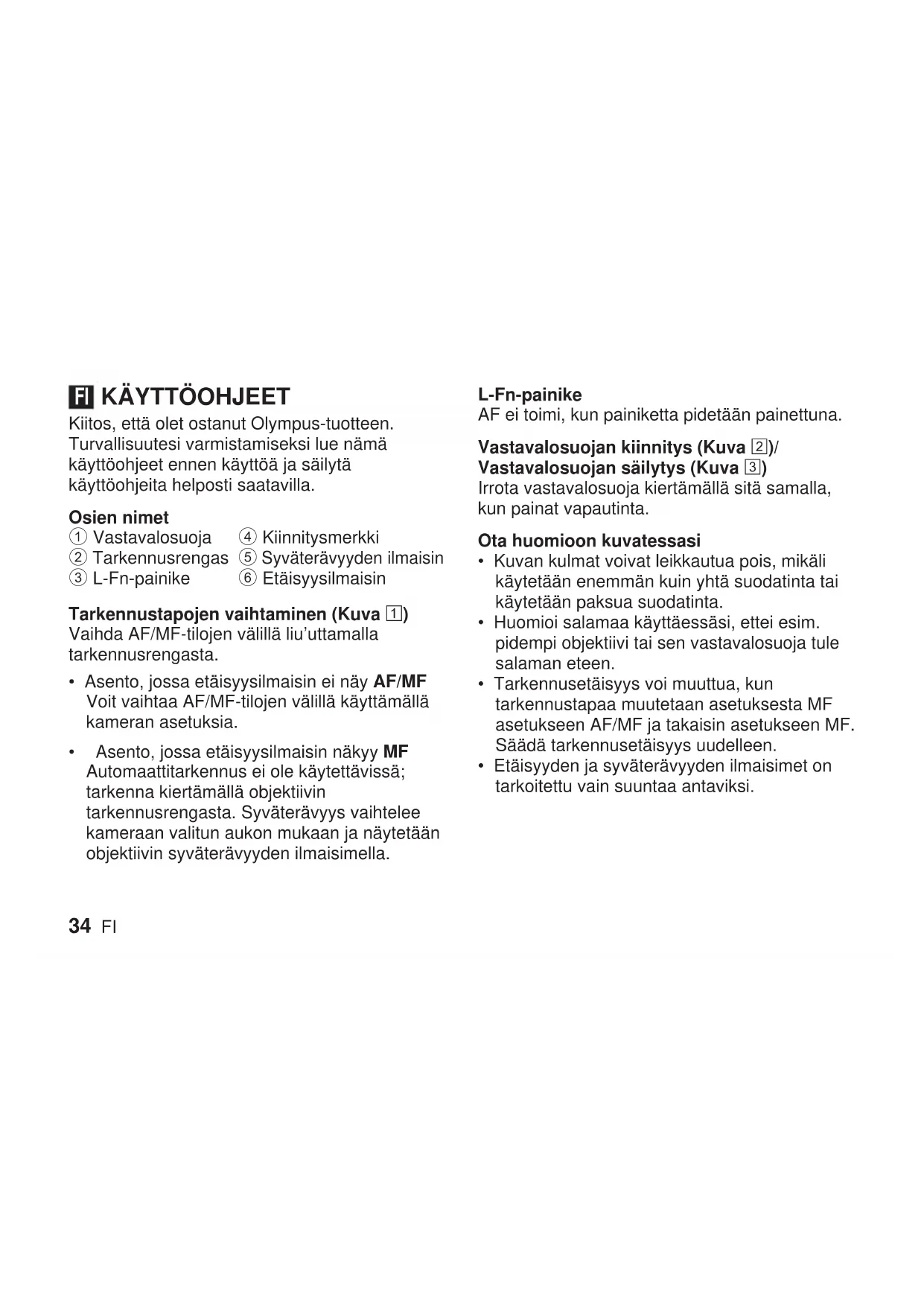 Kiitos, että olet ostanut Olympus-tuotteen. Turvallisuutesi varmistamiseksi lue nämä käyttöohjeet ennen käyttöä ja säilytä käyttöohjeita helposti saatavilla. Osien nimet 1 Vastavalosuoja 2 Tarkennusrengas 3 L-Fn-painike 4 Kiinnitysmerkki