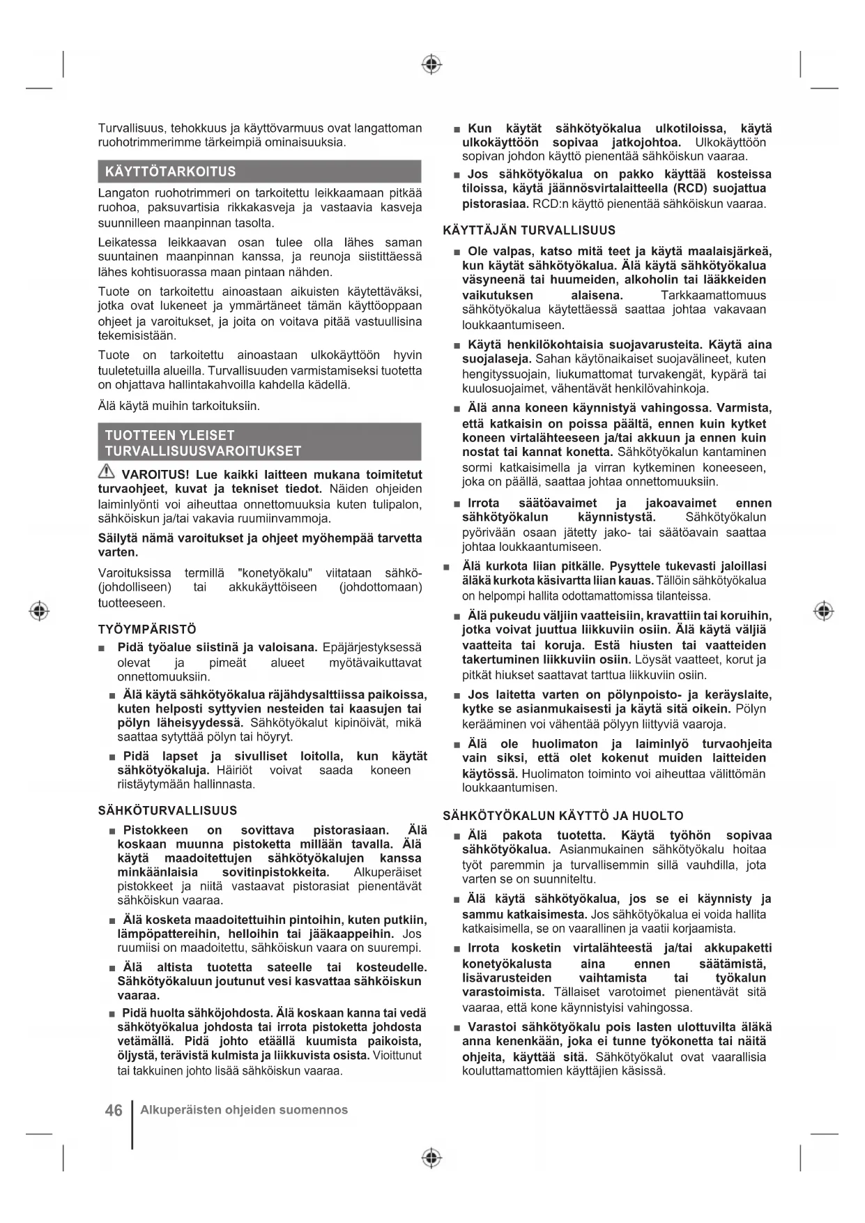 Langaton ruohotrimmeri on tarkoitettu leikkaamaan pitkää ruohoa, paksuvartisia rikkakasveja ja vastaavia kasveja suunnilleen maanpinnan tasolta. Leikatessa leikkaavan osan tulee olla lähes saman suuntainen maanpinnan kanssa, ja reunoja siistittäessä lähes kohtisuorassa maan pintaan nähden. Tuote on tarkoitettu ainoastaan aikuisten käytettäväksi, jotka ovat lukeneet ja ymmärtäneet tämän käyttöoppaan ohjeet ja varoitukset, ja joita on voitava pitää vastuullisina tekemisistään. Tuote on tarkoitettu ainoastaan ulkokäyttöön hyvin tuuletetuilla alueilla. Turvallisuuden varmistamiseksi tuotetta on ohjattava hallintakahvoilla kahdella kädellä. Älä käytä muihin tarkoituksiin. TUOTTEEN YLEISET TURVALLISUUSVAROITUKSET VAROITUS! Lue kaikki laitteen mukana toimitetut turvaohjeet, kuvat ja tekniset tiedot. Näiden ohjeiden laiminlyönti voi aiheuttaa onnettomuuksia kuten tulipalon, sähköiskun ja/tai vakavia ruumiinvammoja. Säilytä nämä varoitukset ja ohjeet myöhempää tarvetta varten. Varoituksissa termillä "konetyökalu" viitataan sähkö- (johdolliseen) tai akkukäyttöiseen (johdottomaan) tuotteeseen.