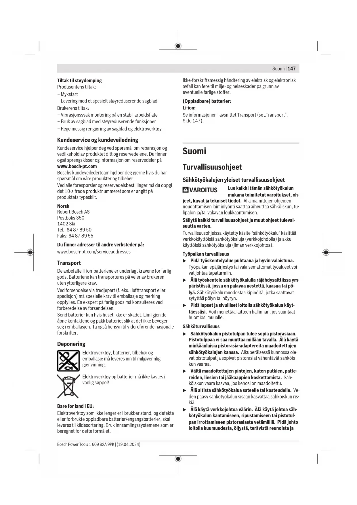 Samanpituisten työkappaleiden helppoa sahausta varten voit käyttää vasenta tai oikeaa pituusohjainta (36). – Käännä pituusohjainta (36) ylöspäin. – Säädä sahapöydän pidennysosa (23) halutun työkappa- leen pituiseksi. Erikoismalliset työkappaleet Kun sahaat kaarevia tai pyöreitä työkappaleita, niiden paikal- taan siirtyminen on estettävä erityisen huolellisesti.Sahaus- linjan kohdalla ei saa olla rakoa työkappaleen, ohjainkiskon ja sahapöydän välillä. Tarvittaessa on valmistettava tehtävään räätälöityjä pidik- keitä. Kulutuslevyjen vaihtaminen (katso kuva S) Kulutuslevyt (14) kuluvat sähkötyökalun käytön myötä. Vaihda vialliset kulutuslevyt. – Aseta sähkötyökalu käyttöasentoon. – Irrota ruuvit (54) tavallisella ristipääruuvitaltalla ja ota vanha kulutuslevy (14) pois. – Asenna uusi kulutuslevy ja kiristä ruuvit (54). Laserin säätö Huomautus: lasertoiminnon testaamiseksi sähkötyökalu on kytkettävä virtalähteeseen. u Älä missään tapauksessa paina käynnistyskytkintä, kun säädät laseria (esimerkiksi sahausvartta liikut- taessasi). Loukkaantumisvaara, jos sähkötyökalu käyn- nistyy tahattomasti. – Aseta sähkötyökalu käyttöasentoon. – Käännä sahapöytää (12) 0°-loveen (20) asti. Vivun (17) tulee lukkiutua kunnolla loveen. Raskaan käytön jälkeen lasersäteet tulee tarkastaa ja tarvit- taessa säätää uudelleen tarkkojen sahaustulosten varmista- miseksi. Siihen tarvitaan kokemusta ja asianmukaista erikoistyökalua. Valtuutetut Bosch-huoltopisteet suorittavat nämä tehtävät nopeasti ja luotettavasti. Tarkistus (katso kuva T1) – Piirrä työkappaleeseen suora merkkiviiva. – Ohjaa sahausvartta kahvan(7) avulla hitaasti alaspäin. – Suuntaa työkappale niin, että sahanterän hampaat ovat merkkiviivan kohdalla. – Pidä työkappaletta tässä asennossa ja ohjaa sahausvarsi hitaasti takaisin yläasentoon. – Kiinnitä työkappale. – Sytytä lasersäteet kytkimellä (6). Älä paina tässä yhtey- dessä käynnistyssalpaa (5). Vasemman ja oikean lasersäteen tulee olla koko matkalla sa- malla etäisyydellä työkappaleen merkkiviivasta, myös ohja- tessasi sahausvartta alaspäin. Lasersuojuksen irrottaminen (katso kuva T2) – Avaa lasersuojuksen (8) kaksi ruuvia (55) kuusiokoloavai- mella/ruuvitaltalla (43) ja ota lasersuojus pois. Sahausvarren liikkeestä aiheutuvan sivupoikkeaman säätäminen (katso kuvat T3−T4) – Löysää kiinnitysruuvia (56) (n. 1–2kierrosta). Älä kierrä ruuvia kokonaan ulos. – Siirrä laserin koteloa (57) oikealle tai vasemmalle, kunnes lasersäteet eivät enää poikkea sivusuunnassa sahausvar- ren laskuliikkeen yhteydessä. – Pidä laserin koteloa (57) paikallaan tässä asennossa ja ki- ristä kiinnitysruuvi (56). – Kiinnitä lasersuojus (8) takaisin paikalleen. Perusasetusten tarkistus ja säätö Raskaan käytön jälkeen sähkötyökalun perusasetukset täy- tyy tarkastaa ja tarvittaessa säätää tarkkojen sahaustulosten varmistamiseksi. Siihen tarvitaan kokemusta ja asianmukaista erikoistyökalua. Valtuutetut Bosch-huoltopisteet suorittavat nämä tehtävät nopeasti ja luotettavasti. Kulmaosoittimen (vaakasuuntainen) kohdistaminen (katso kuva U) – Aseta sähkötyökalu käyttöasentoon. – Käännä sahapöytää (12) 0°-loveen (20) asti. Vivun (17) täytyy napsahtaa tuntuvasti kiinni loveen. Tarkistus Kulmaosoittimen (58) täytyy olla kohdakkain asteikon (21) 0°-merkin kanssa. Säätäminen – Löysää ruuvia (59) ristipääruuvitaltalla ja kohdista kul- maosoitin 0°-merkkiin. – Kiristä ruuvi. Pystysuuntaisen kulman osoittimen kohdistaminen (katso kuva V) – Aseta sähkötyökalu käyttöasentoon. – Avaa lukituspyörä (45). – Vedä lukitusvipua (46) ulospäin ja säädä sahausvarrella pystysuuntainen 0°:n jiirikulma. – Vapauta lukitusvipu (46). Lukitusvivun tulee lukittua tun- tuvasti paikalleen – Kiristä lukituspyörä (45). Tarkistus Kulmaosoittimen (28) täytyy olla kohdakkain asteikon (27) 0°-merkin kanssa. Säätäminen – Löysää ruuvia (60) ristipääruuvitaltalla ja kohdista kul- maosoitin 0°-merkkiin. – Kiristä ruuvi. Sähkötyökalun kuljettaminen (katso kuva W) u Ota akku pois sähkötyökalusta, ennen kuin teet säh- kötyökaluun liittyviä töitä (esim. huolto, käyttötarvik- 1 609 92A 9PK | (19.04.2024) Bosch Power ToolsSuomi | 159 keen vaihto jne.). Käynnistyskytkimen tahaton painallus aiheuttaa loukkaantumisvaaran. Seuraavat toimenpiteet on suoritettava ennen sähkötyöka- lun kuljetusta: – Avaa lukitusruuvi(1), jos se on kiinni. Vedä sahausvarsi eteenpäin ääriasentoon ja kiristä lukitusruuvi. – Varmista, että syvyydenrajoitin (39) on käännetty koko- naan taaksepäin ja ettei säätöruuvi (38) kosketa mihin- kään, kun liikutat sahausvartta. – Aseta sähkötyökalu kuljetusasentoon. – Poista kaikki lisätarvikkeet, joita ei voi kiinnittää kunnolla sähkötyökaluun. Kuljeta käyttämättömiä sahanteriä mie- luiten suljetussa kotelossa. – Aseta kuljetuskahva (3) pystysuoraan asentoon. – Kanna sähkötyökalua kuljetuskahvan(3) avulla tai saha- pöydän kylkien kädensijoista(61). u Käytä sähkötyökalun kuljetukseen vain kuljetusvarus- teita. Älä missään tapauksessa kanna sitä suojuksien tai työkappaletukien varassa. Hoito ja huolto Huolto ja puhdistus u Ota akku pois sähkötyökalusta, ennen kuin teet säh- kötyökaluun liittyviä töitä (esim. huolto, käyttötarvik- keen vaihto jne.). Käynnistyskytkimen tahaton painallus aiheuttaa loukkaantumisvaaran. u Pidä sähkötyökalu ja tuuletusaukot puhtaina luotetta- van ja turvallisen työskentelyn varmistamiseksi. Heilurisuojuksen täytyy aina liikkua esteettömästi ja sulkeu- tua automaattisesti. Pidä siksi heilurisuojuksen ympäristö aina puhtaana. Poista jokaisen työkerran jälkeen pöly ja purut paineilmalla tai siveltimellä. Puhdista liukurulla (11) säännöllisin väliajoin. Toimenpiteet me