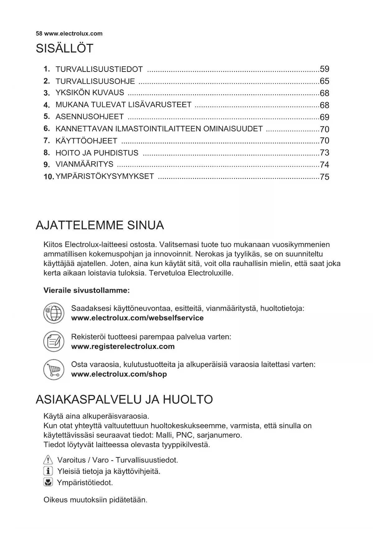 Kiitos Electrolux-laitteesi ostosta. Valitsemasi tuote tuo mukanaan vuosikymmenien ammatillisen kokemuspohjan ja innovoinnit. Nerokas ja tyylikäs, se on suunniteltu käyttäjää ajatellen. Joten, aina kun käytät sitä, voit olla rauhallisin mielin, että saat joka kerta aikaan loistavia tuloksia. Tervetuloa Electroluxille. Käytä aina alkuperäisvaraosia. Kun otat yhteyttä valtuutettuun huoltokeskukseemme, varmista, että sinulla on käytettävissäsi seuraavat tiedot: Malli, PNC, sarjanumero. Tiedot löytyvät laitteessa olevasta tyyppikilvestä. Vieraile sivustollamme: Saadaksesi käyttöneuvontaa, esitteitä, vianmääritystä, huoltotietoja: www.electrolux.com/webselfservice Rekisteröi tuotteesi parempaa palvelua varten: www.registerelectrolux.com Osta varaosia, kulutustuotteita ja alkuperäisiä varaosia laitettasi varten: www.electrolux.com/shop