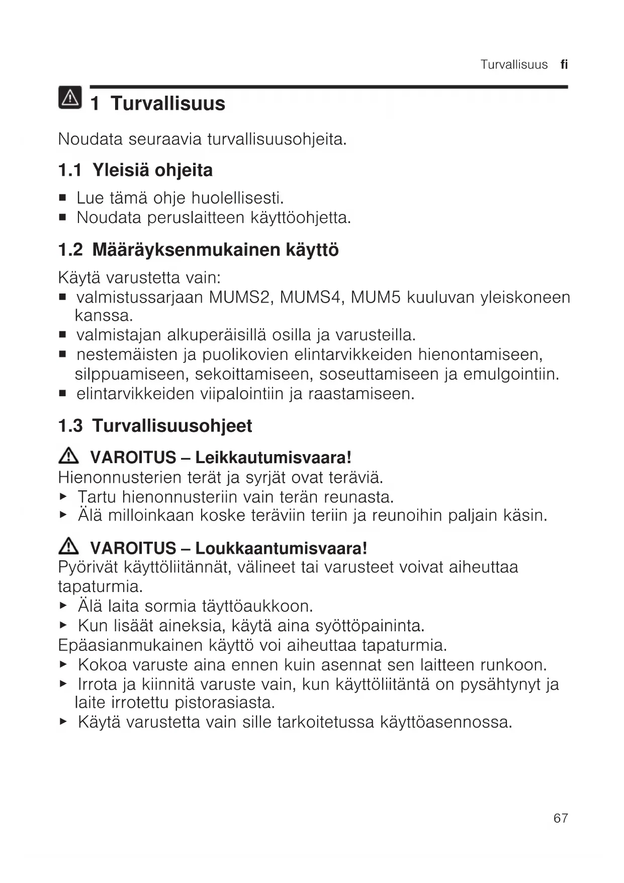1 Turvallisuus Noudata seuraavia turvallisuusohjeita. 1.1 Yleisiä ohjeita ¡ Lue tämä ohje huolellisesti. ¡ Noudata peruslaitteen käyttöohjetta. 1.2 Määräyksenmukainen käyttö Käytä varustetta vain: ¡ valmistussarjaan MUMS2, MUMS4, MUM5 kuuluvan yleiskoneen kanssa. ¡ valmistajan alkuperäisillä osilla ja varusteilla. ¡ nestemäisten ja puolikovien elintarvikkeiden hienontamiseen, silppuamiseen, sekoittamiseen, soseuttamiseen ja emulgointiin. ¡ elintarvikkeiden viipalointiin ja raastamiseen. 1.3 Turvallisuusohjeet VAROITUS‒Leikkautumisvaara! Hienonnusterien terät ja syrjät ovat teräviä. ▶ Tartu hienonnusteriin vain terän reunasta. ▶ Älä milloinkaan koske teräviin teriin ja reunoihin paljain käsin. VAROITUS‒Loukkaantumisvaara! Pyörivät käyttöliitännät, välineet tai varusteet voivat aiheuttaa tapaturmia. ▶ Älä laita sormia täyttöaukkoon. ▶ Kun lisäät aineksia, käytä aina syöttöpaininta. Epäasianmukainen käyttö voi aiheuttaa tapaturmia. ▶ Kokoa varuste aina ennen kuin asennat sen laitteen runkoon. ▶ Irrota ja kiinnitä varuste vain, kun käyttöliitäntä on pysähtynyt ja laite irrotettu pistorasiasta. ▶ Käytä varustetta vain sille tarkoitetussa käyttöasennossa.fi Esinevahinkojen välttäminen