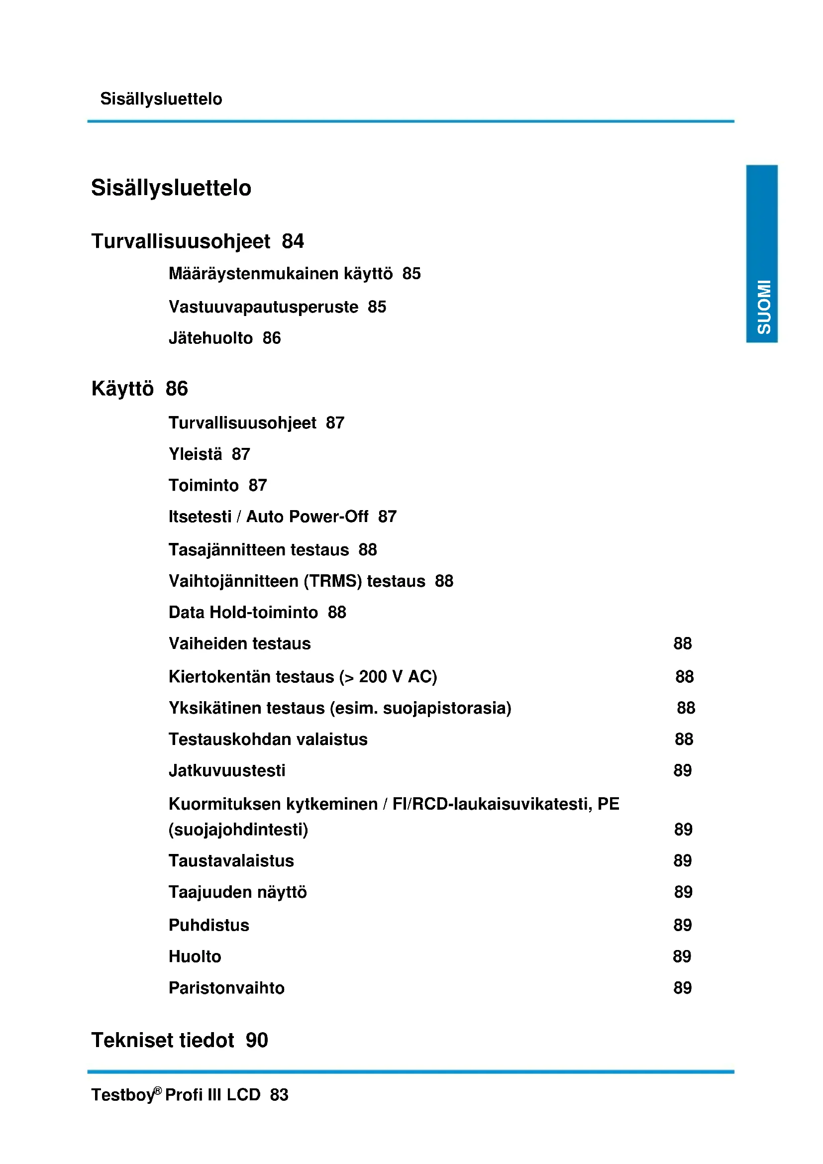 Profi III LCD 83 SUOMI SUOMI Sisällysluettelo Turvallisuusohjeet 84 Määräystenmukainen käyttö 85 Vastuuvapautusperuste 85 Jätehuolto 86 Käyttö 86 Turvallisuusohjeet 87 Yleistä 87 Toiminto 87 Itsetesti / Auto Power-Off 87 Tasajännitteen testaus 88 Vaihtojännitteen (TRMS) testaus 88 Data Hold-toiminto 88 Vaiheiden testaus 88 Kiertokentän testaus (> 200 V AC) 88 Yksikätinen testaus (esim. suojapistorasia) 88 Testauskohdan valaistus 88 Jatkuvuustesti 89 Kuormituksen kytkeminen / FI/RCD-laukaisuvikatesti, PE (suojajohdintesti) 89 Taustavalaistus 89 Taajuuden näyttö 89 Puhdistus 89 Huolto 89 Paristonvaihto 89 Tekniset tiedot 90Turvallisuusohjeet 84 Testboy