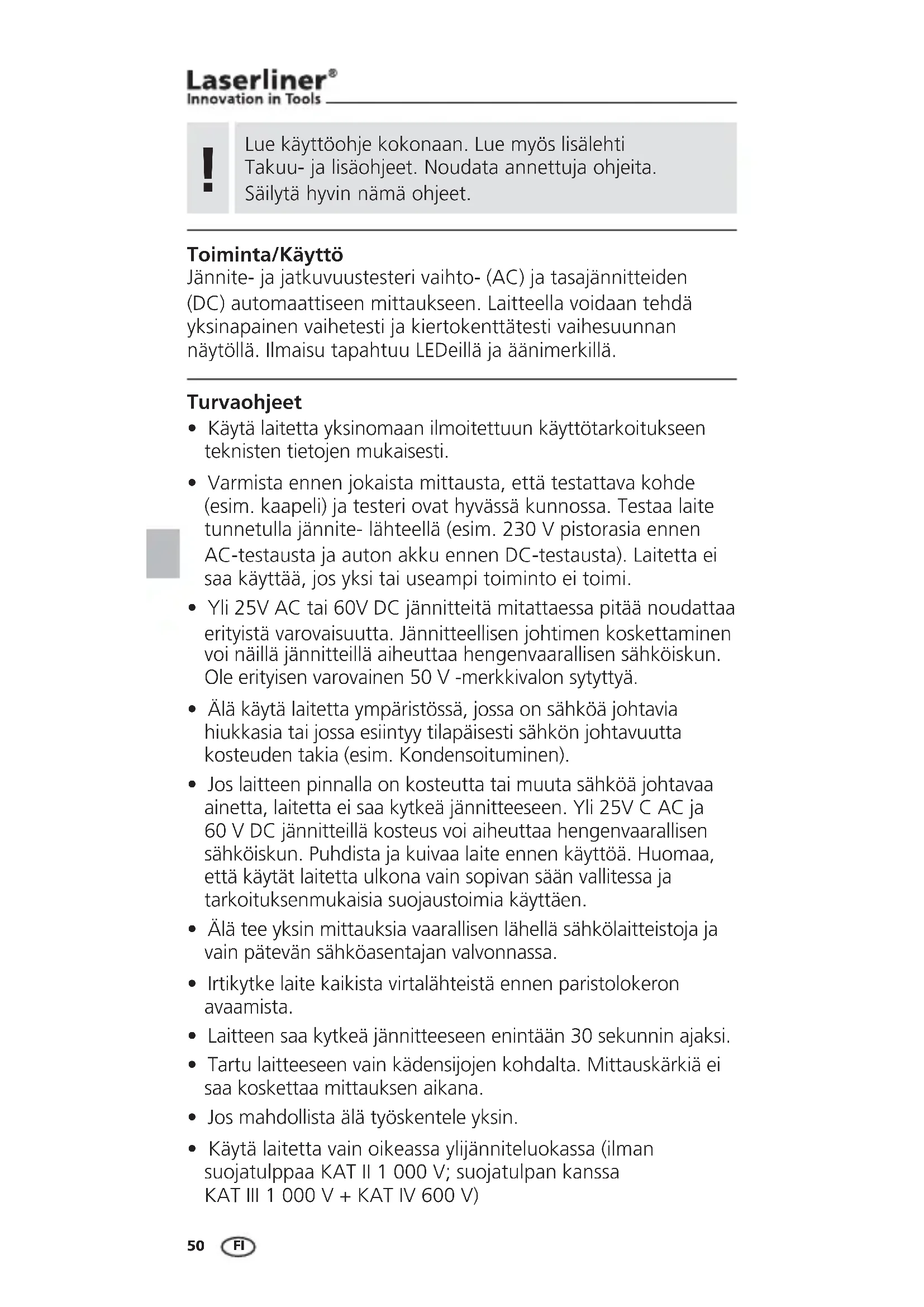 YNRÙNMJŅ " 3(((5" 3(55 2SNOHDšY@AQTCYDMH@ 2 2SNOHDšNBGQNMX (/ Masa 230 g Normy badawcze $-$- PL50 Turvaohjeet l*«XS«K@HSDSS@XJRHMNL@@MHKLNHSDSSTTMJ«XSS¼S@QJNHSTJRDDM teknisten tietojen mukaisesti. lVarmista ennen jokaista mittausta, että testattava kohde (esim. kaapeli) ja testeri ovat hyvässä kunnossa. Testaa laite tunnetulla jännite- lähteellä (esim. 230 V pistorasia ennen AC-testausta ja auton akku ennen DC-testausta). Laitetta ei saa käyttää, jos yksi tai useampi toiminto ei toimi. l8KH5 "S@H5#"I«MMHSSDHS«LHS@SS@DRR@OHS««MNTC@SS@@ erityistä varovaisuutta. Jännitteellisen johtimen koskettaminen UNHM«HKK«I«MMHSSDHKK«@HGDTSS@@GDMFDMU@@Q@KKHRDMR«GJ¼HRJTM