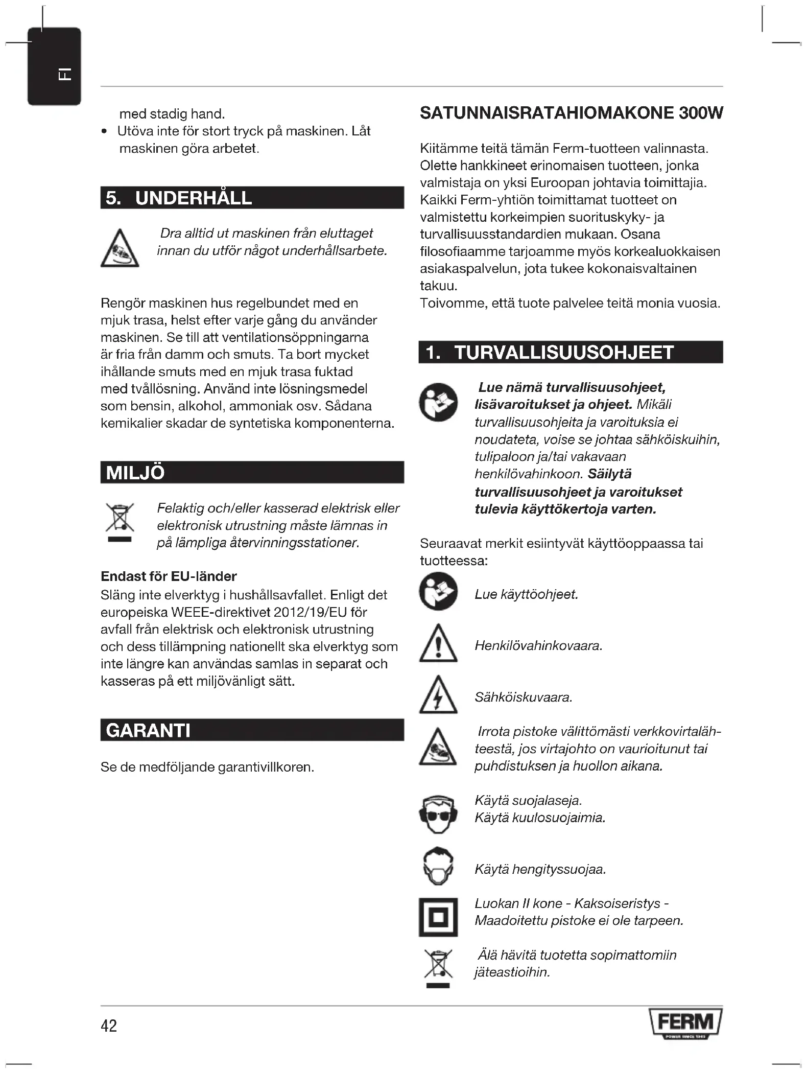 Lue nämä turvallisuusohjeet, lisävaroitukset ja ohjeet. Mikäli turvallisuusohjeita ja varoituksia ei noudateta, voise se johtaa sähköiskuihin, tulipaloon ja/tai vakavaan henkilövahinkoon. Säilytä turvallisuusohjeet ja varoitukset tulevia käyttökertoja varten. Seuraavat merkit esiintyvät käyttöoppaassa tai tuotteessa: Lue käyttöohjeet. Henkilövahinkovaara. Sähköiskuvaara. Irrota pistoke välittömästi verkkovirtaläh- teestä, jos virtajohto on vaurioitunut tai puhdistuksen ja huollon aikana. Käytä suojalaseja. Käytä kuulosuojaimia. Käytä hengityssuojaa. Luokan II kone - Kaksoiseristys - Maadoitettu pistoke ei ole tarpeen. Älä hävitä tuotetta sopimattomiin jäteastioihin.43