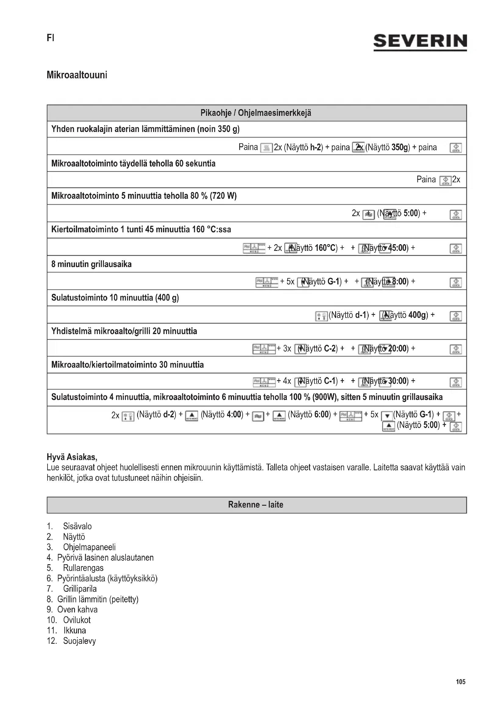(Näyttö d-2) + (Näyttö 4:00) + + (Näyttö 6:00) + + 5x (Näyttö G-1) + + (Näyttö 5:00) + Hyvä Asiakas, Lue seuraavat ohjeet huolellisesti ennen mikrouunin käyttämistä. Talleta ohjeet vastaisen varalle. Laitetta saavat käyttää vain henkilöt, jotka ovat tutustuneet näihin ohjeisiin. Rakenne – laite