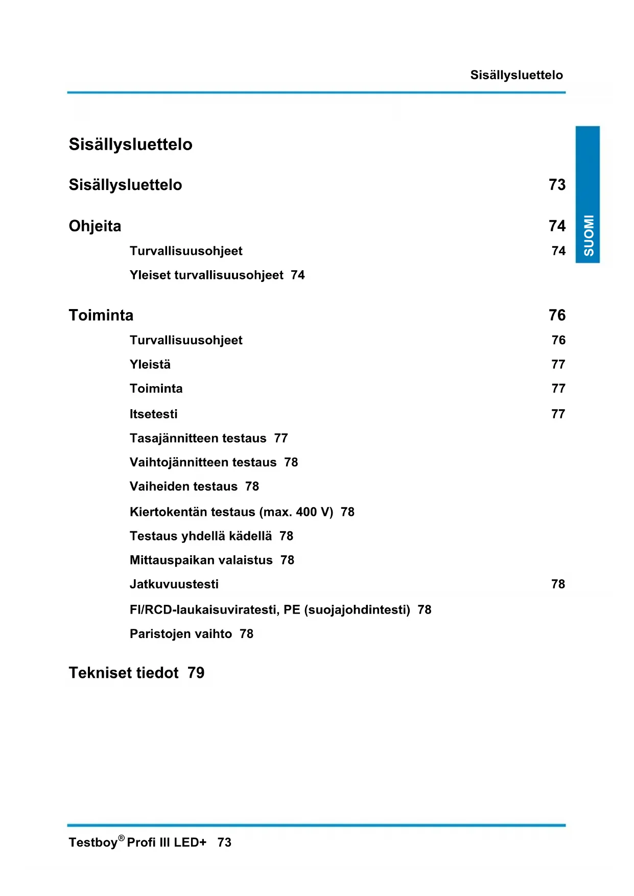 Profi III LED+ 73 SUOMI Sisällysluettelo Sisällysluettelo 73 Ohjeita 74 Turvallisuusohjeet 74 Yleiset turvallisuusohjeet 74 Toiminta 76 Turvallisuusohjeet 76 Yleistä 77 Toiminta 77 Itsetesti 77 Tasajännitteen testaus 77 Vaihtojännitteen testaus 78 Vaiheiden testaus 78 Kiertokentän testaus (max. 400 V) 78 Testaus yhdellä kädellä 78 Mittauspaikan valaistus 78 Jatkuvuustesti 78 FI/RCD-laukaisuviratesti, PE (suojajohdintesti) 78 Paristojen vaihto 78 Tekniset tiedot 79Ohjeita 74 Testboy