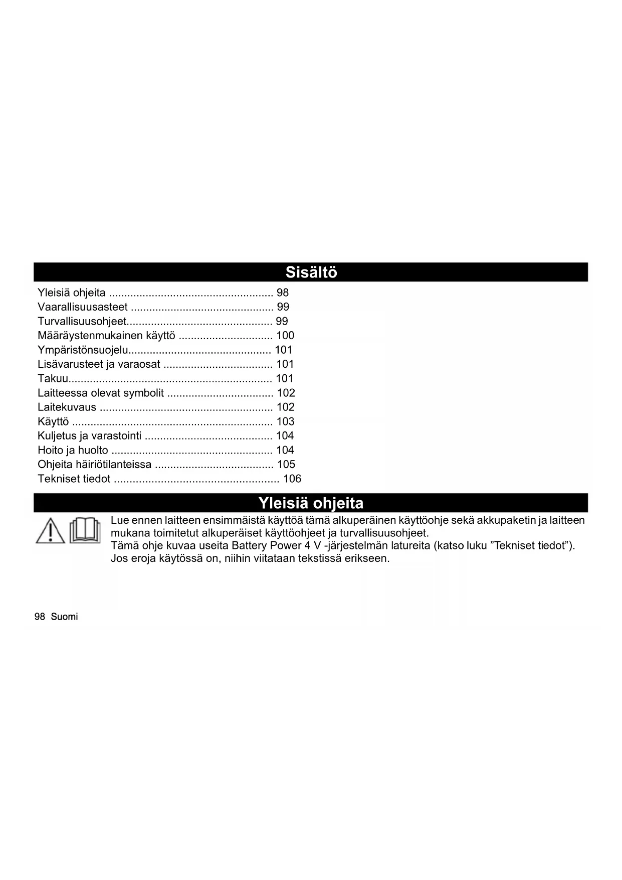- Tekniset tiedot Suomi 99 Vaarallisuusasteet VAARA ● Huomautus välittömästi uhkaavasta vaarasta, joka voi aiheuttaa vakavan ruumiinvamman tai johtaa kuolemaan. 몇 VAROITUS ● Huomautus mahdollisesta vaarallisesta tilanteesta, joka voi aiheuttaa vakavan ruumiinvamman tai voi johtaa kuolemaan. 몇 VARO ● Huomautus mahdollisesta vaarallisesta tilanteesta, joka voi aiheuttaa vähäisiä vammoja. HUOMIO ● Huomautus mahdollisesta vaarallisesta tilanteesta, joka voi aiheuttaa aineellisia vahinkoja. Turvallisuusohjeet VAARA ● Räjähdysvaara. Älä lataa paristoja, jotka eivät ole uudelleen ladattavia. ● Käytä laturia vain hy- väksyttyjen akkupakettien lataamiseen. ● Tarkasta laturi, latauspaikka ja pistokeverkko-osa aina ennen käyttöä vaurioiden varalta. Älä käytä vaurioituneita laitteita. Vaihda vaurioitunut laite uuteen. ● Tarkasta liitäntäjohto ennen jokaista käyttöä vaurioiden varalta. Älä käytä laitteita, joissa on vaurioitunut liitäntäjohto. Jos vaurioita on, ota yh- teyttä KÄRCHER-yhtiöön tai johonkin huoltokumppaniimme. ● Älä lataa vaurioituneita tai puutteellisesti toimivia akkupaketteja. Hävitä vaurioituneet tai käyttökelvottomat akkupaketit välittömästi noudattaen voimassa olevia kul- jetus- ja hävittämismääräyksiä. ● Älä käytä laturia räjähdysvaarallisessa ympäristössä tai syttyvien esineiden lä- hellä. ● Älä upota laitetta veteen tai pidä sitä vesisuihkun alla. ● Älä lataa akkupakettia ilman valvontaa. Tarkista akkupaketin ja laturin tila säännöllisesti latauksen aikana. ● Jos havaitset vian, epätavallisia hajuja tai kuumentu- mista latauksen aikana, irrota laturi verkkovirrasta ja akkupaketti laturista. Hävitä akkupaketti ja laturi välittömästi noudattaen voimassa olevia kuljetus- ja hävittämismääräyksiä.100 Suomi 몇 VAROITUS ● Tarkasta, että verkkojännite vastaa laturin tyyppikilvessä lukevaa jännitettä. ● Suojaa liitän- täjohto ja pistokeverkko-osa kuumuudelta, teräviltä reunoilta, öljyltä ja liikkuvilta laiteosilta. ● Älä avaa laturia. Vain ammattilaiset saavat tehdä korjauksia. ● Irrota pistokeverkko-osa pistorasiasta ennen kuin puhdistat laturin tai suo- ritat käyttäjähuollon. ● Henkilöt, joilla on vajavaiset ruumiilliset, aistilliset tai henkiset ominaisuudet tai puutteita ko- kemuksessa ja tietämyksessä, saavat käyttää tätä laitetta vain siinä tapauksessa, että he ovat oikein valvonnan alaisia tai ovat saaneet opastuksen heidän turvallisuudestaan vastaavan henkilön toimesta laitteen turvalliseen käyttämiseen ja ovat ymmärtäneet sen käyttöön liittyvät vaarat. ● Lapset eivät saa leikkiä laitteella. ● Valvo lapsia sen varmistamiseksi, että he eivät leiki laitteella. ● Vähintään 8-vuotiaat lapset saavat käyttää laitetta, jos heidän turvallisuudestaan vastaava henkilö on antanut heille opastuksen laitteen käyttämiseen, tai jos he ovat oikein val- vonnan alaisia ja ovat ymmärtäneet käytöstä aiheutuvat vaarat. ● Lapset saavat suorittaa puhdistusta ja käyttäjä- huoltoa vain valvonnan alaisina. 몇 VARO ● Älä käytä laitetta muiden laitteiden kanssa jatkojohdoissa, joissa on useita pistorasioita. ● Älä pois- ta pistokeverkko-osaa pistorasiasta liitäntäjohdosta vetämällä. ● Älä käytä laturia, kun se on kostea tai likainen. ● Älä työnnä akkupakettia laturin latauspaikkaan kosteana tai likaisena. ● Älä käytä laturia pölyisessä ympäristös- sä. HUOMIO ● Oikosulun vaara. Suojaa latauskoskettimet metalliosilta. ● Älä peitä laturia käytön aikana. ● Älä kanna laturia liitäntäjohdosta. ● Käytä laturia vain kuivissa sisätiloissa, joissa on alhainen ilmankosteus. Määräystenmukainen käyttö 몇 VARO Räjähdysvaara! Räjähtävän akkupaketin aiheuttamat loukkaantumiset ja vauriot. Älä lataa viallisia tai puutteellisesti toimivia akkupaketteja. Muutokset, joita valmistaja ei ole hyväksynyt, on kielletty. Kaikki muu käyttö on kielletty. Käyttäjä vastaa vaaratilanteista, jotka johtuvat kielletystä käytöstä. Lataa vain KÄRCHER Battery Power/Battery Power + -järjestelmän akkupaketteja.Suomi 101 Huomautus Soveltuvat akkupaketit on merkitty symbolilla BP 4 V. Jännitetiedot sijaitsevat laitteessa, akkupaketissa ja niiden tyyppikilvissä. Ympäristönsuojelu Pakkausmateriaalit ovat kierrätettäviä. Hävitä pakkaukset ympäristöystävällisesti. Sähkö- ja elektroniikkalaitteet sisältävät arvokkaita kierrätettäviä materiaaleja tai rakenneosia kuten paristo- ja, akkuja tai öljyjä, jotka väärin käsiteltyinä tai väärin hävitettyinä voivat aiheuttaa mahdollisia vaaroja ihmis- ten terveydelle ja ympäristölle. Nämä rakenneosat ovat kuitenkin välttämättömiä laitteen asianmukaista käyttöä varten. Tällä symbolilla merkittyjä laitteita ei saa hävittää tavallisena talousjätteenä. Sisältöaineita koskevia ohjeita (REACH) Päivitettyjä tietoja sisältöaineista löytyy osoitteesta: www.kaercher.com/REACH Lisävarusteet ja varaosat Käytä vain alkuperäisiä lisävarusteita ja alkuperäisiä varaosia, sillä ne varmistavat laitteen turvallisen ja häiriöttö- män käytön. Tietoja lisävarusteista ja varaosista löytyy osoitteesta www.kaercher.com. Takuu Jokaisessa maassa ovat voimassa vastaavan myyntiyhtiön julkaisemat takuuehdot. Korjaamme laitteessa mah- dollisesti ilmenevät häiriöt takuuajan kuluessa maksutta, jos häiriöiden syynä ovat olleet materiaali- tai valmistus- virheet. Takuutapauksessa pyydämme ottamaan yhteyttä ostotositteen kanssa jälleenmyyjään tai lähimpään valtuutettuun asiakaspalveluun. (Osoite, katso takasivu)102 Suomi Laitteessa olevat symbolit Latauslaitteessa olevat symbolit Laitekuvaus Kuva A 1 Verkkopistoke 2 Liitäntäkaapeli 3 Laturi 4 Latauspaikka 5 Latauskoskettimet 6 Lataustason ilmaisin (LED-näyttö) Huomautus Laturissa on latauspaikka vakiolataustoiminnolla. Suojaa laite k