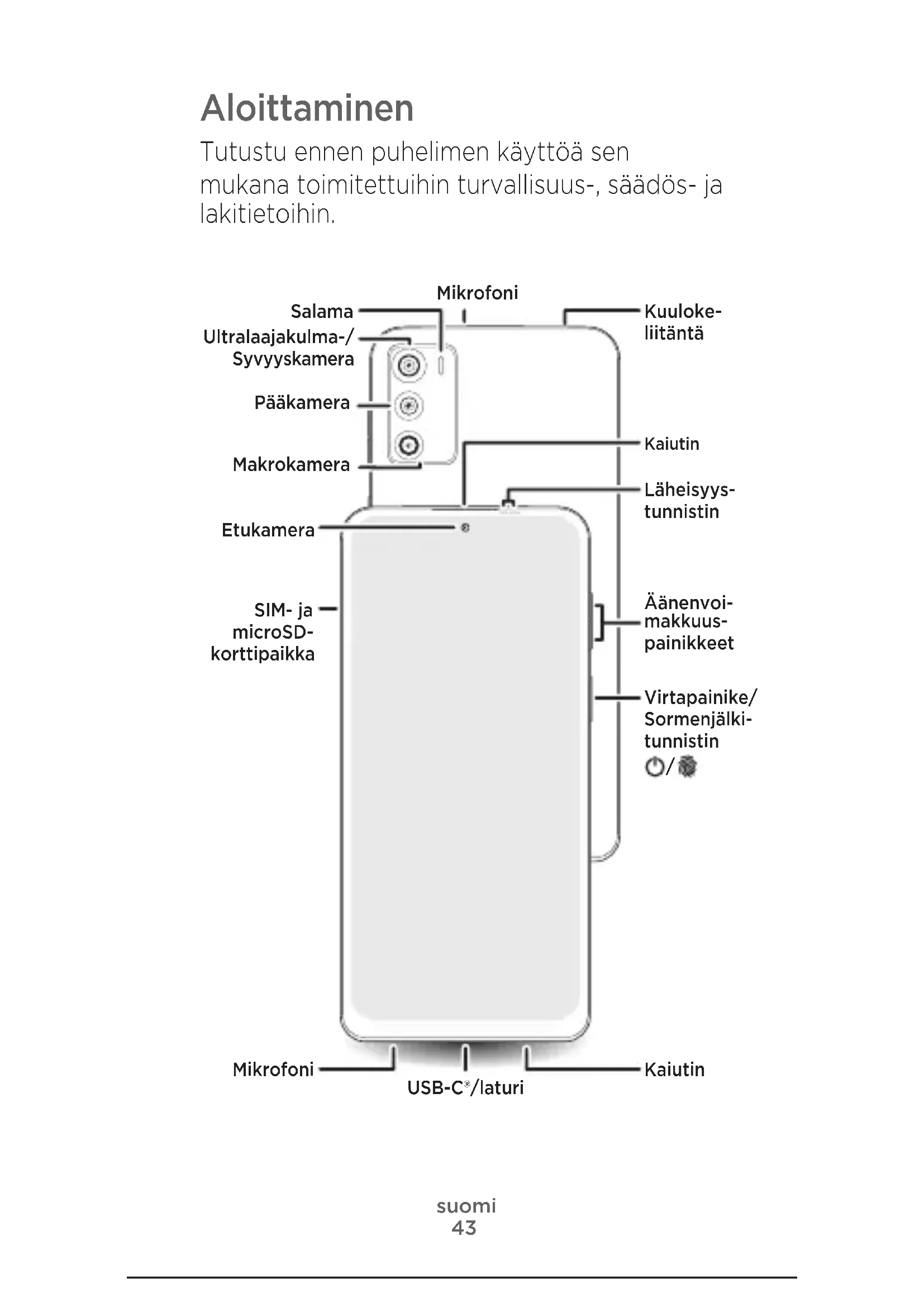 Mikrofoni Kaiutin Pääkamera Ultralaajakulma-/ Syvyyskamera Salama Makrokamera suomi44 SIM- ja muistikorttien asentaminen ja virran kytkeminen Nano-SIM 1 Irrota SIM- korttilokero SIM-kortin irrotustyökalulla. Käytä oikeankokoista SIM-korttia äläkä leikkaa sitä. SIM SIM1 SIM2 Yhden SIM-kortin malli Kahden SIM-kortin malli 2 Aseta SIM-kortti tai -kortit pidikkeeseen kullanväriset liittimet alaspäin ja työnnä pidike varovasti korttipaikkaan. Saat lisää tallennustilaa asettamalla microSD-kortin (valinnainen, myydään erikseen). 3 Pidä virtapainiketta alhaalla ja aloita noudattamalla kehotteiden ohjeita.45 Ohjeita ja lisätietoja Katso vastaukset, päivitykset ja tiedot: